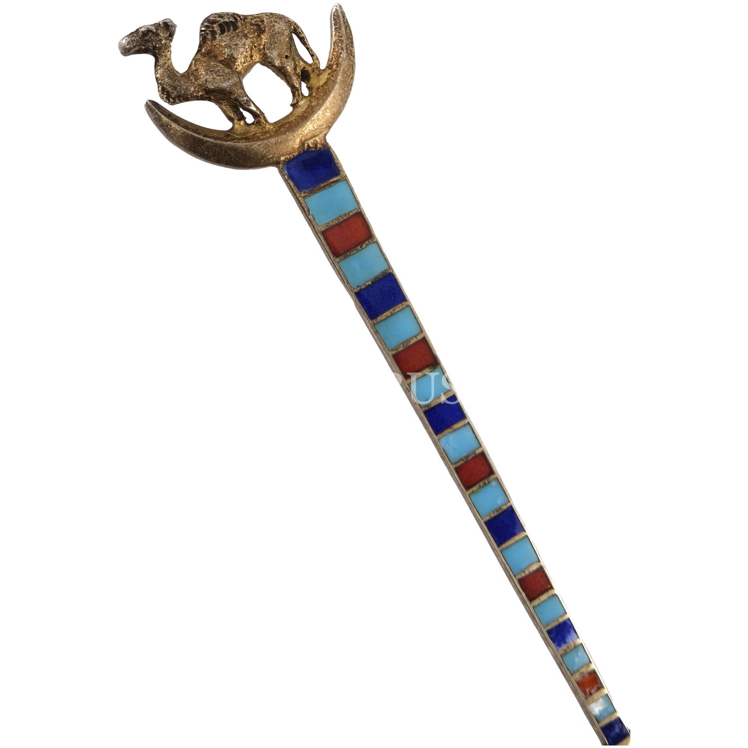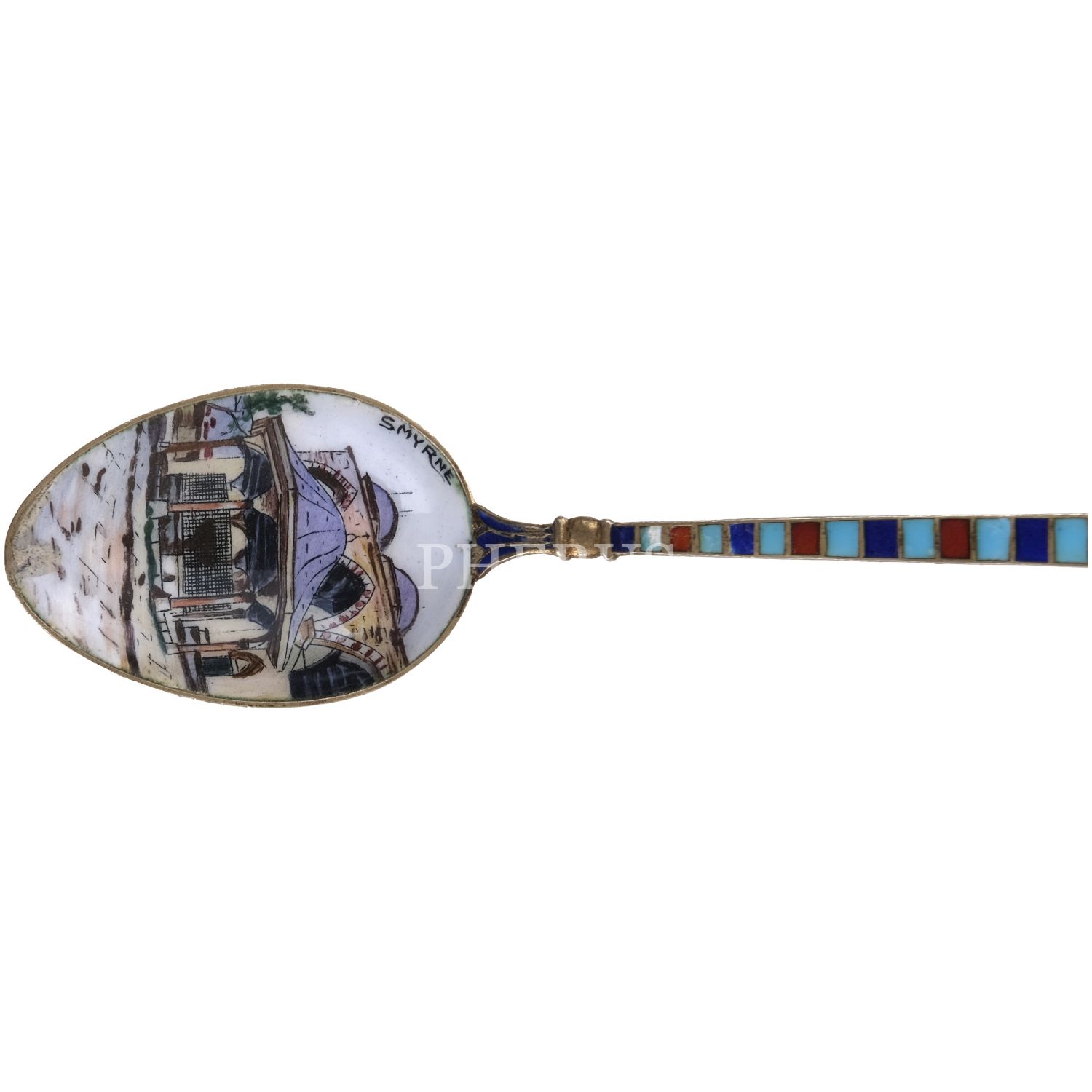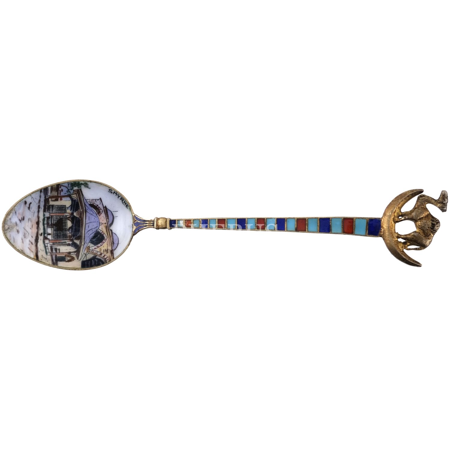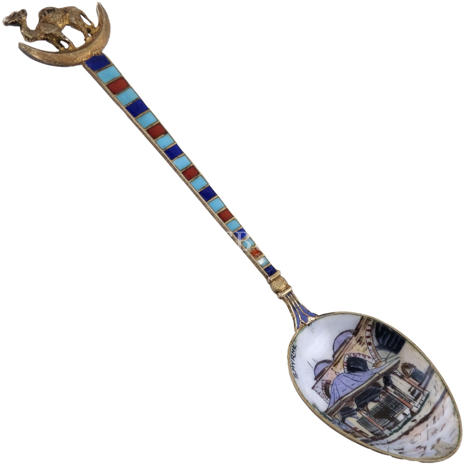 Merkezi İzmir´de bir cami görselli ve "Smyrne" başlıklı, sapı hilal ve deve motifli mineli kaşık, 12 cm...
