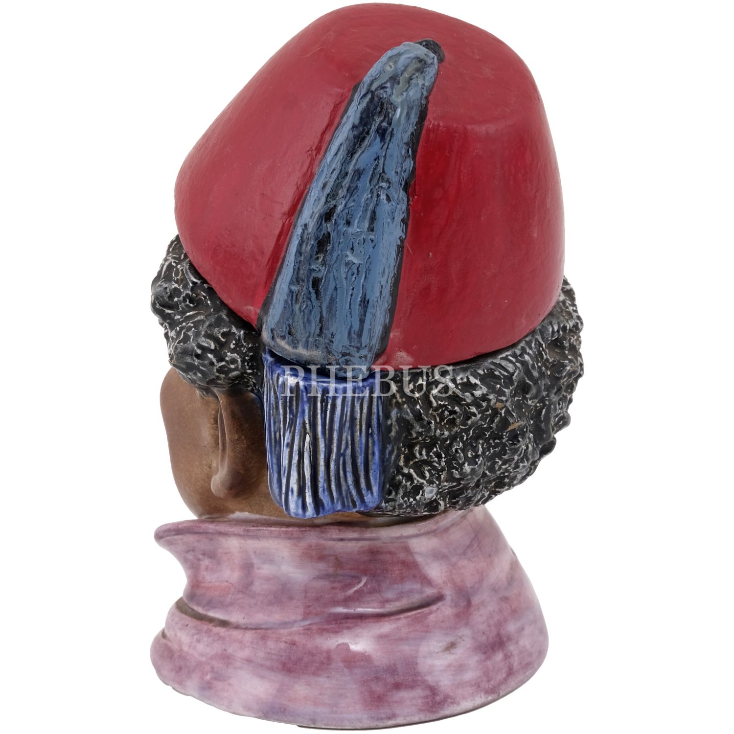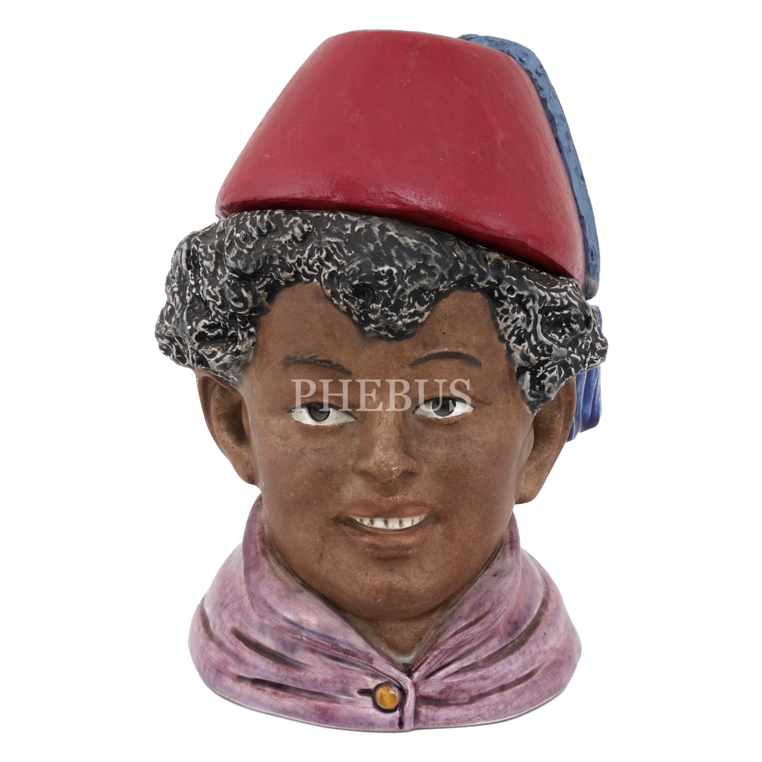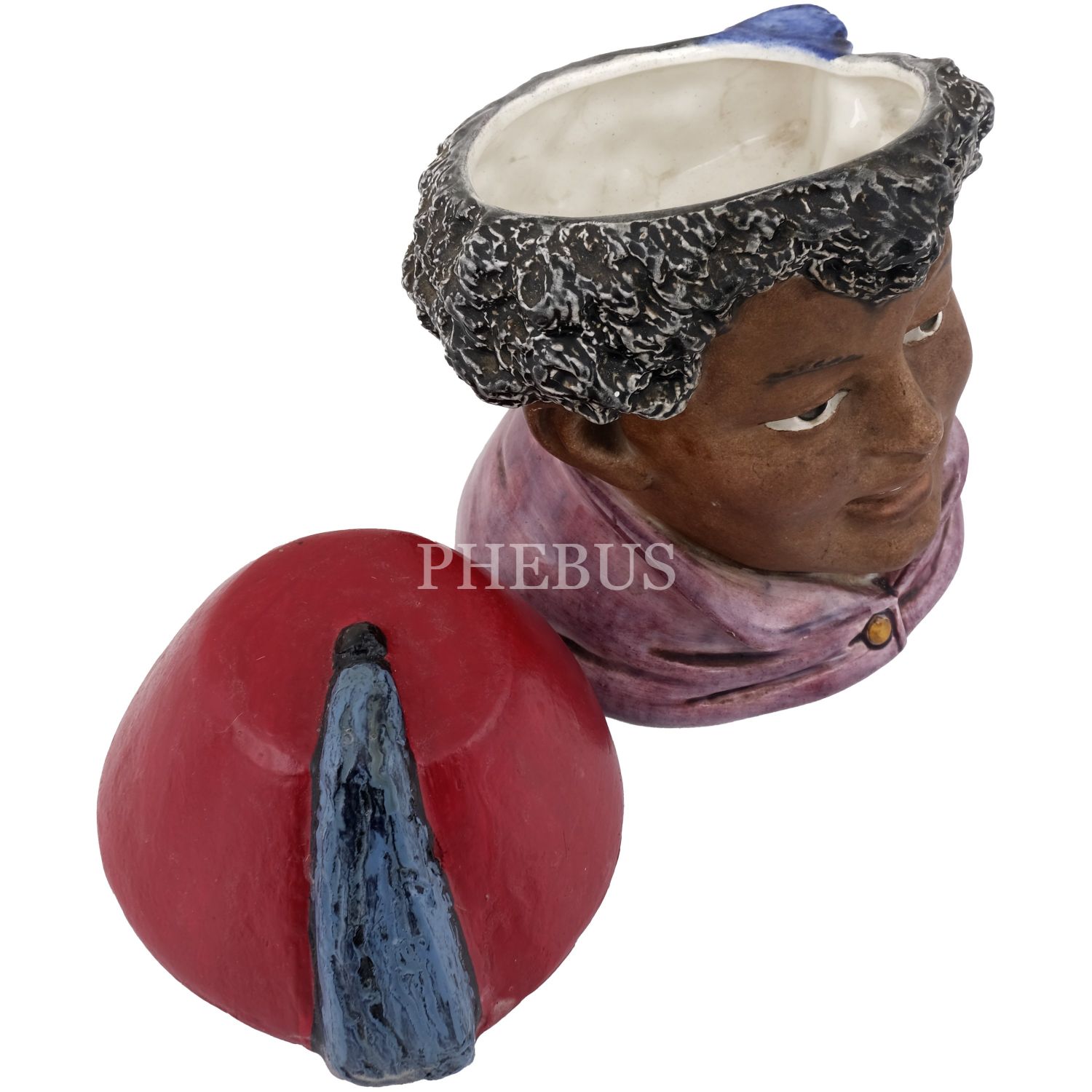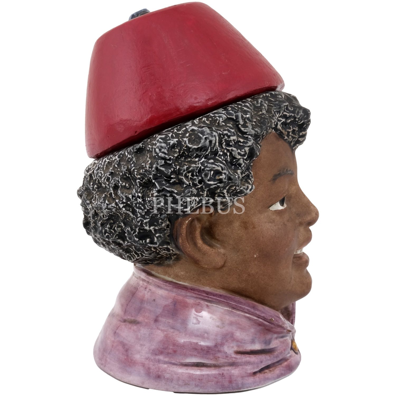 Fesli bir oryantal figür başı formunda seramik tütünlük, elle renklendirilmiş, 14x9,5x9 cm...
