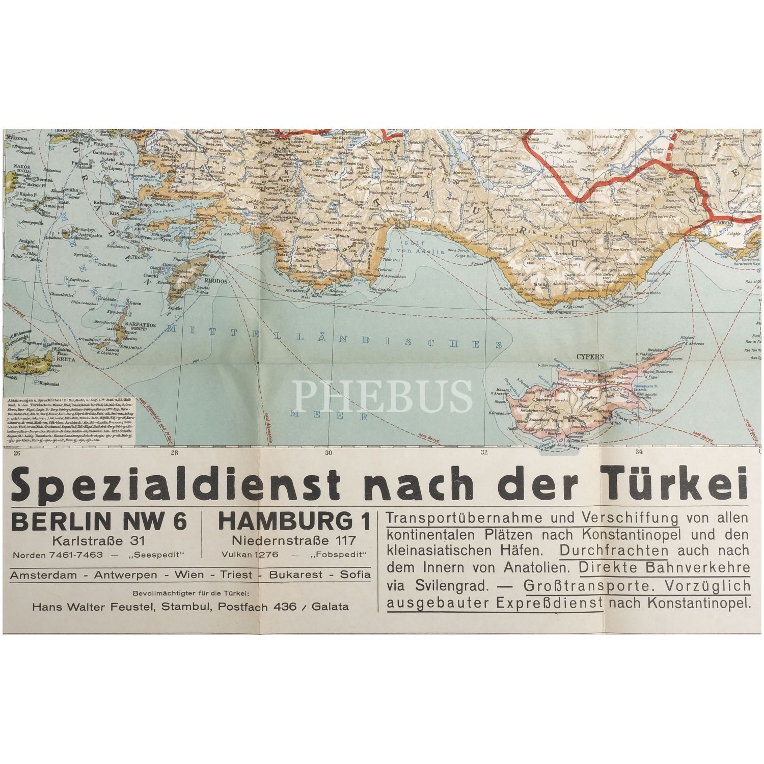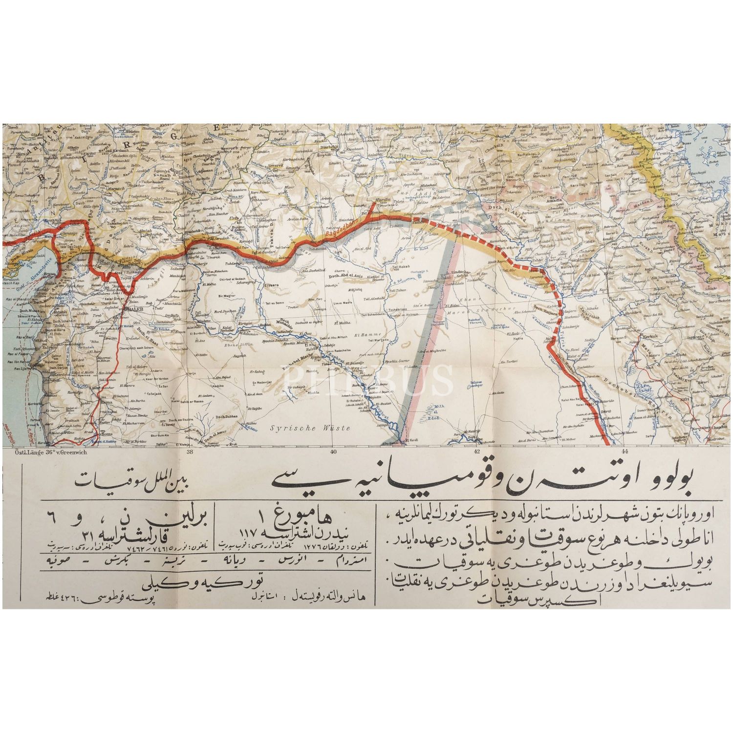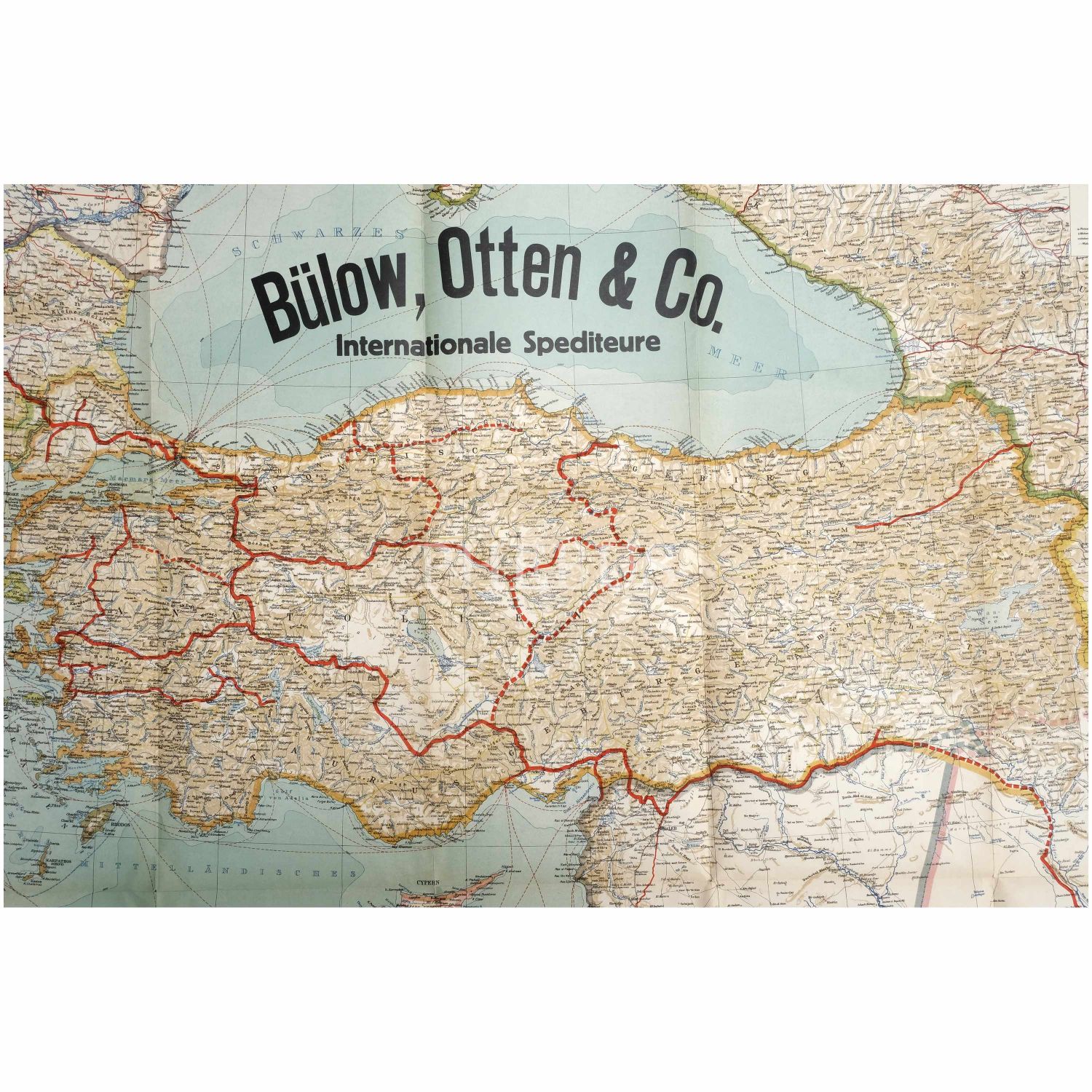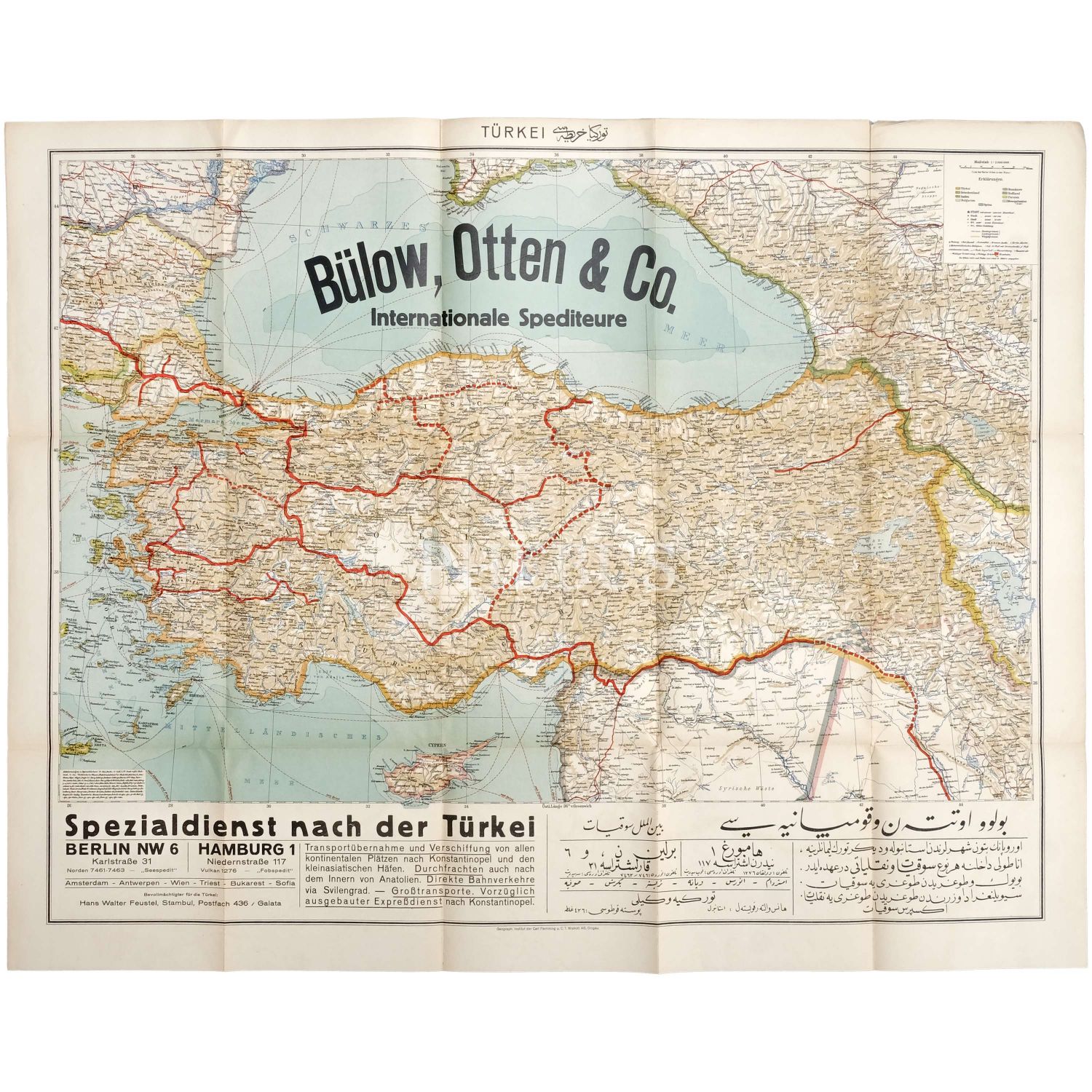 Türkiye´de faaliyet gösteren "Bülow, Otten & Co." nakliyat firmasının, Türkiye´deki sevkiyat ağını gösterir Almanca ve Osmanlıca harita, 100x80 cm..