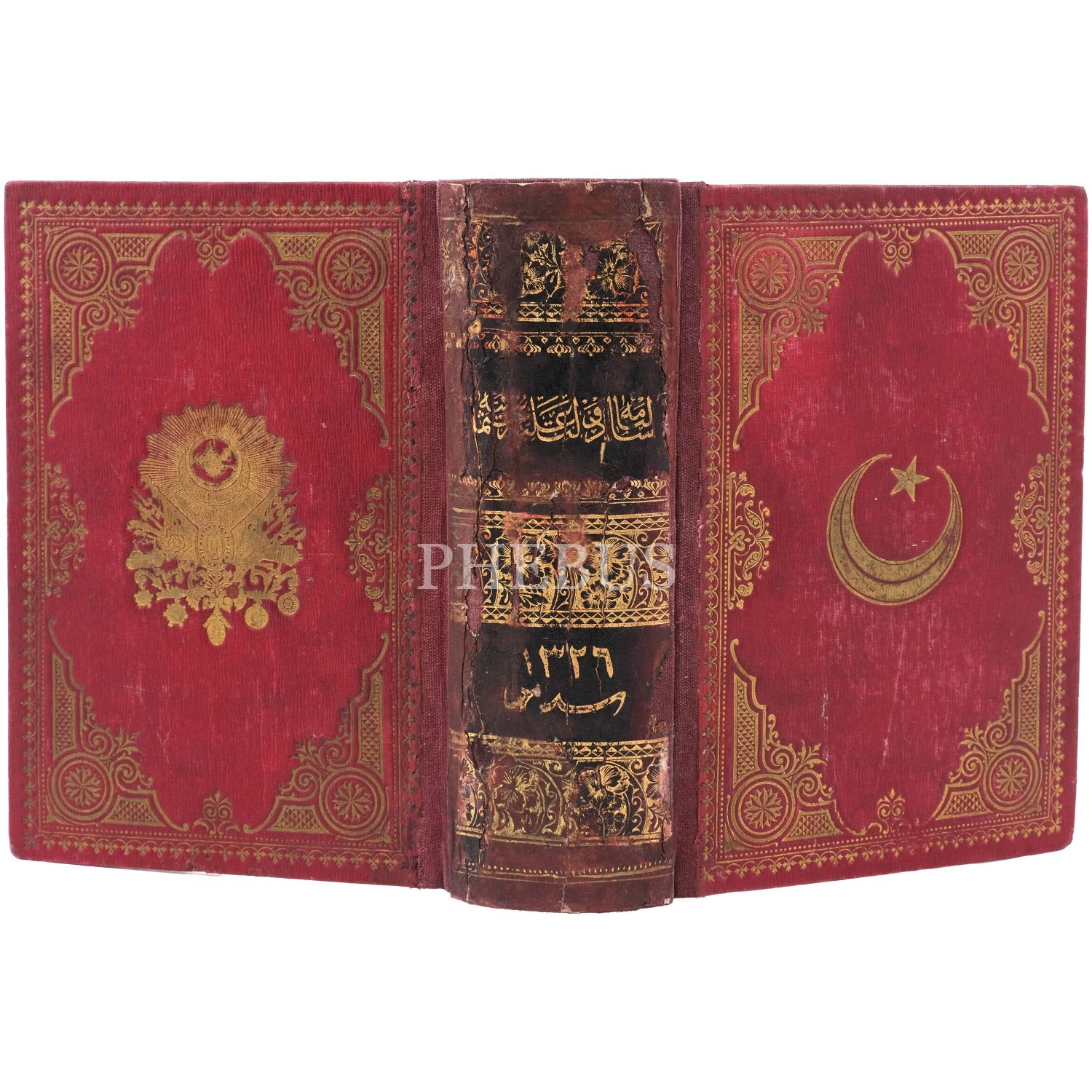 Osmanlı Devlet armalı ve hilal ile yıldız desenleriyle süslenmiş, altın yaldızlı sayfa kenarlı cildinde.
