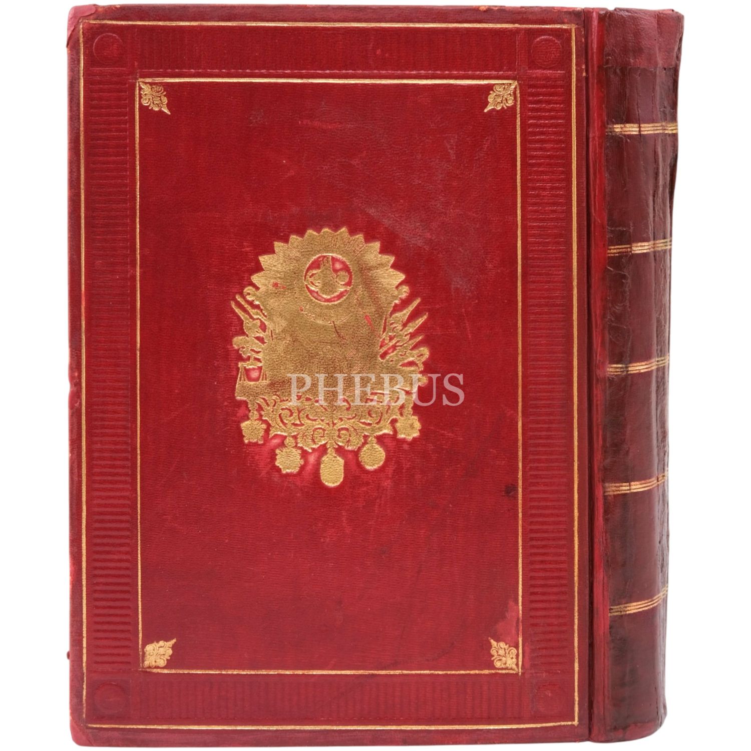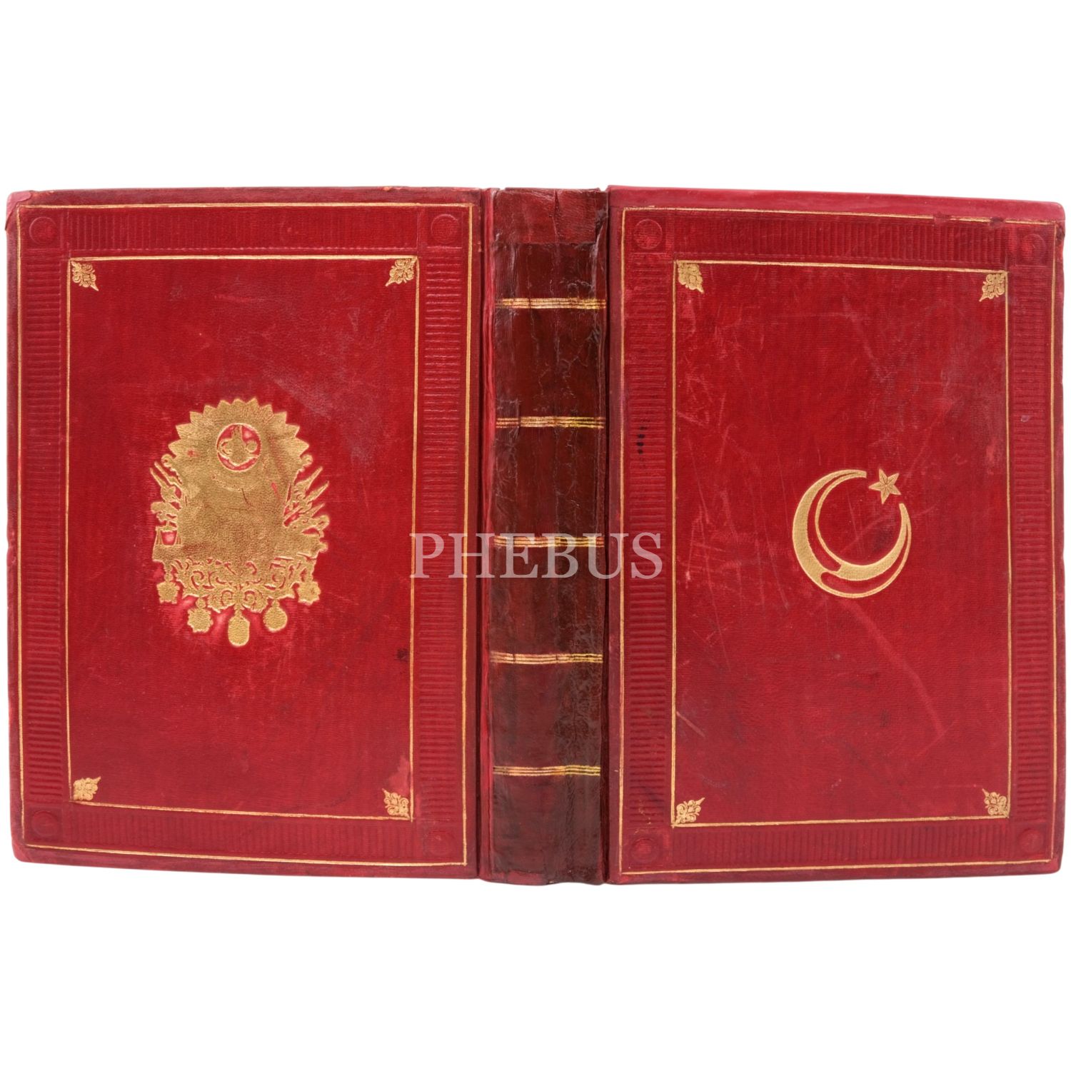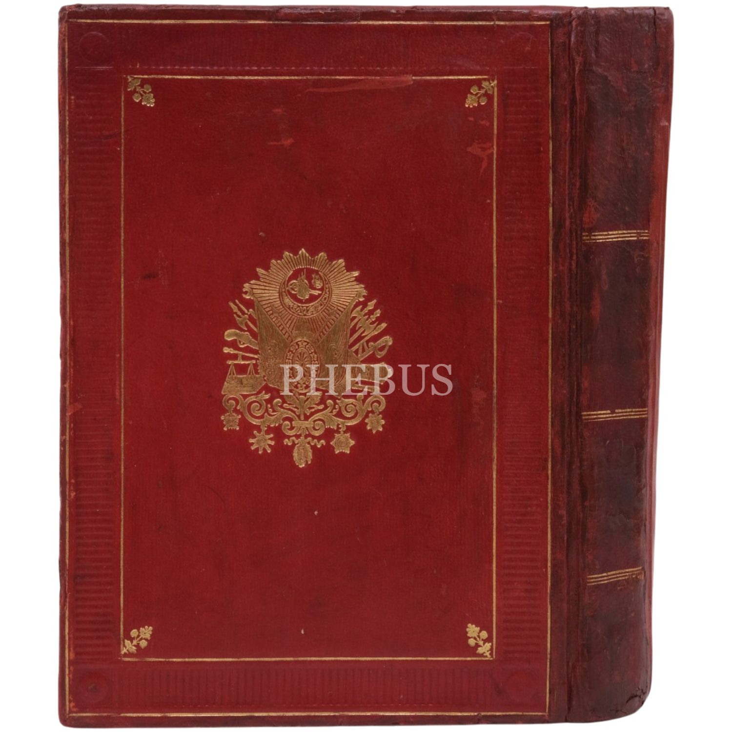 Osmanlı devlet armalı ve hilal ile yıldız desenleriyle süslenmiş deri dönem cildinde.
