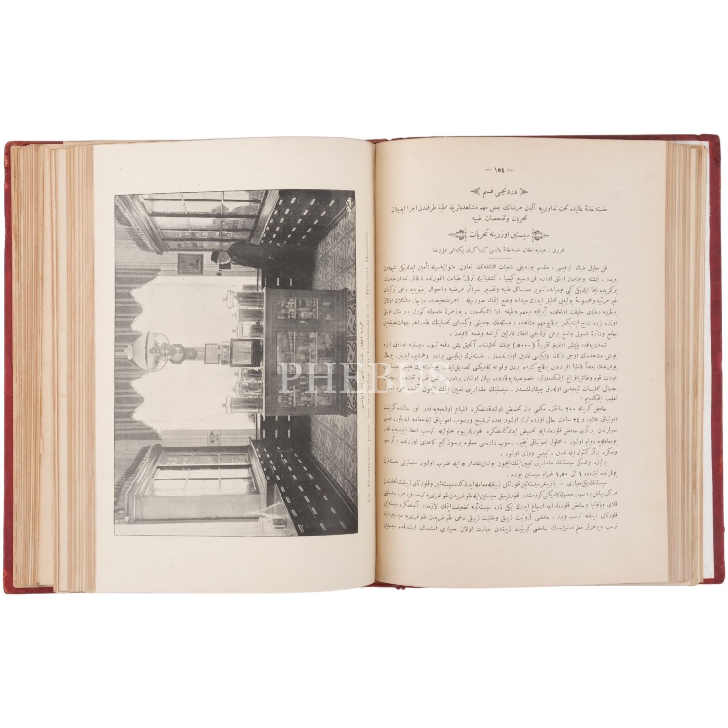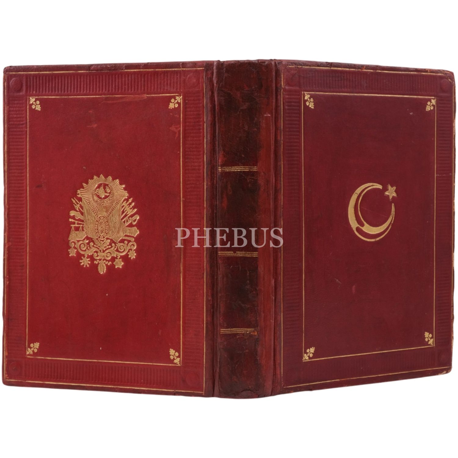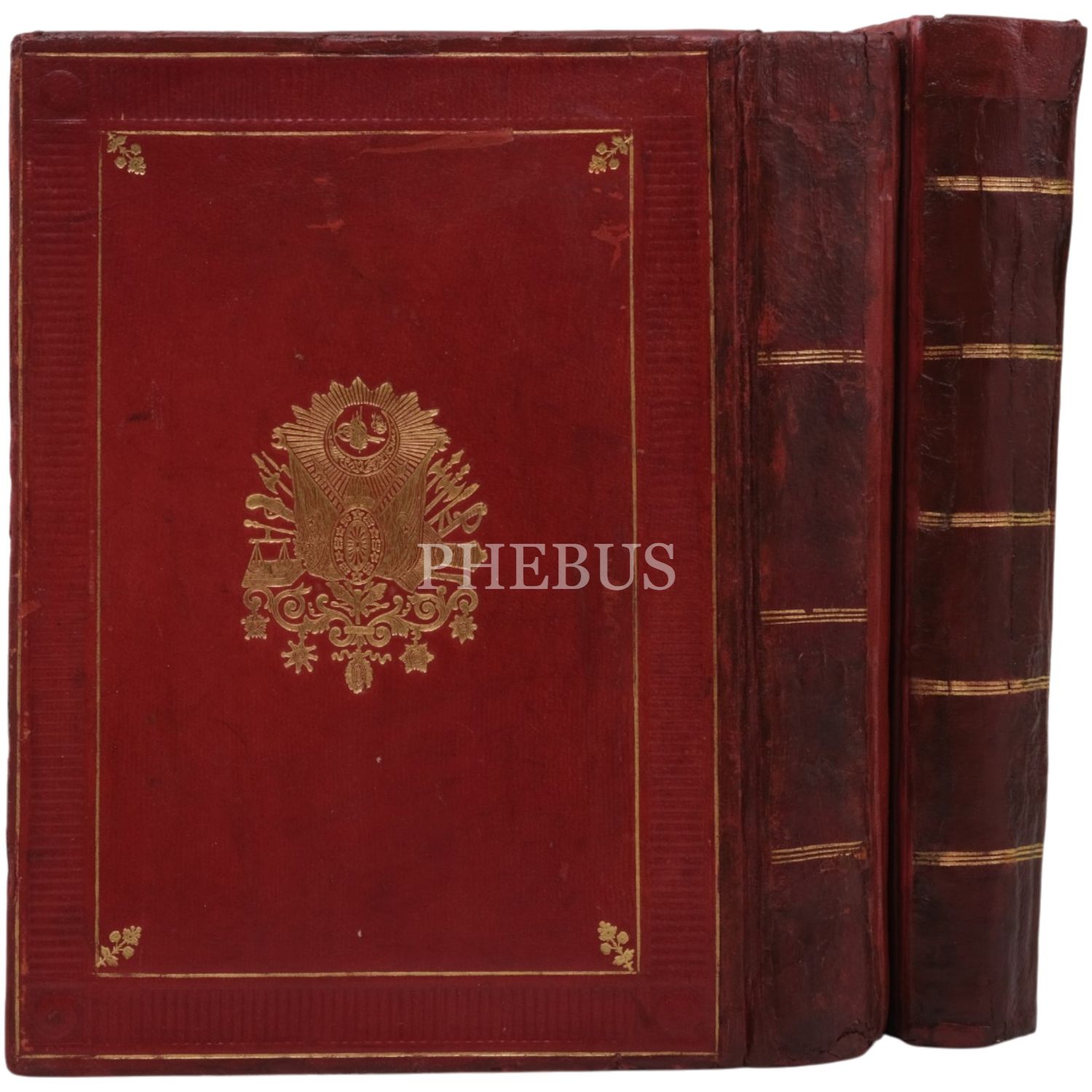 Osmanlı devlet armalı ve hilal ile yıldız desenleriyle süslenmiş deri dönem cildinde.
