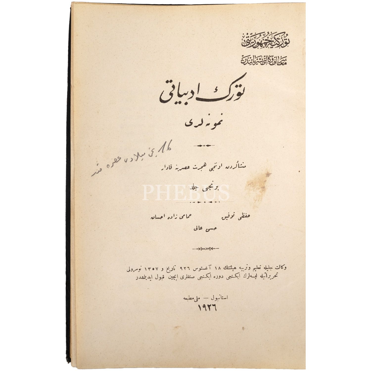 TÜRK EDEBİYATI NUMÛNELERİ: MENŞELERİNDEN ONUNCU HİCRET ASRINA KADAR, 1. cilt, Hıfzı Tevfik Gönensay-Hamâmizâde İhsan-Hasan Âli Yücel, 1926, Millî Matbaa, 400+5 sayfa, 16x24 cm, Özege: 21423...