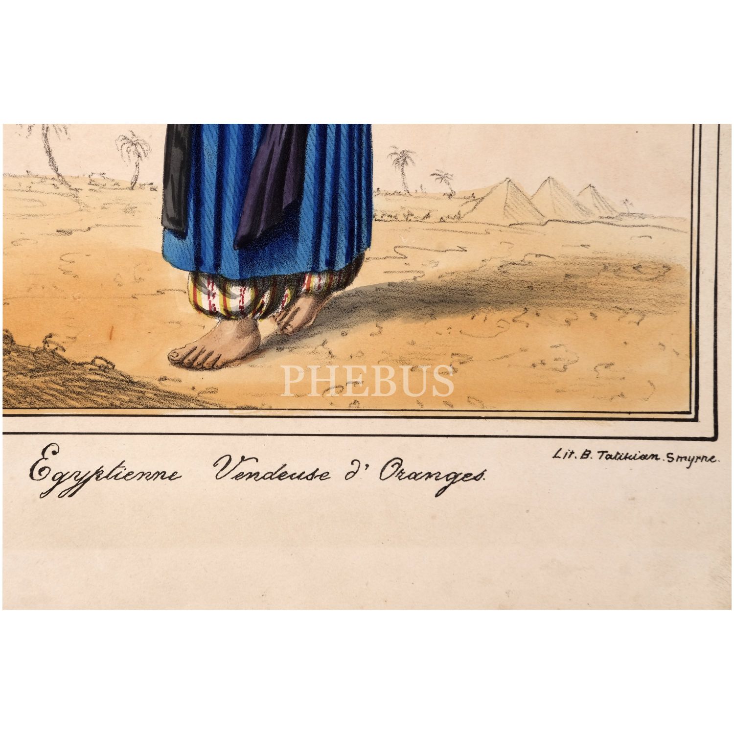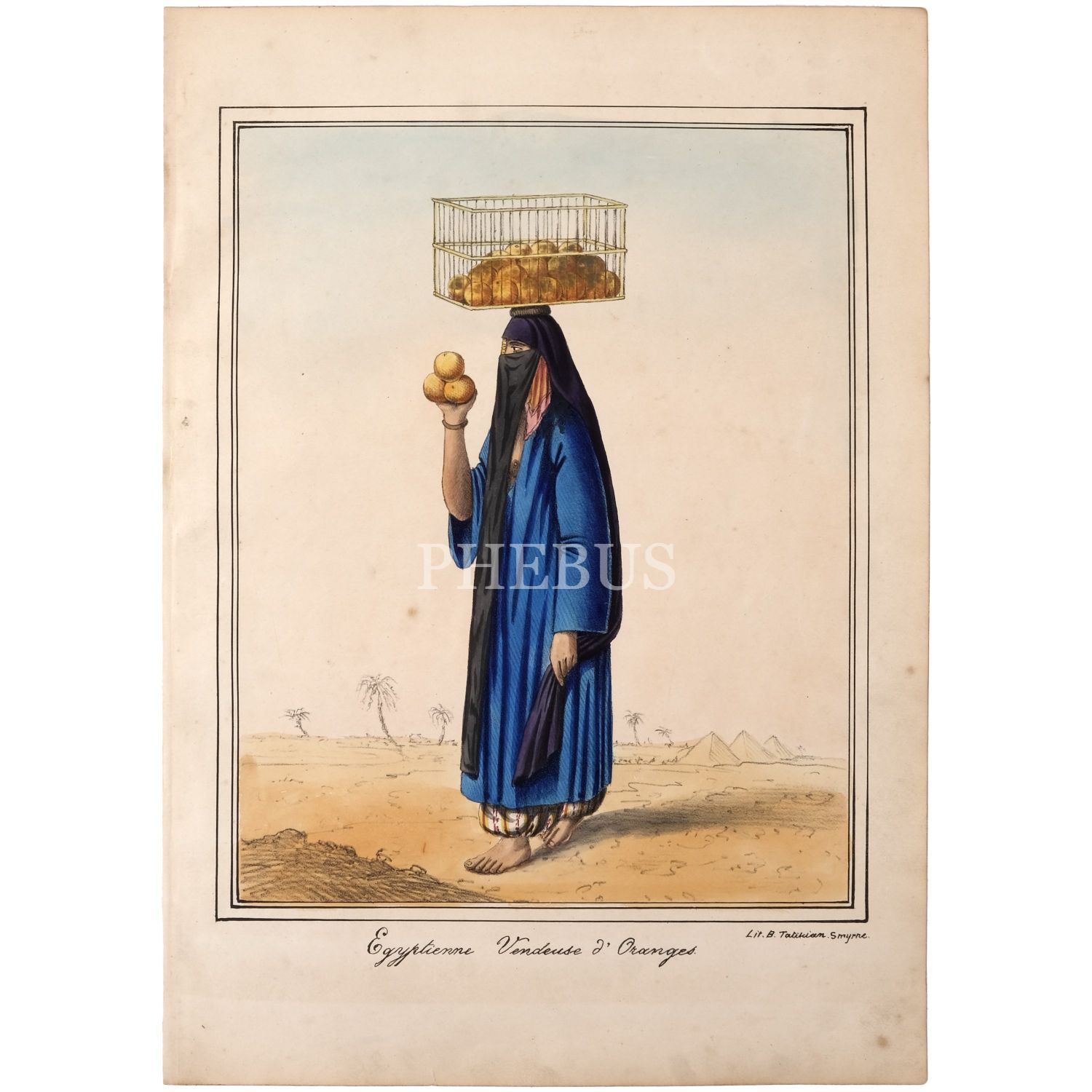 Portakal satan Mısırlı kadın, "Egyptieme Vendeuse d´Oranges", Lith. B. Tatikian, Smyrne, 23x32 cm...