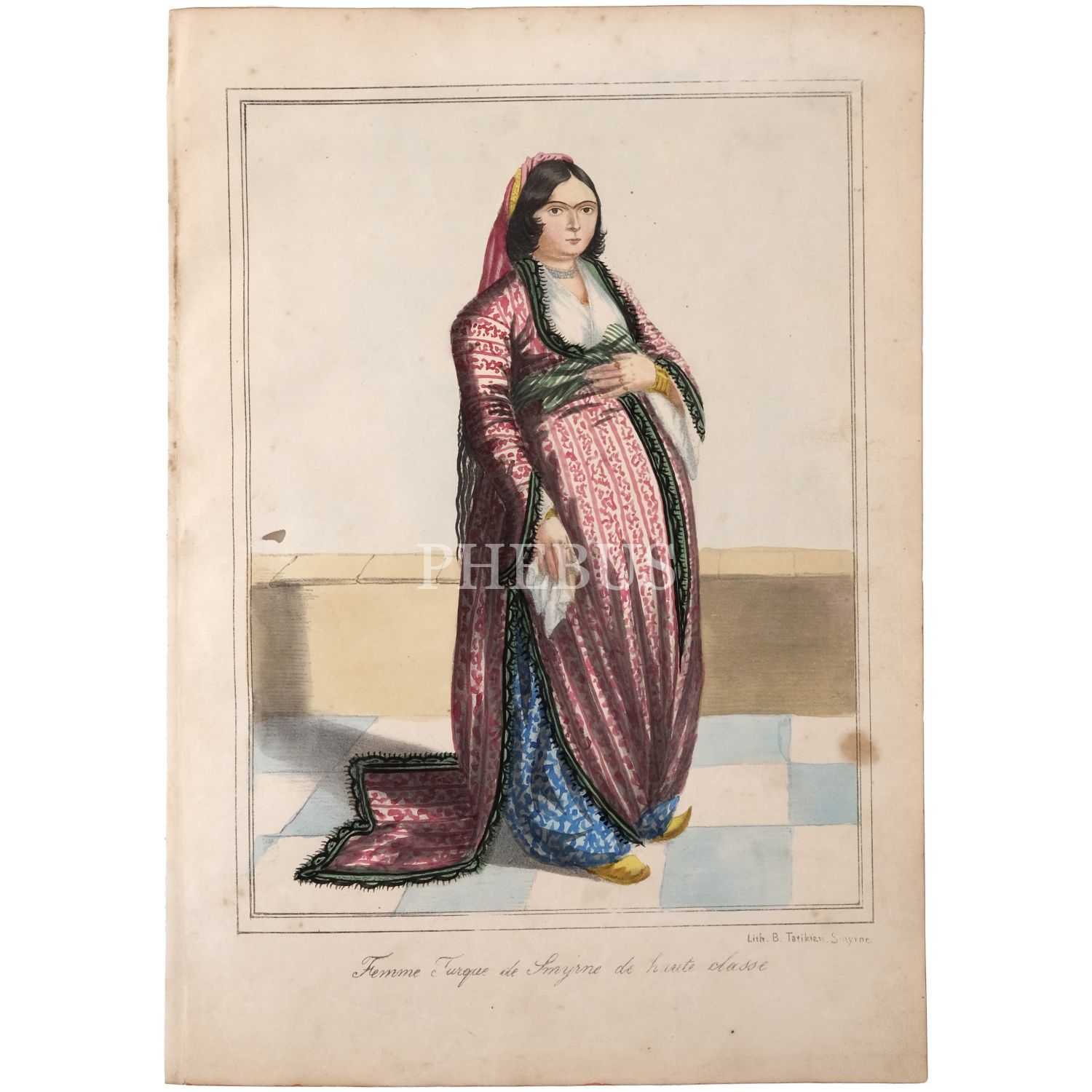 Yüksek sınıftan (soylu / elit) İzmirli Türk kadını, "Femme Turque de Smyrne de haute dasse", Lith. B. Tatikian, Smyrne, 23x32 cm...
