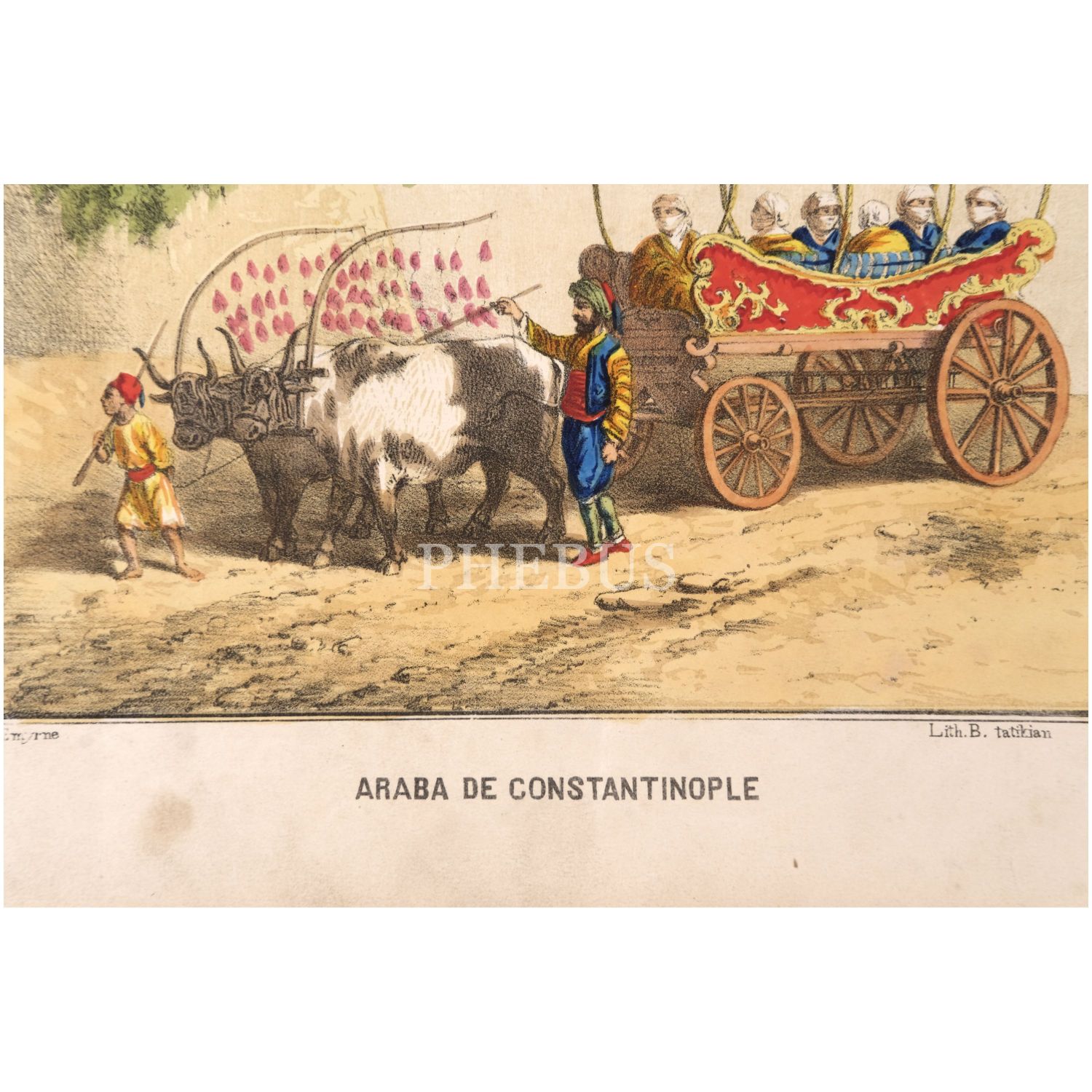 İstanbul´da öküz arabasıyla yolculuk yapan kadınlar, "Araba de Constantinople", Lith. B. Tatikian, Smyrne, 23x32 cm...
