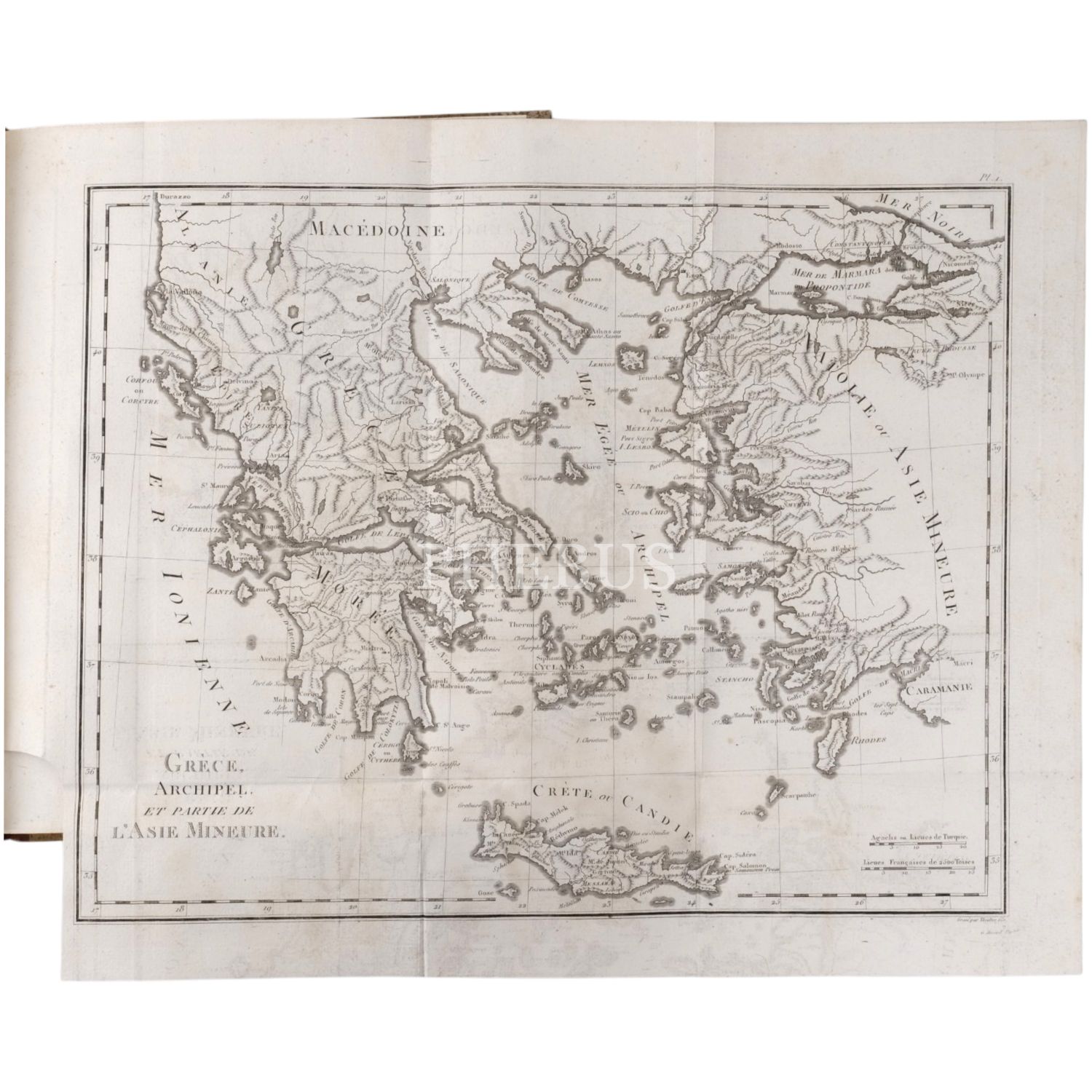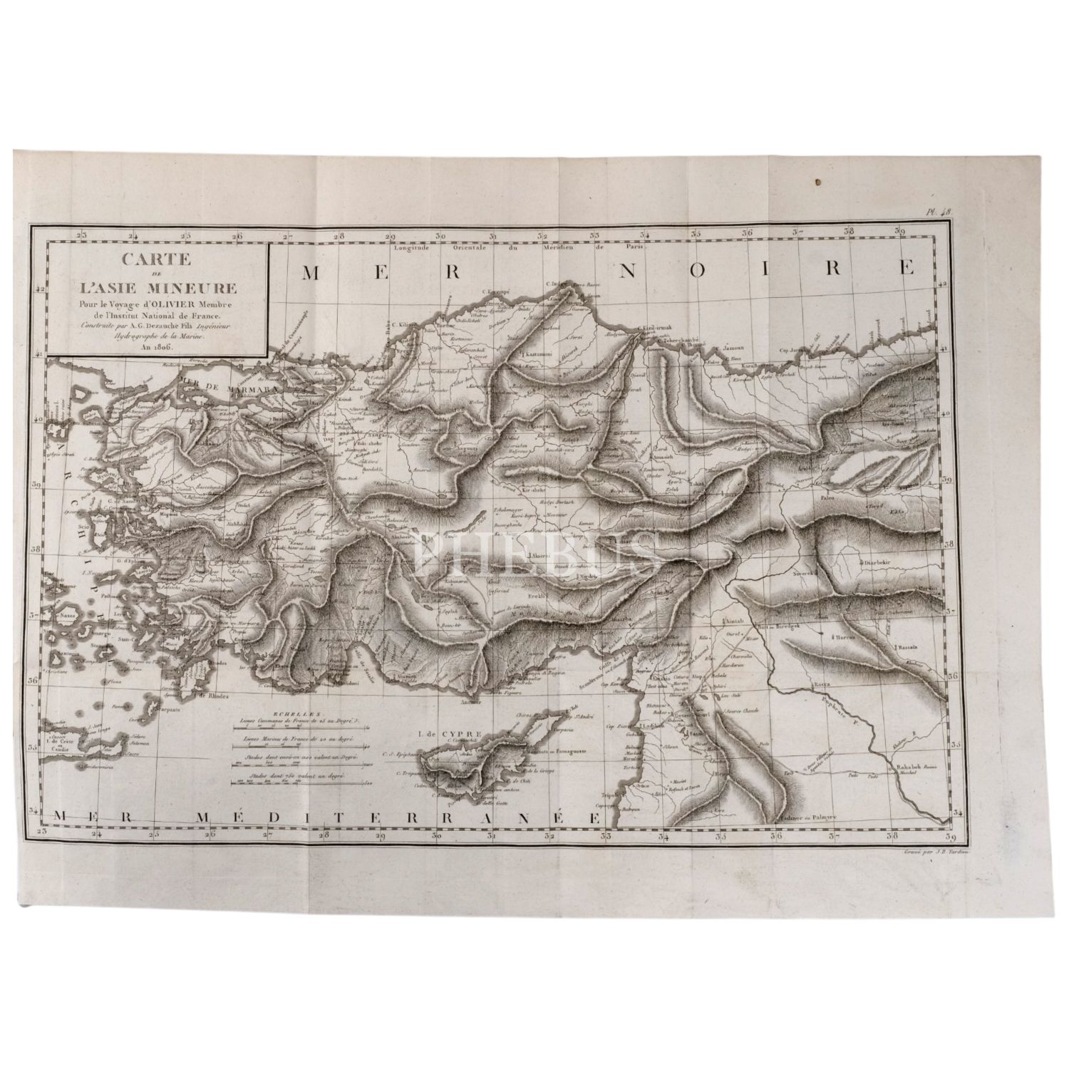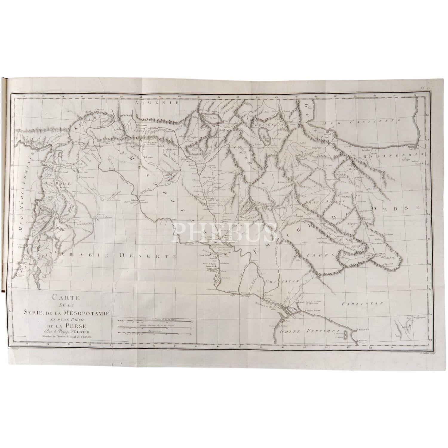 Fransız böcek ve doğa bilimci Guillaume-Antoine Olivier (1756-1814), 1792 yılında bir başka doğa bilimci Bruguiere ile birlikte Küçük Asya, İran, Mısır, Kıbrıs ve Korfu´yu kapsayan ve tamamlanması 6 yıl süren bir bilimsel yolculuğa çıkmıştır. Bu yolculukta birçok coğrafi ve jeolojik gözlemde bulunan ve botanik ve zoolojik zengin bir koleksiyon toplayan Olivier, Fransa´ya döndükten sonra seyahat gözlemlerini meraklı okurlarla paylaşmıştır. Müzayedemize sunduğumuz bu atlas, 9 katlanır levha ve 41 gravür içermektedir.