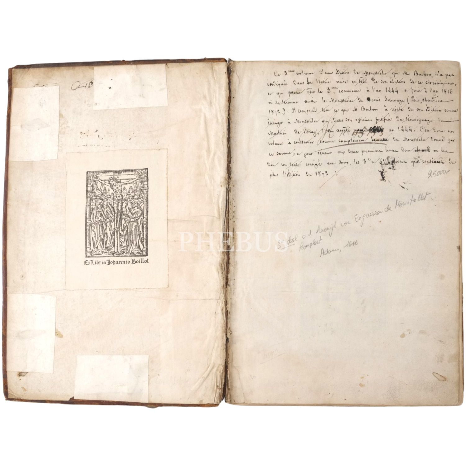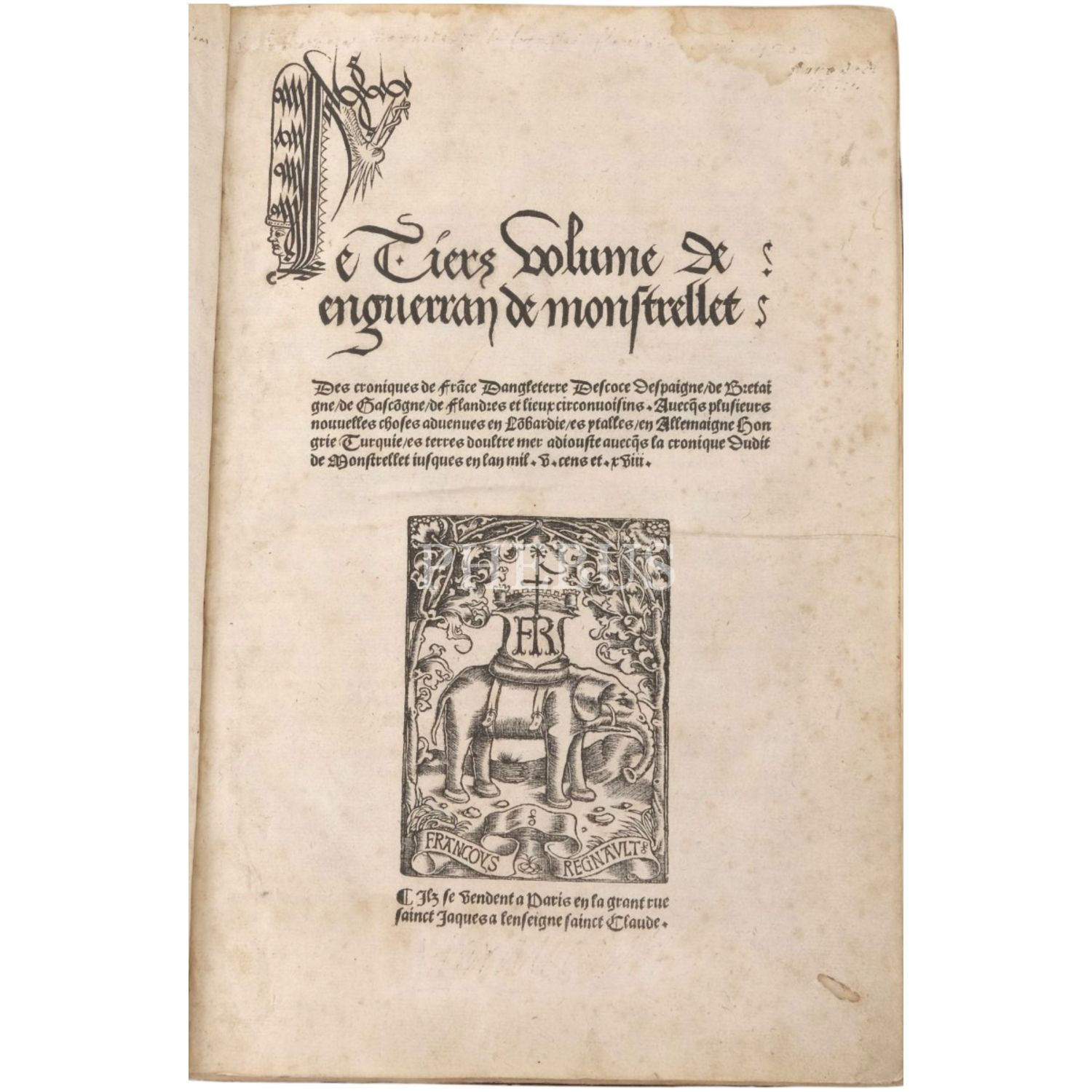 "Le Tiers volume de enguerran de montstrellet: Des croniques de France Dangleterre Descoce Despaigne de Bretaigne de Gascongne de Flandres & lieux circonuoisins. Auecques plusieurs nouuelles choses aduenues en Lombardie es ytalles en Allemaigne Hongrie Turquie es terres doultre mer adiouste Avecques la cronique Dudit de Monstrellet iusques en lan mil. v. cens et.xviii." Sırtı panelli, kapakları gofre tezyinatlı, tümüyle deri dönem cildinde.