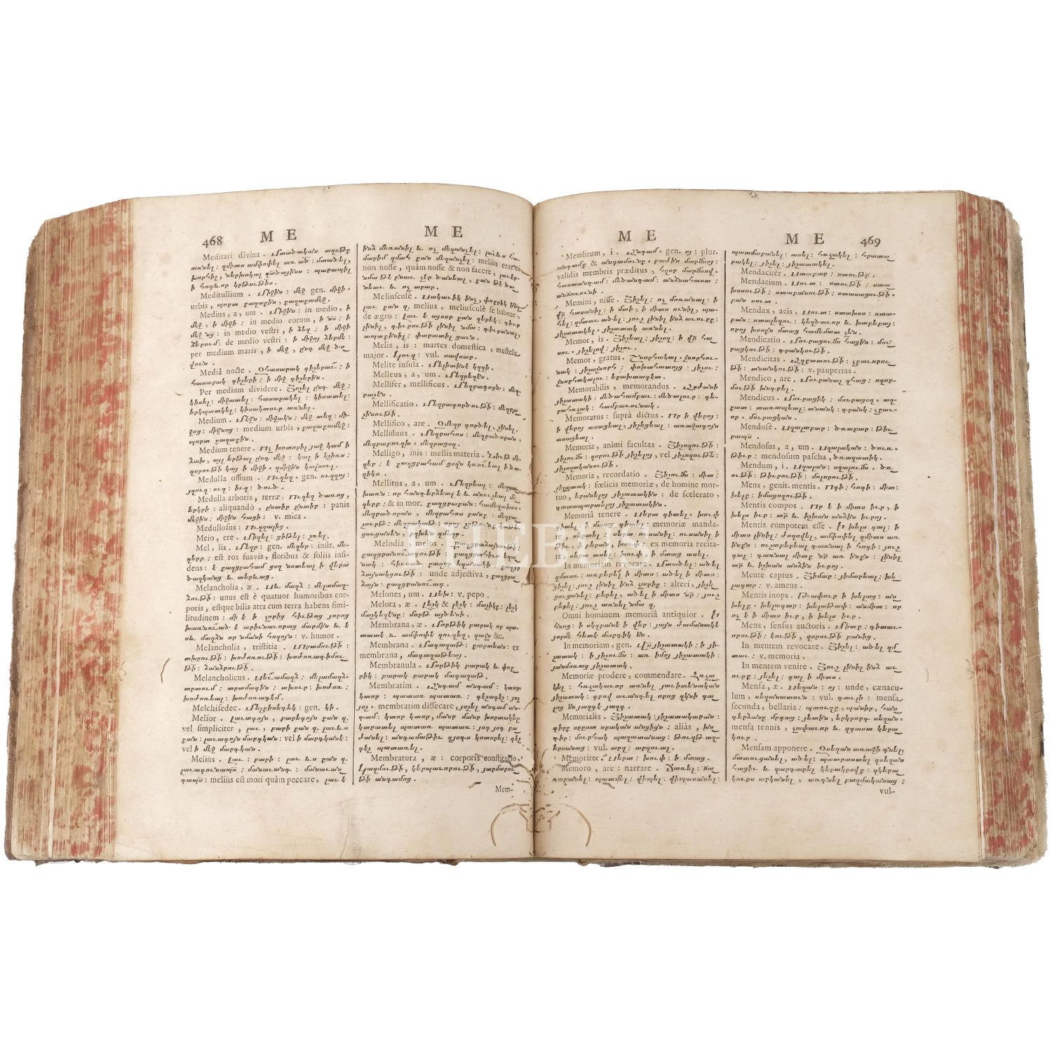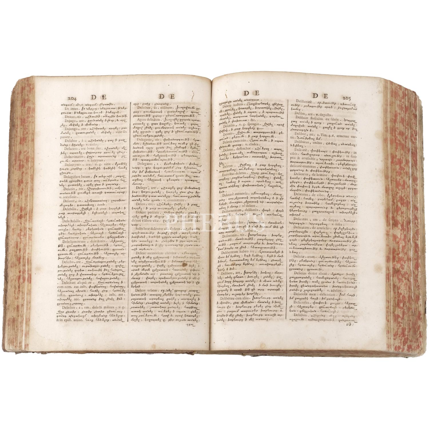 Hagop Vartabed tarafından hazırlananan sözlüğün yazıldığı dönemde Roma, Ermeni Kilisesini katolikleştirmek istediğinden bu tarz kültür çalışmalarını propaganda öğrencilerini eğitmek için sıkça kullanmıştır. Bez sırtlı, vellum ciltli. Sayfa kenarları kırmızı boyalıdır. *Kurt yenikleri mevcuttur.