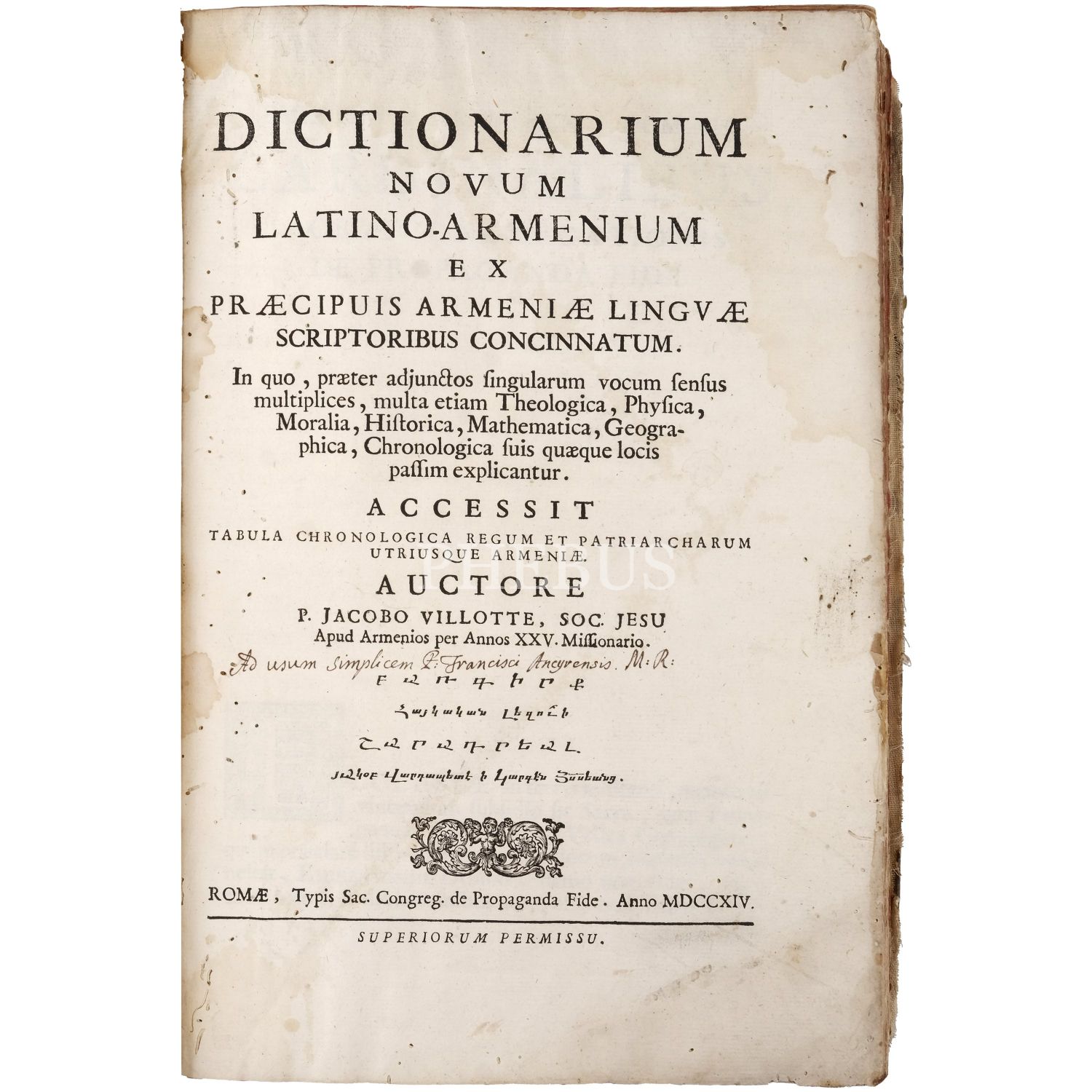 DICTIONARIUM NOVUM LATINO-ARMENIUM, Jacobo Villotte, 1714, Rome, Typis Sac. Congreg. de Propaganda Fide., 771 sayfa, 25x36 cm...
