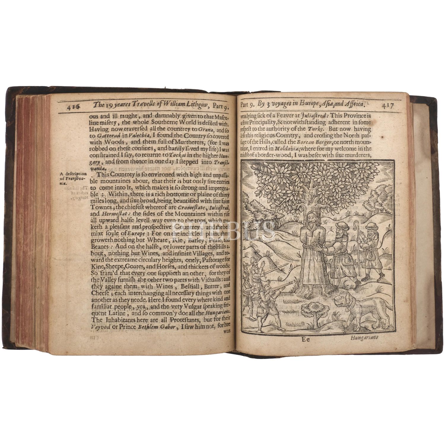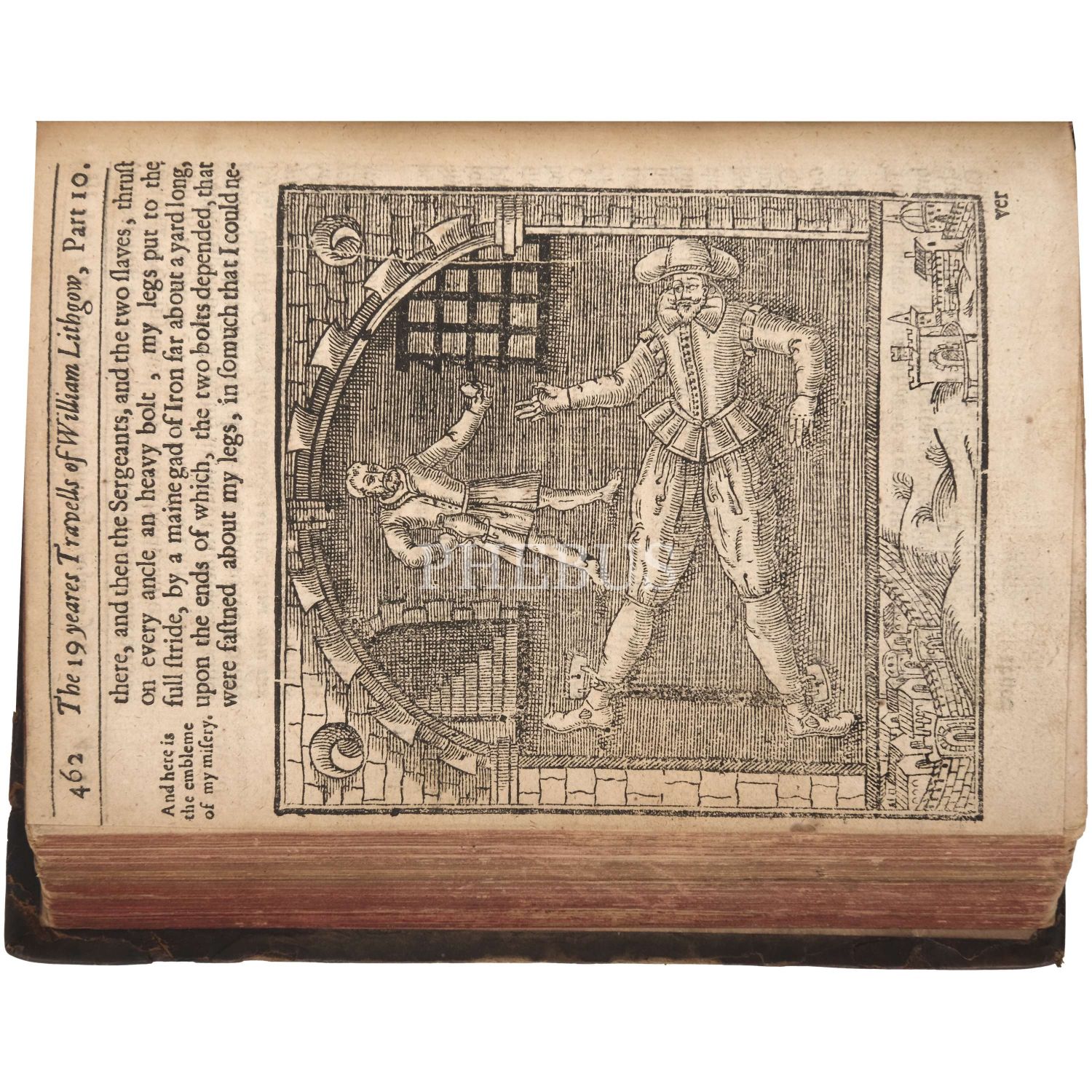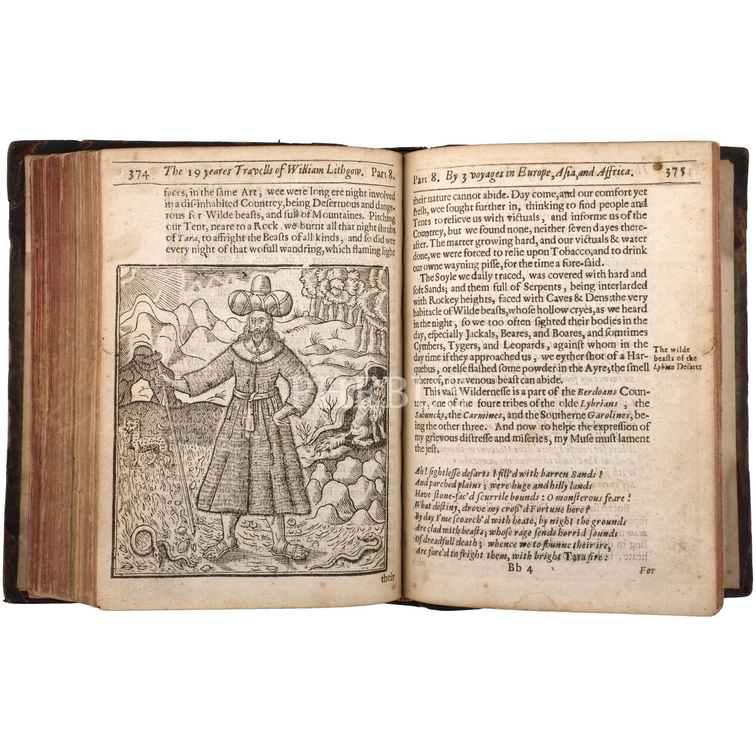 İskoç gezgin William Lithgow´un (1582-1645), 19 yıl boyunca Avrupa, Asya ve Afrika´da "yürüyerek" 36.000 mil katettiğini iddia ettiği seyahatlerini, ahşap oyma baskı gravürler eşliğinde okurlara sunduğu kitabı... "The Societ of Writters to the Signet" kabartma logolu, deri sırtlı cildinde. Sayfa kenarları kırmızı boyalıdır.