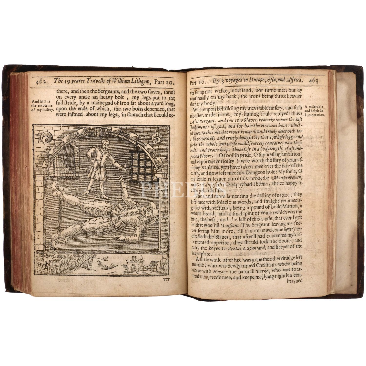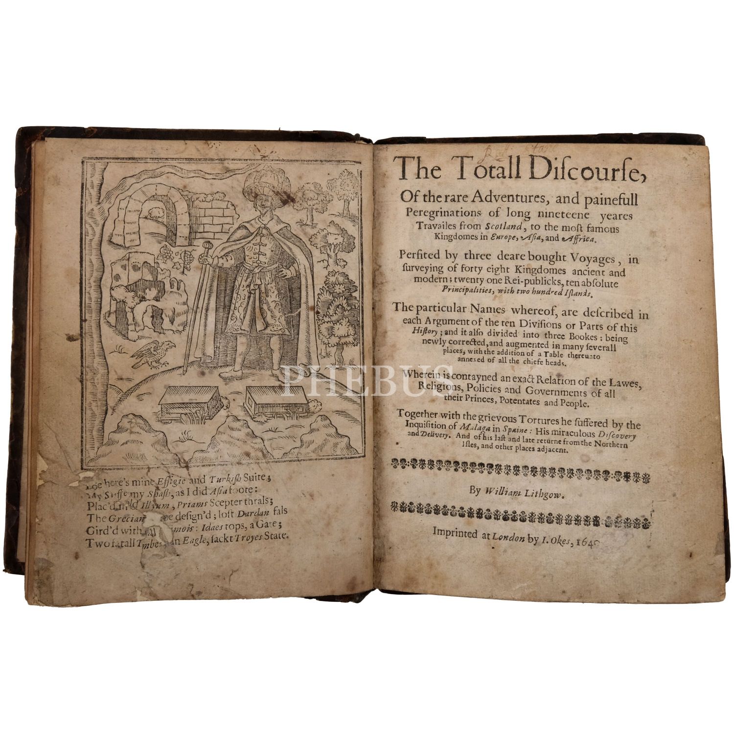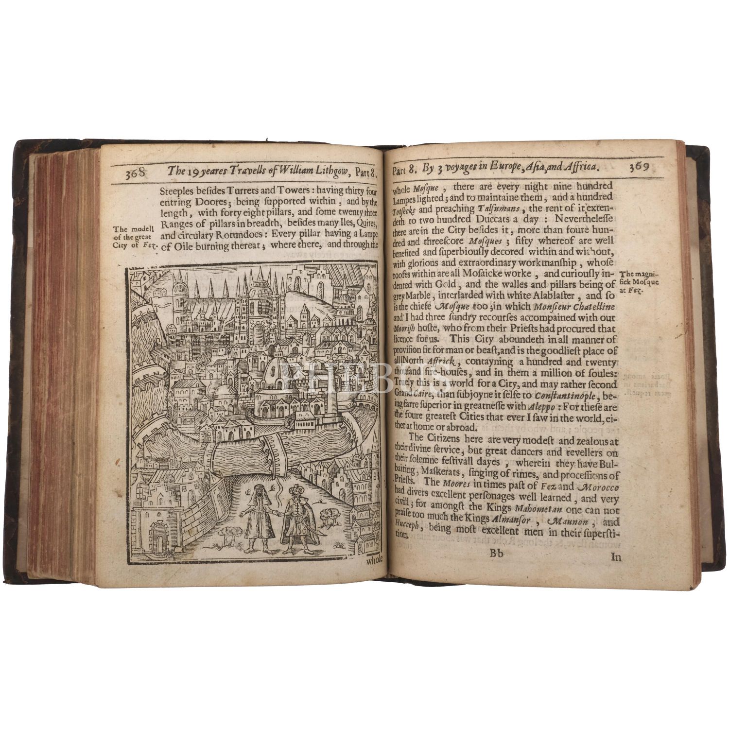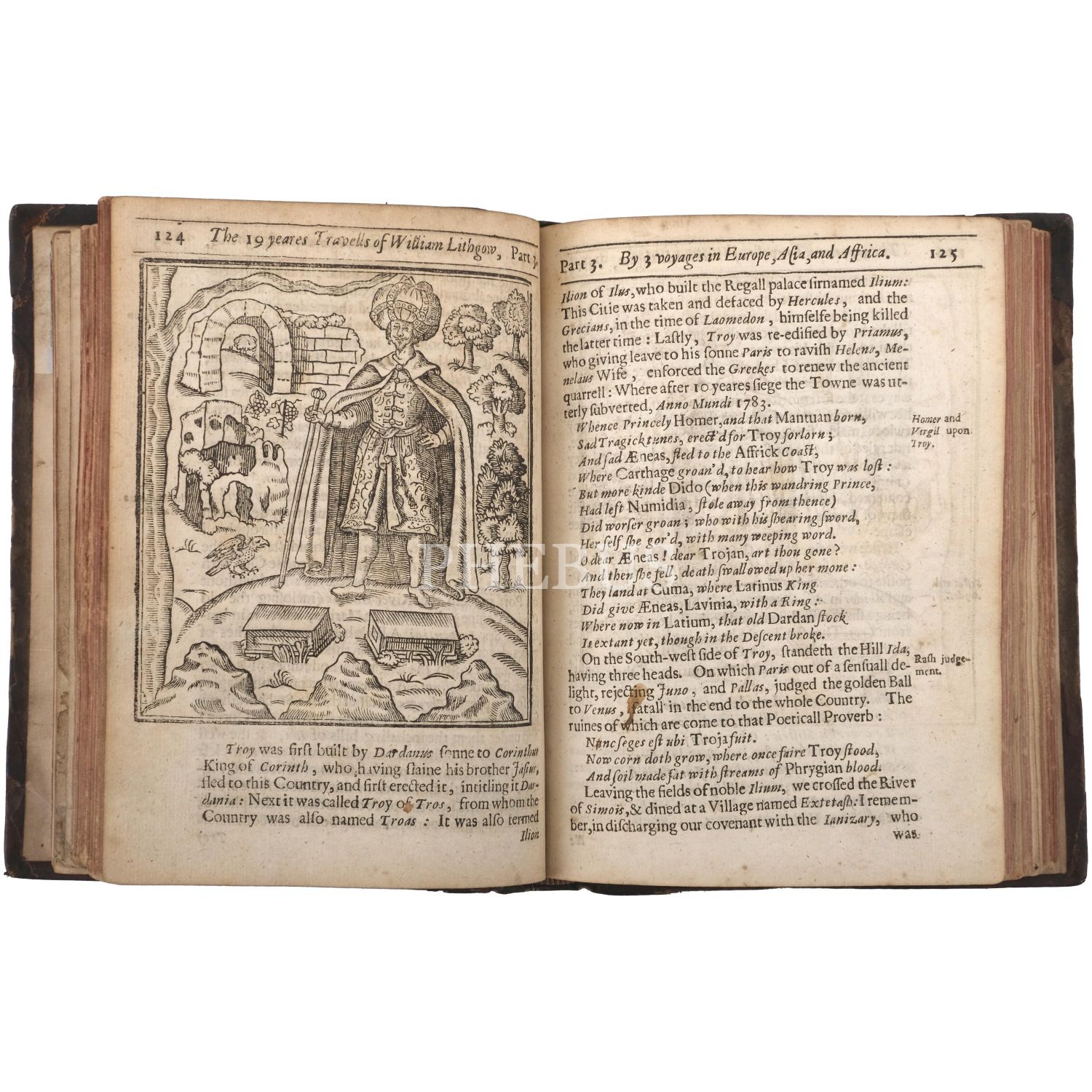 İskoç gezgin William Lithgow´un (1582-1645), 19 yıl boyunca Avrupa, Asya ve Afrika´da "yürüyerek" 36.000 mil katettiğini iddia ettiği seyahatlerini, ahşap oyma baskı gravürler eşliğinde okurlara sunduğu kitabı... "The Societ of Writters to the Signet" kabartma logolu, deri sırtlı cildinde. Sayfa kenarları kırmızı boyalıdır.