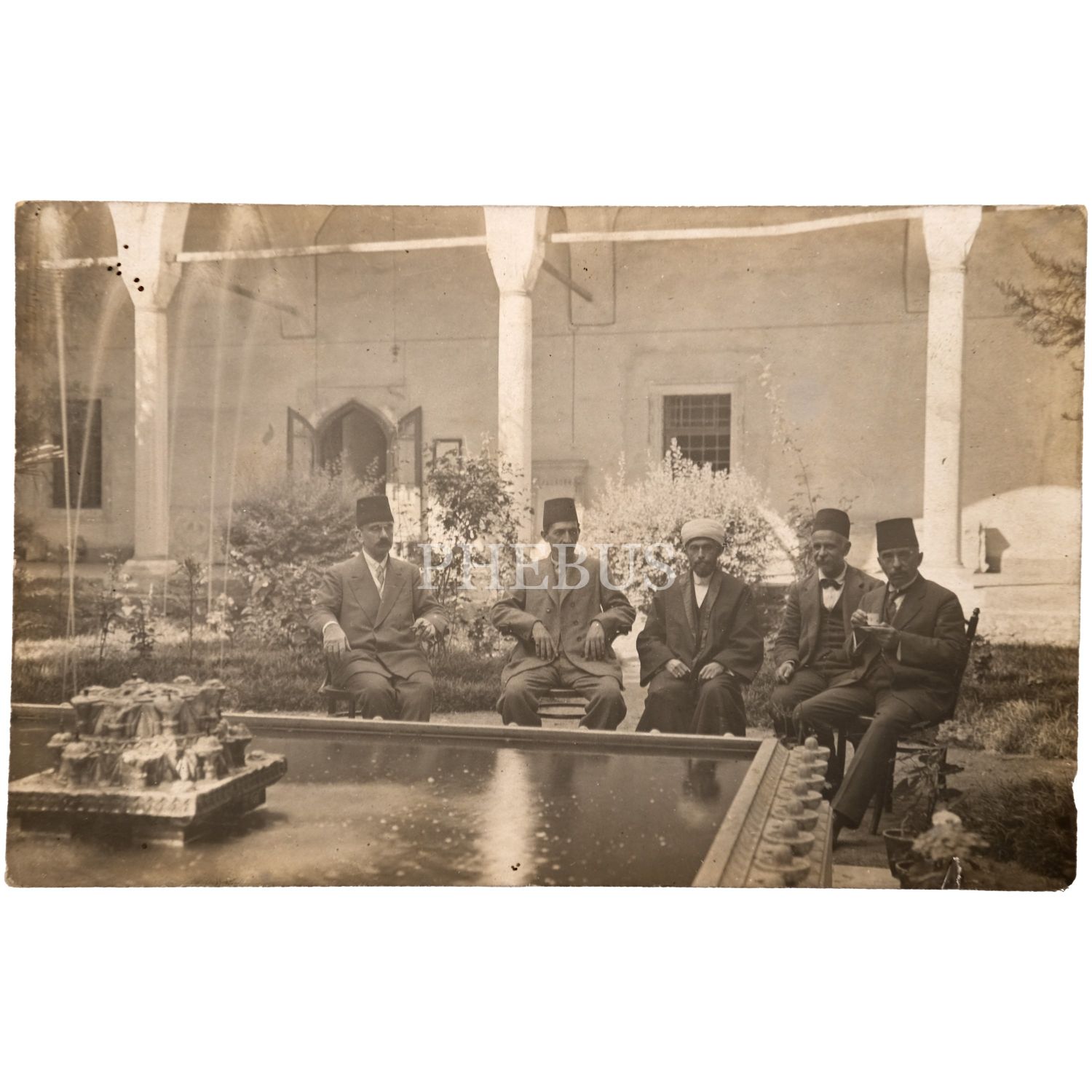 İbnülemin Mahmud Kemal ve çeşitli zevatın Evkâf-ı İslâmiye Müzesi bahçesinde havuz başında çekilmiş fotoğrafı, 1336 tarihli, 14x10 cm...