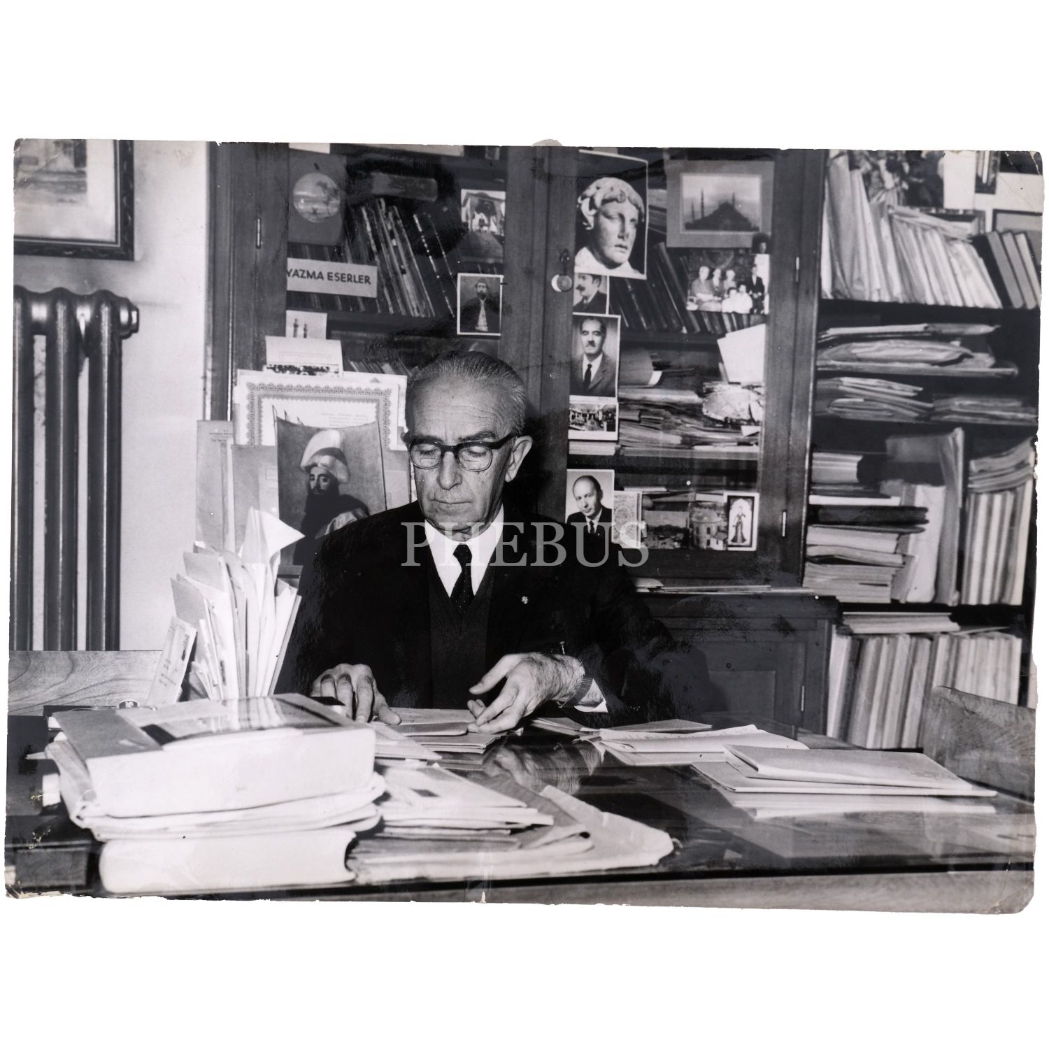 Süheyl Ünver´in masa başında çalışırken görüldüğü fotoğraf, 24x18 cm...