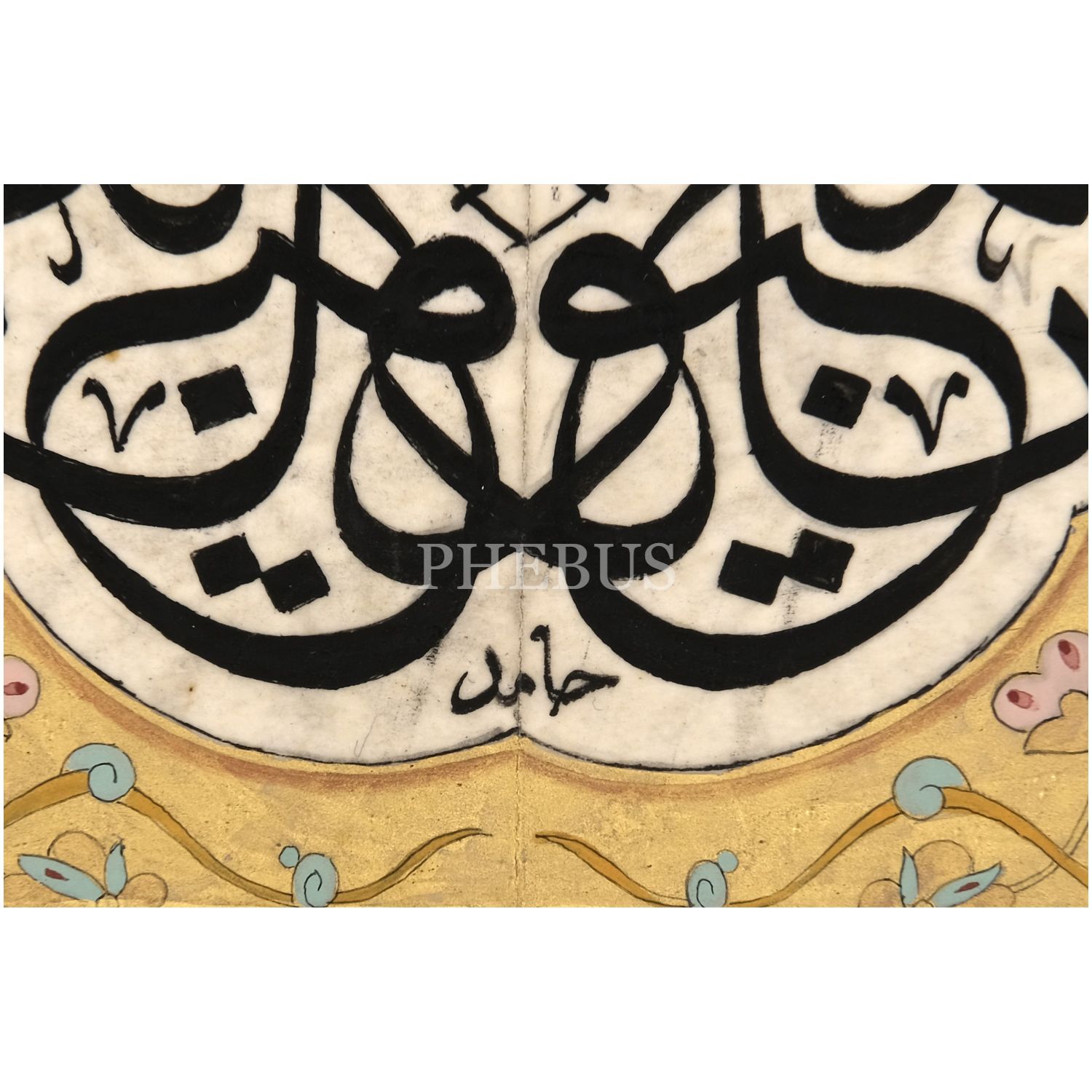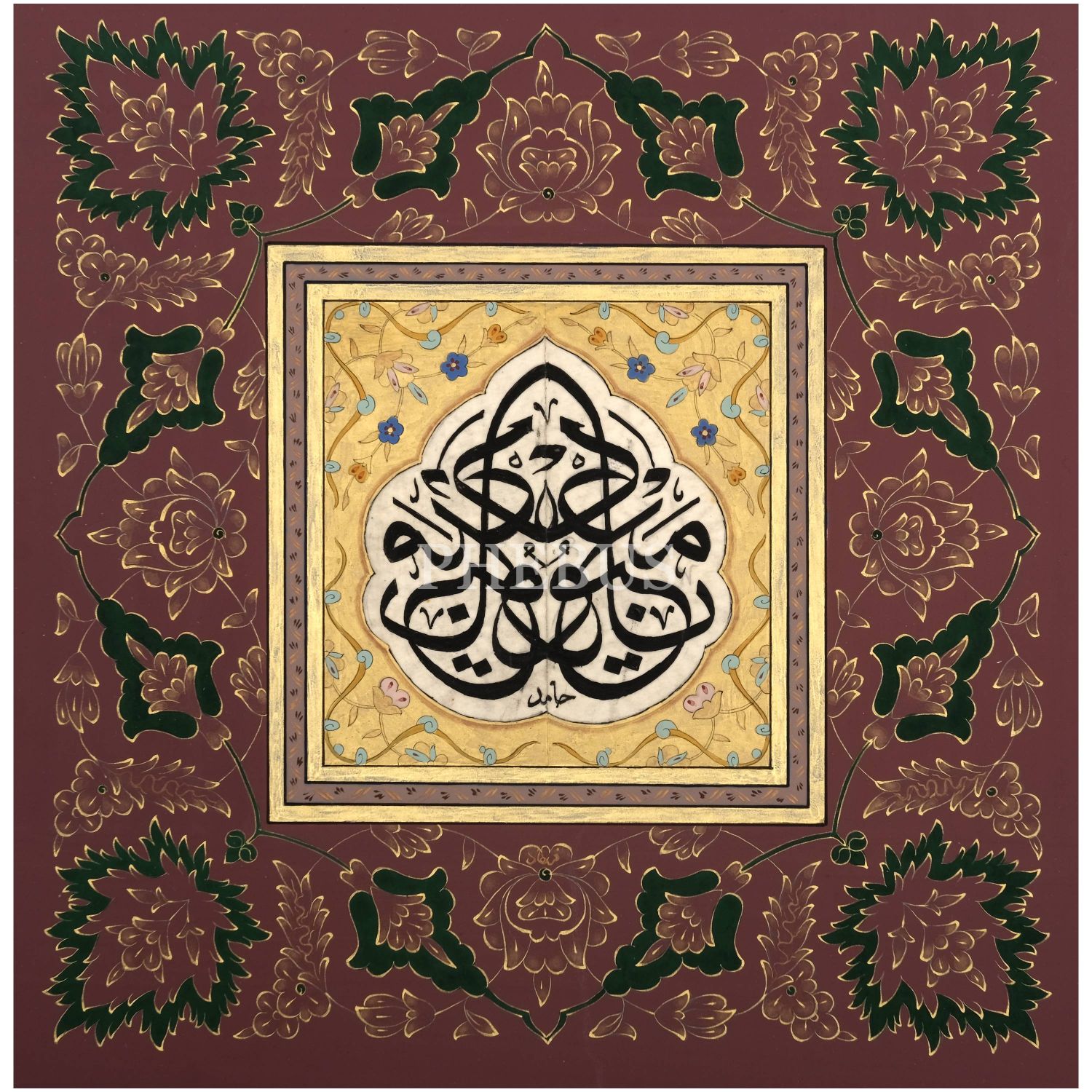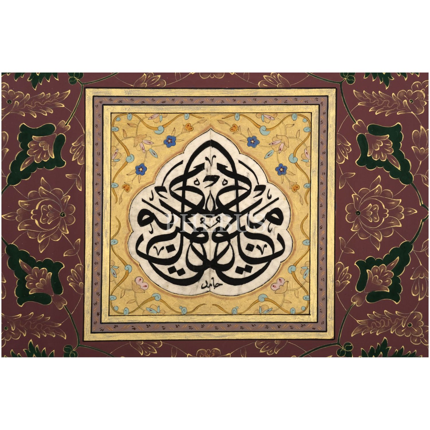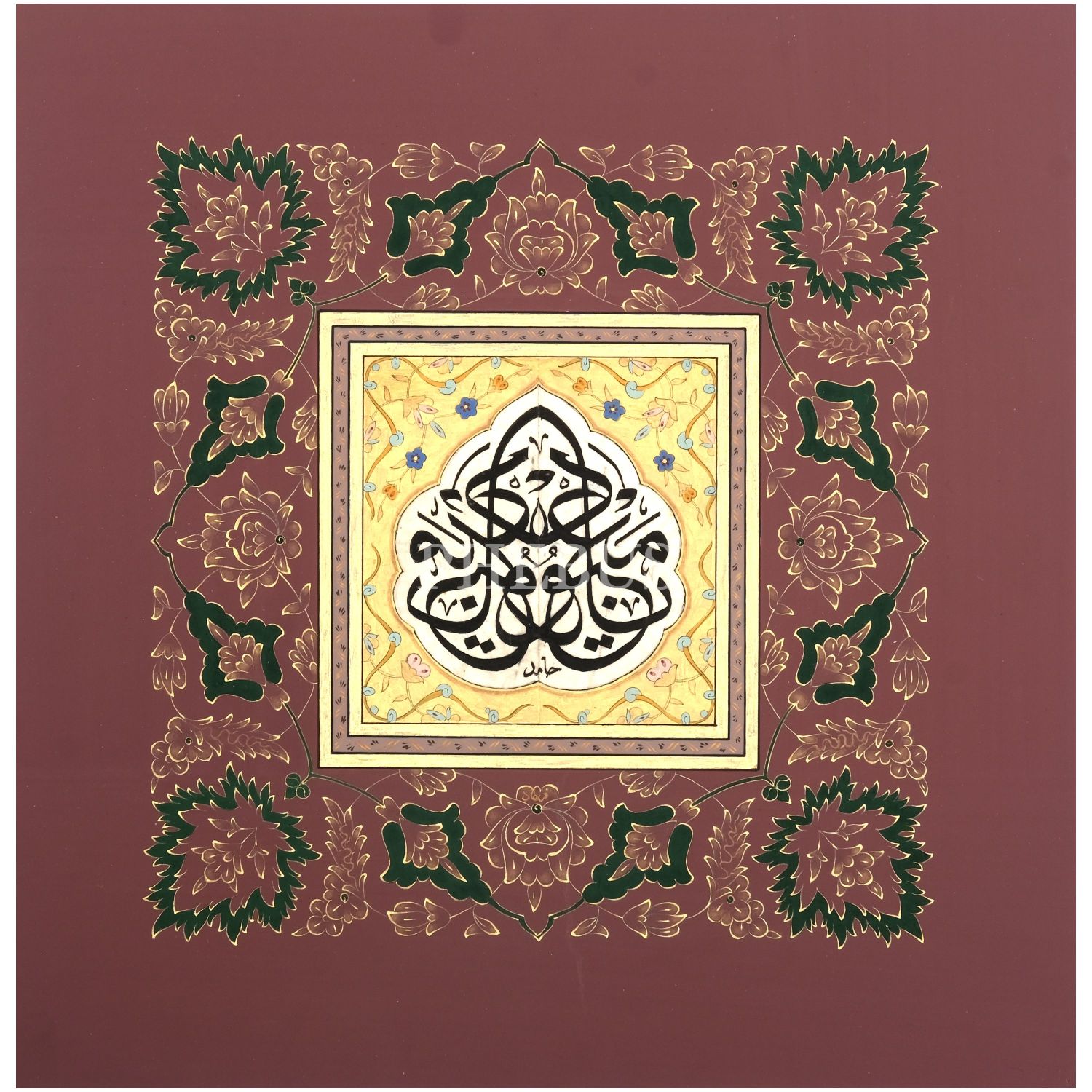 Hâmid (Aytaç) ketebeli sülüs müsenna levha, tezhibi Ferhad (Gündem) imzalı, yazı ölçü: 9x9 cm, 26x26 cm...