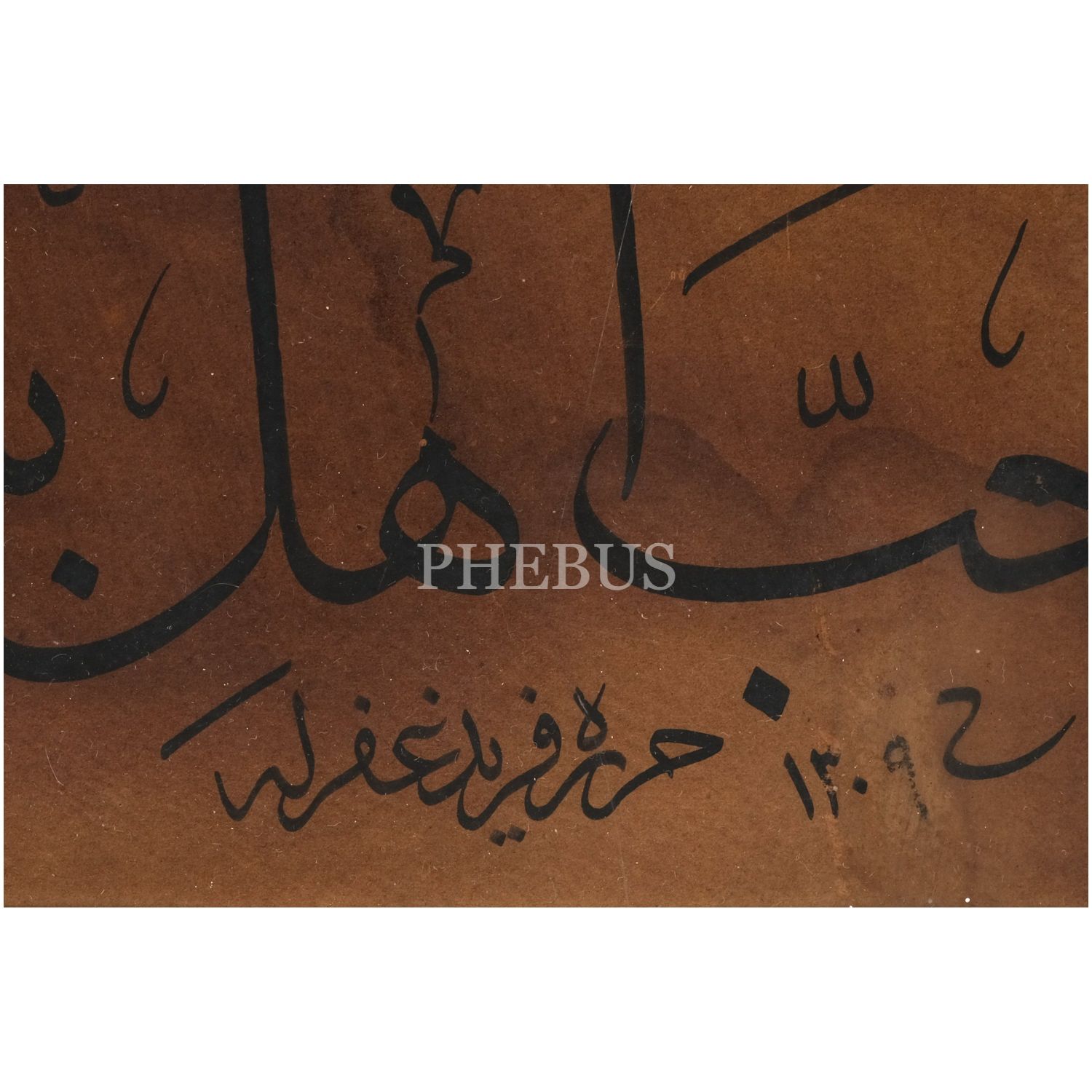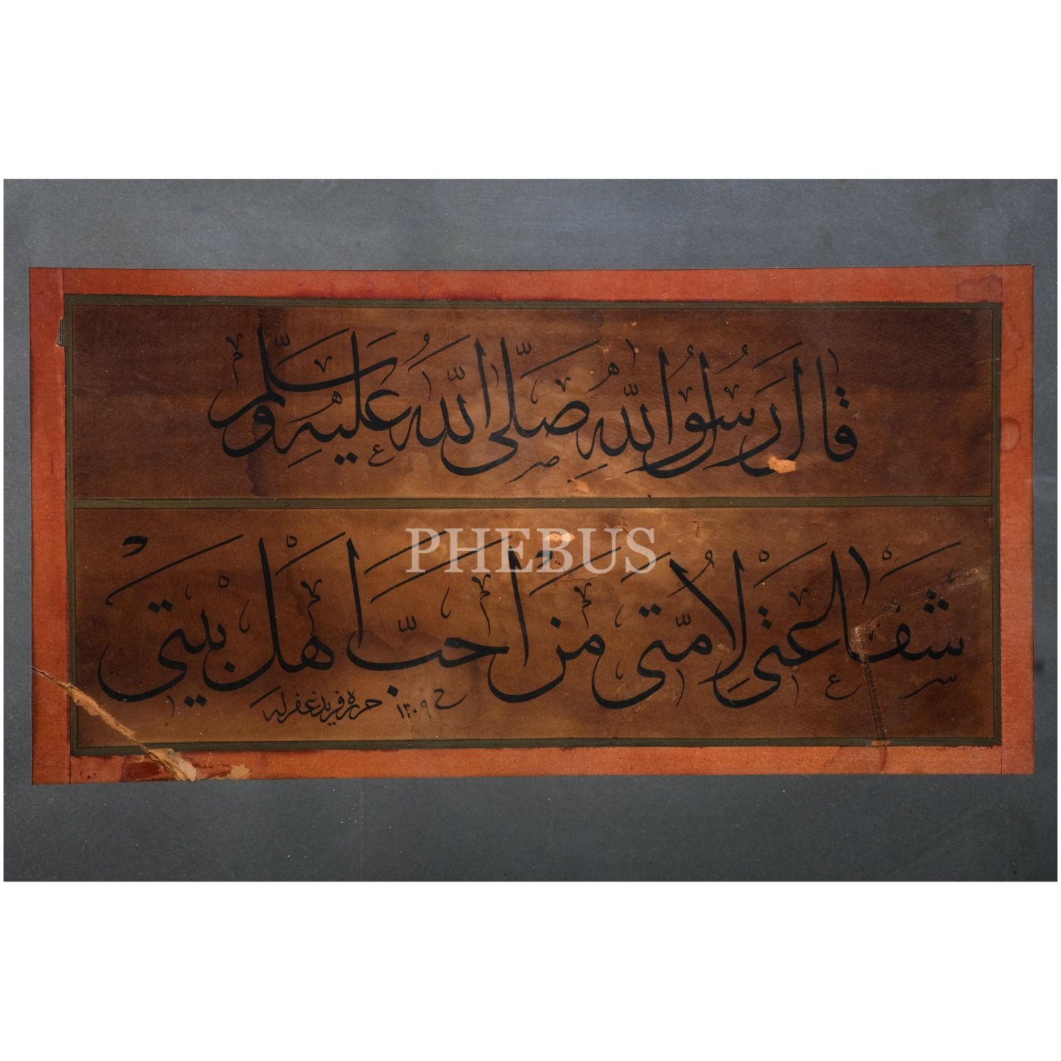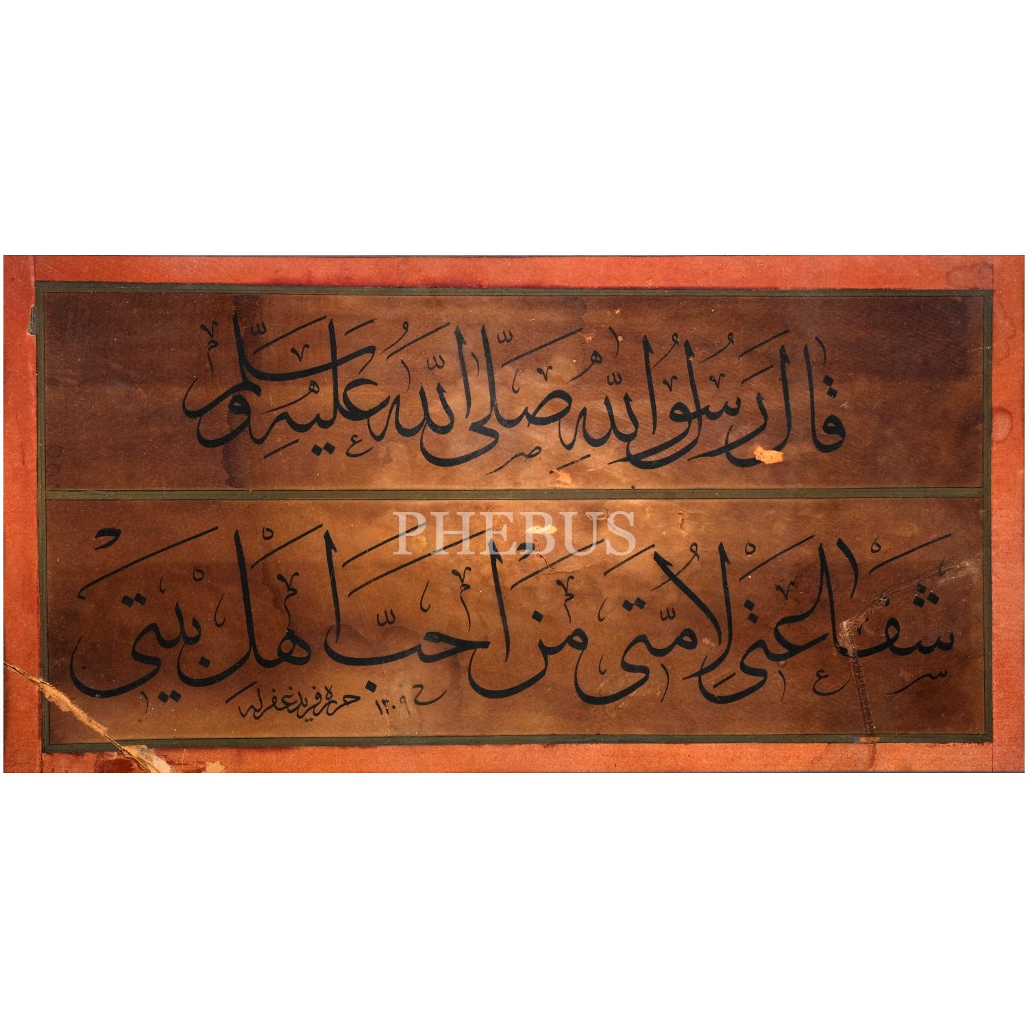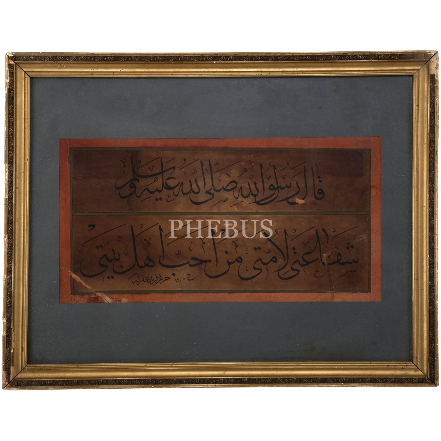 Ferid Bey ketebeli sülüs hadis-i şerif, hicri 1309 tarihli, yazı ölçü 43x21, çerçeve içi: 56x42 cm...