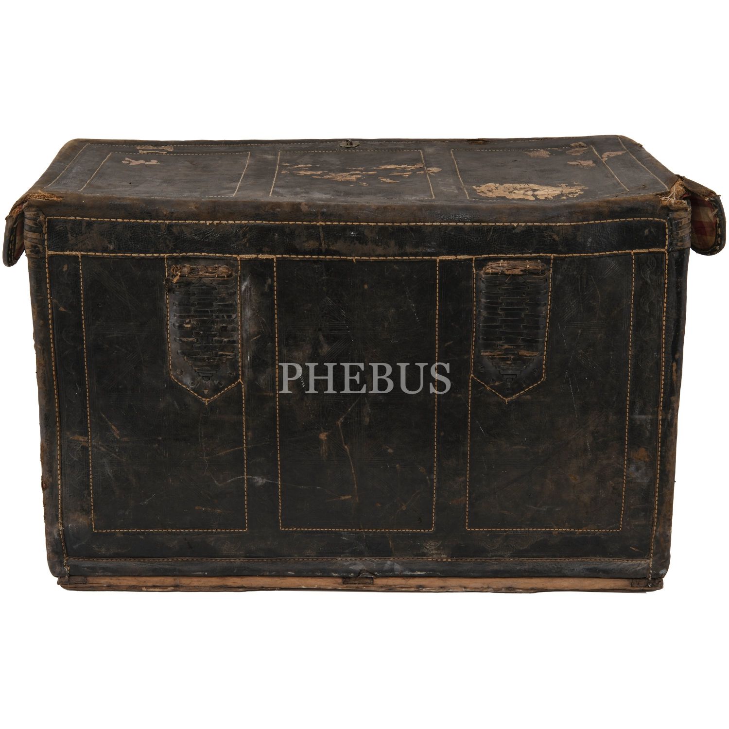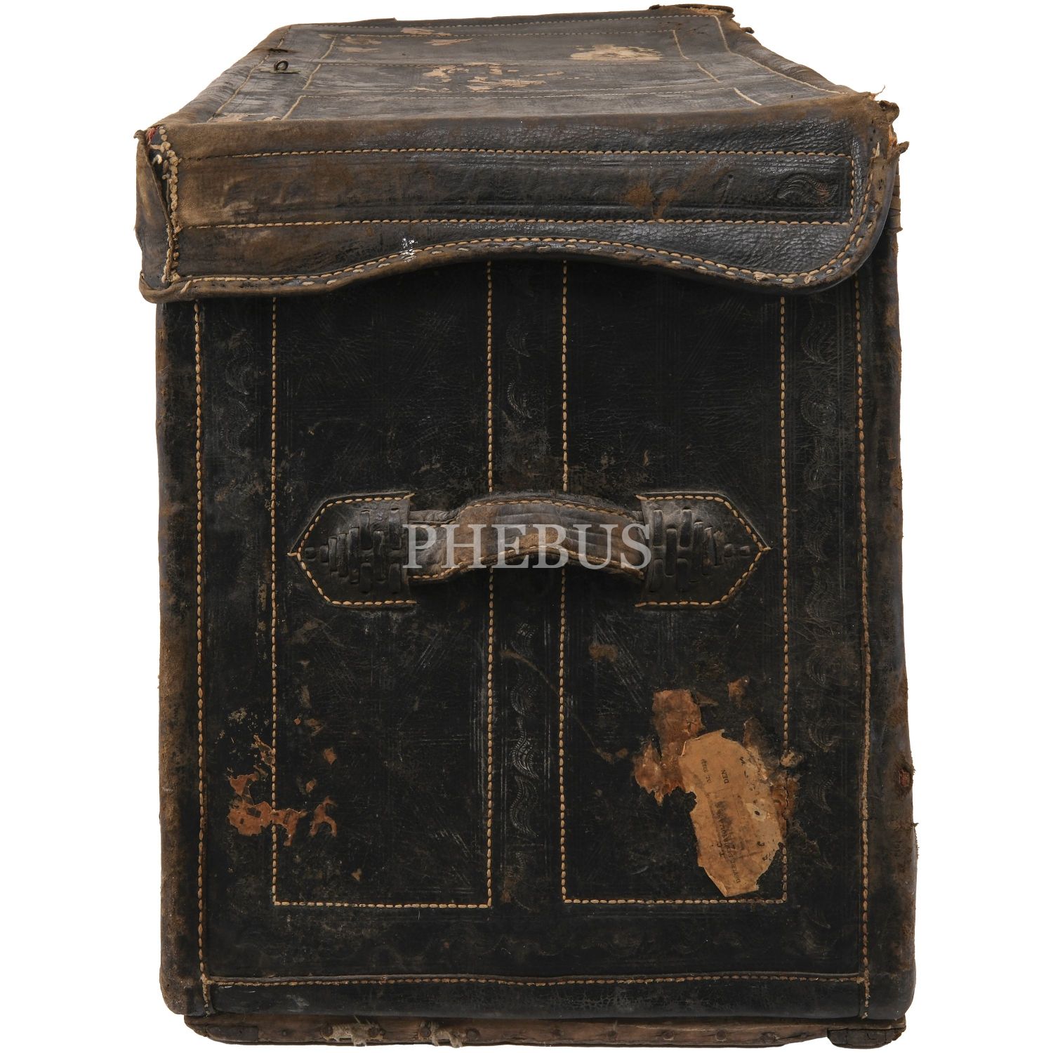 Yanları kulplu, kapağı kemer tokalı, yüzeyi sicim ve işlemeyle süslenmiş surre sandığı.