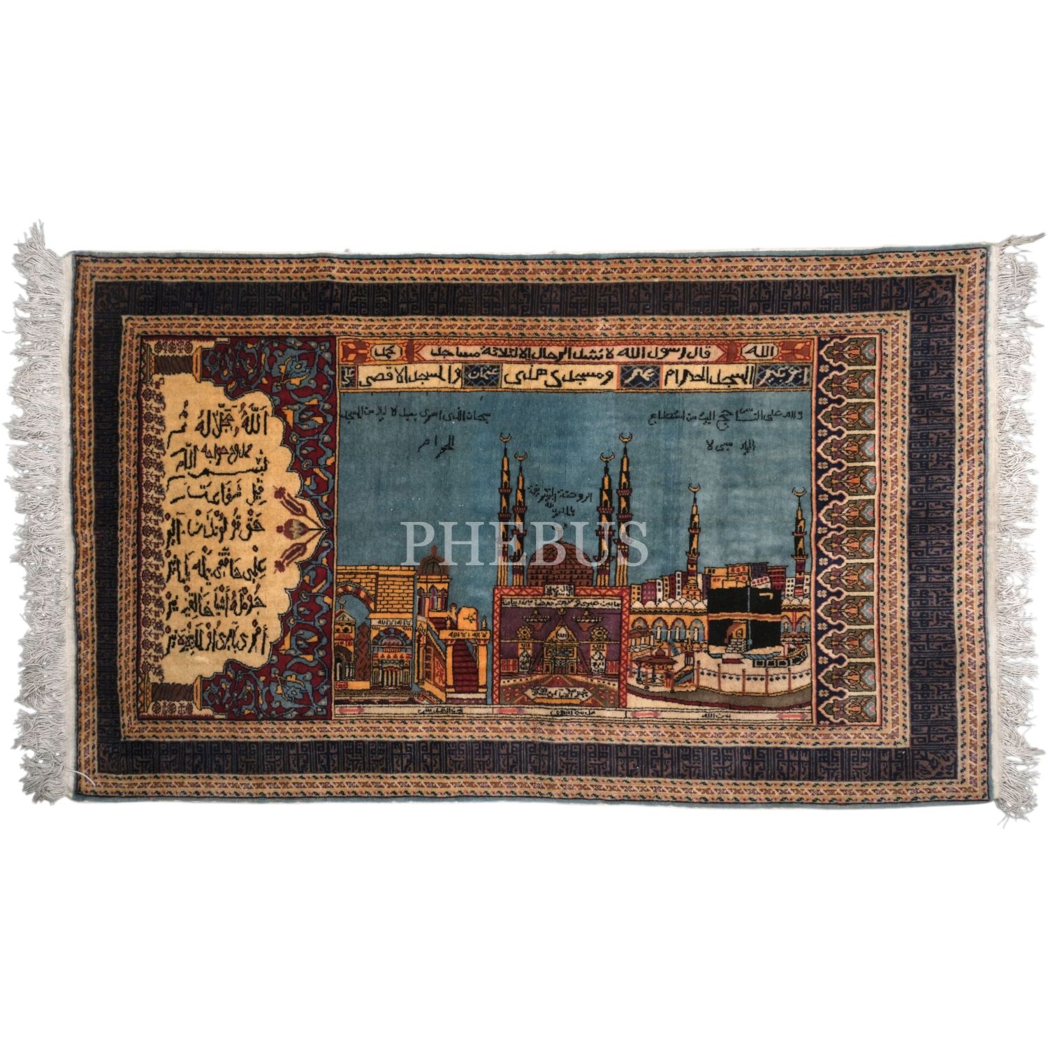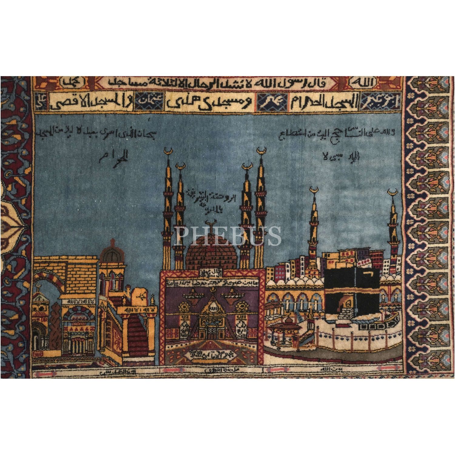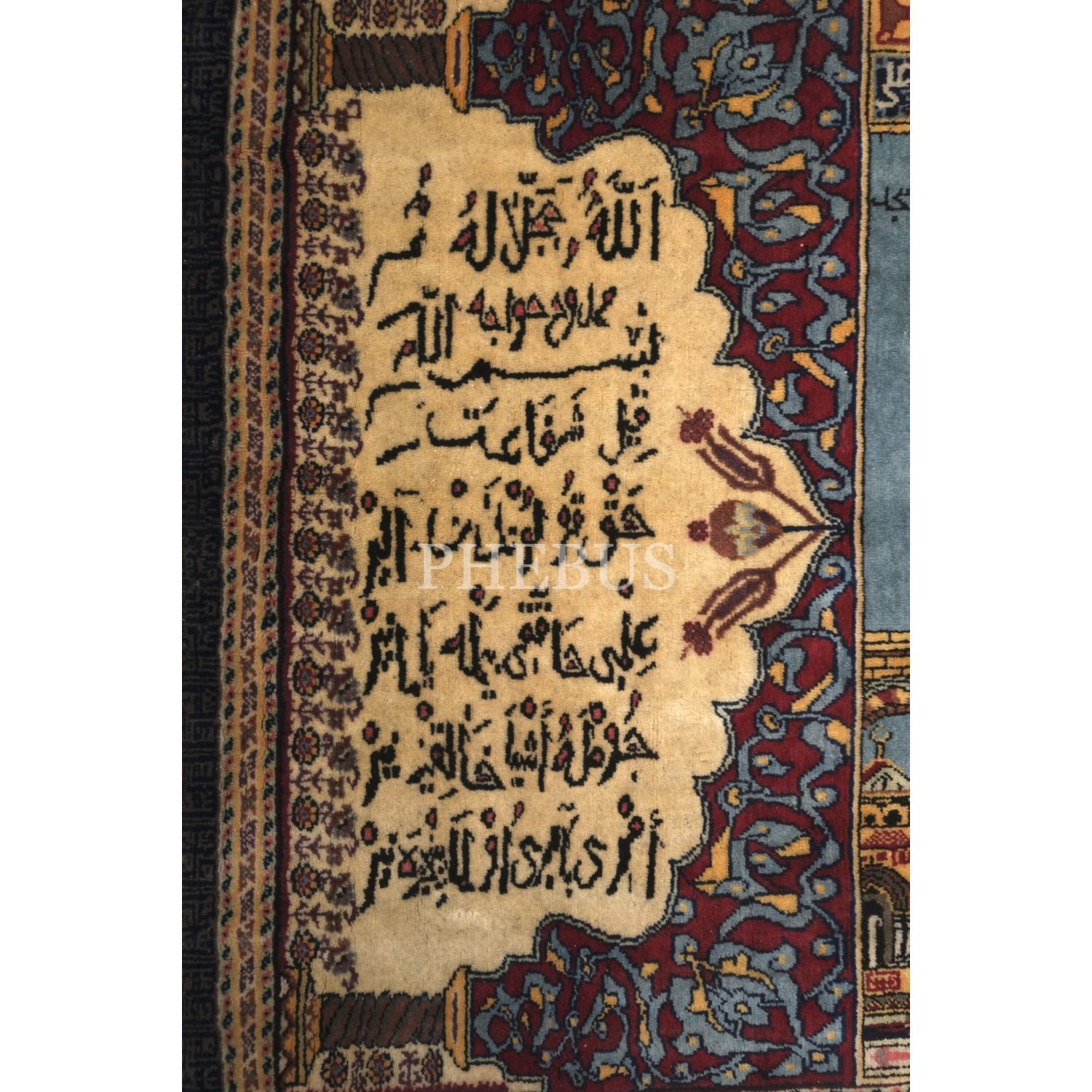Kabe-i Muazzama, Ravza-i Mutahhara ve Kudüs´ten minber görüntüsünün işlendiği halı. Üst kısımda Arapça olarak "Üç mescitten başkası için yolculuk edilmez: Mescid-i Haram, benim Mescid´im ve Mescid-i Aksâ" hadisi yazılıdır. Hadisin sağ ve solunda lafza-i celâl ile ism-i nebî ile hulefâ-i râşidînin adları yazılıdır.