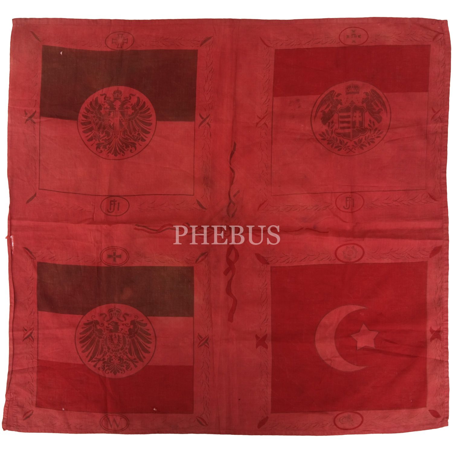 I. Dünya Savaşı dönemi, Osmanlı Devleti, Avusturya Macaristan İmaparatorluğu, Alman İmparatorluğu ve Bulgaristan Krallığı´ndan oluşan İttifak devletlerinin armalarından oluşan İttifak hatırası bayrak, 70x67 cm...
