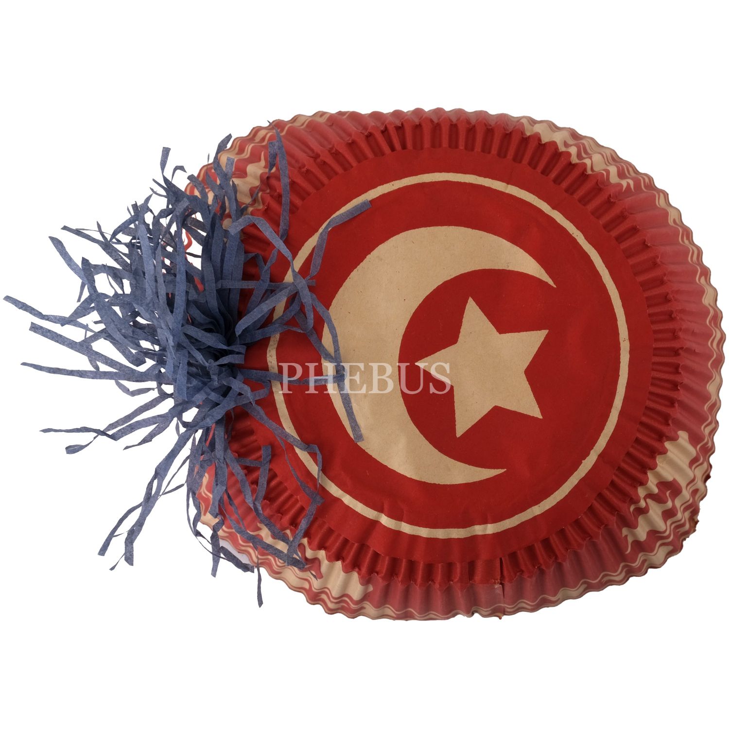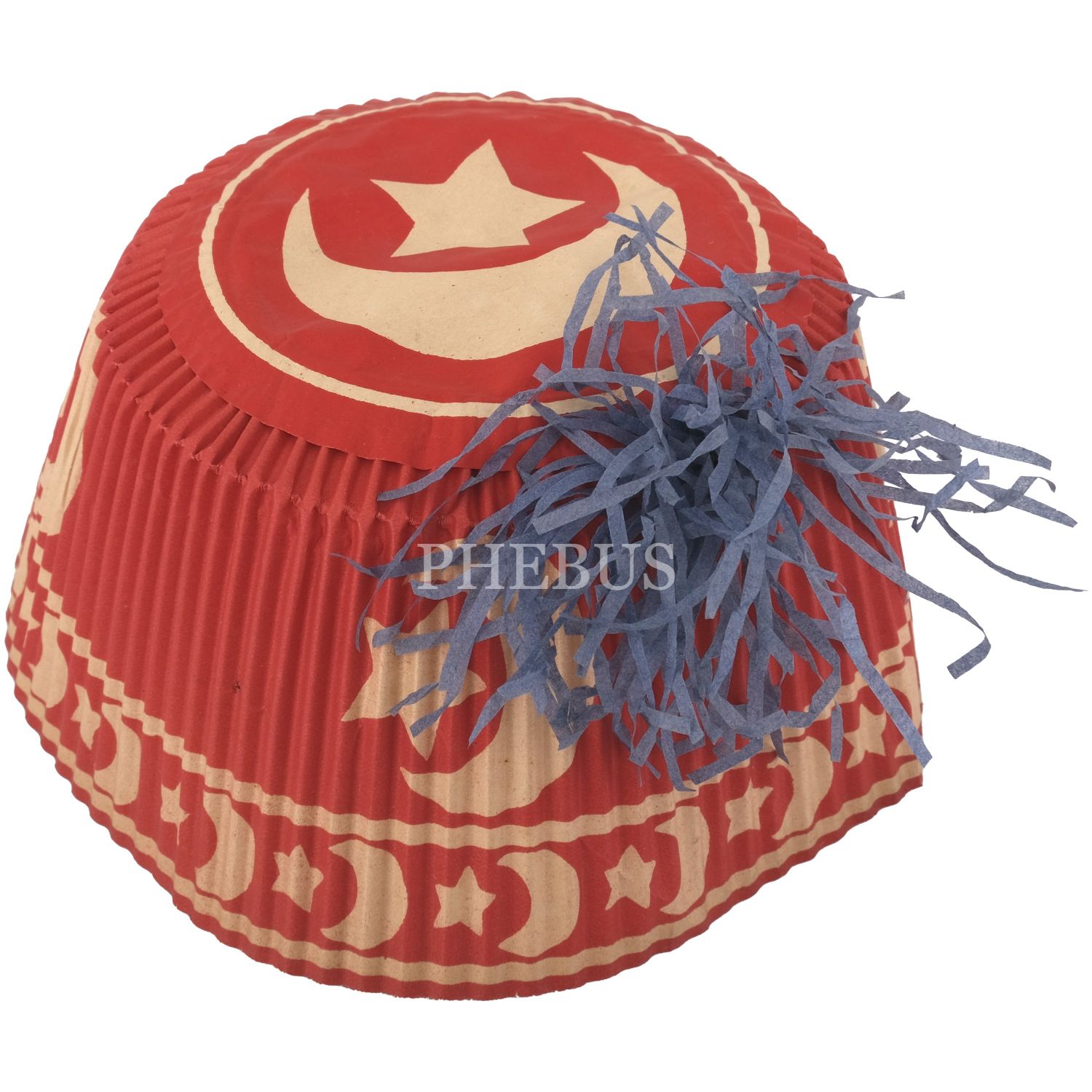 II. Meşrutiyet döneminde karnavallarda ve kutlamalarda kullanılan ay-yıldız motifli ve püskül detaylı kâğıt fes, 10x16 cm...