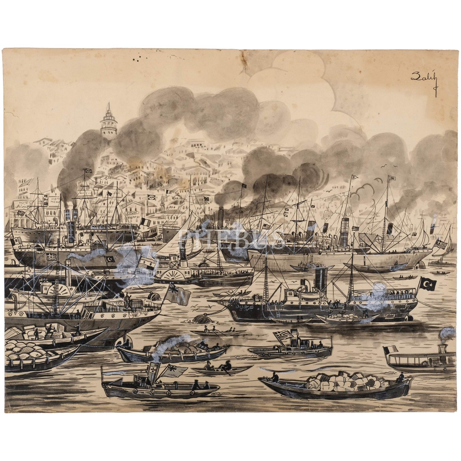 Salih (Erimez) imzalı, İstanbul´un işgal altında olduğu dönemlerde, Karaköy Limanı´nda İngiliz flamalı ve Osmanlı flamalı gemilerin resmedildiği orijinal çizim, 62x50 cm...