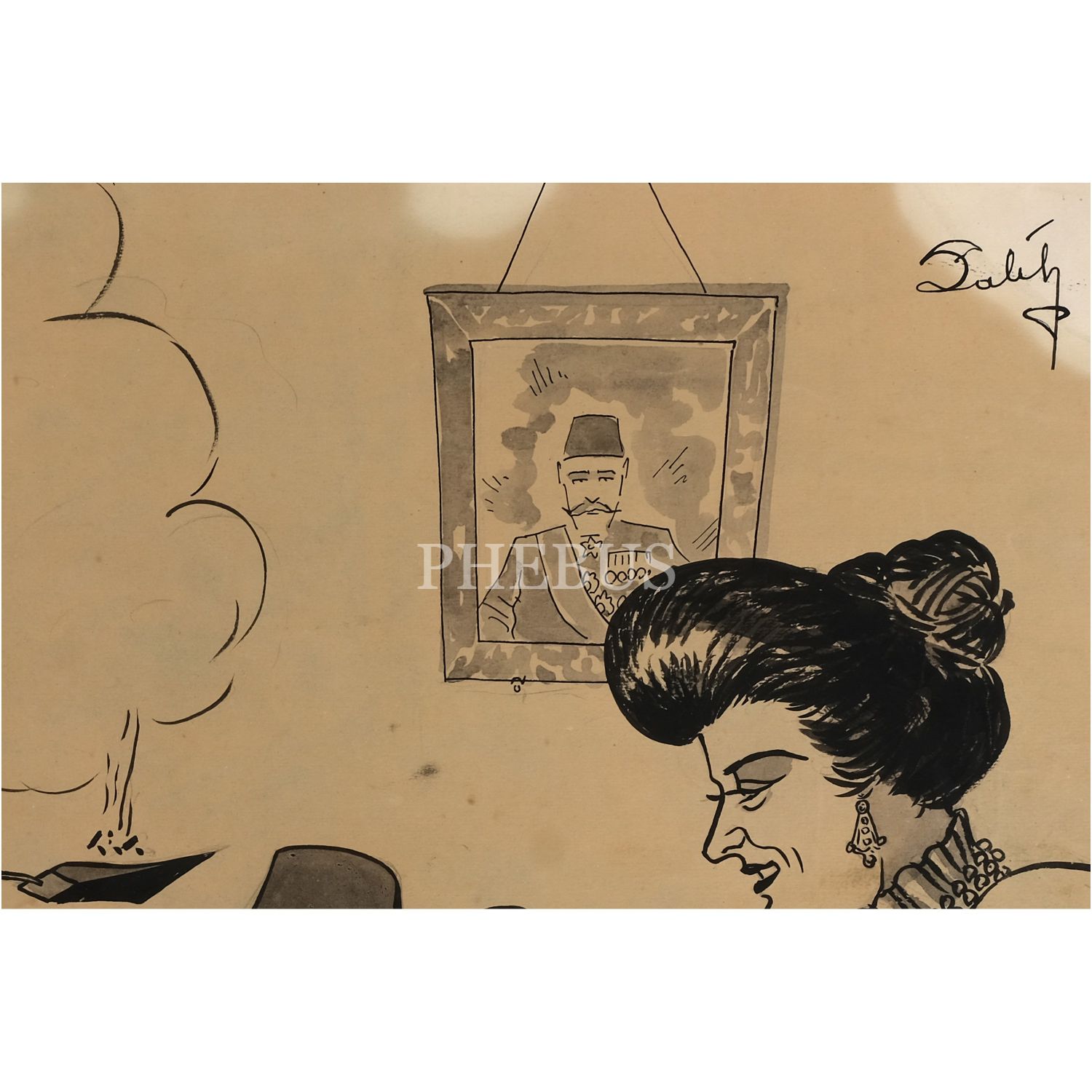 Salih (Erimez) imzalı, Sultan İkinci Abdülhamid'in nazara karşı üzerlik otu tüttürmesinin resmedildiği orijinal çizim, 62x50 cm...
