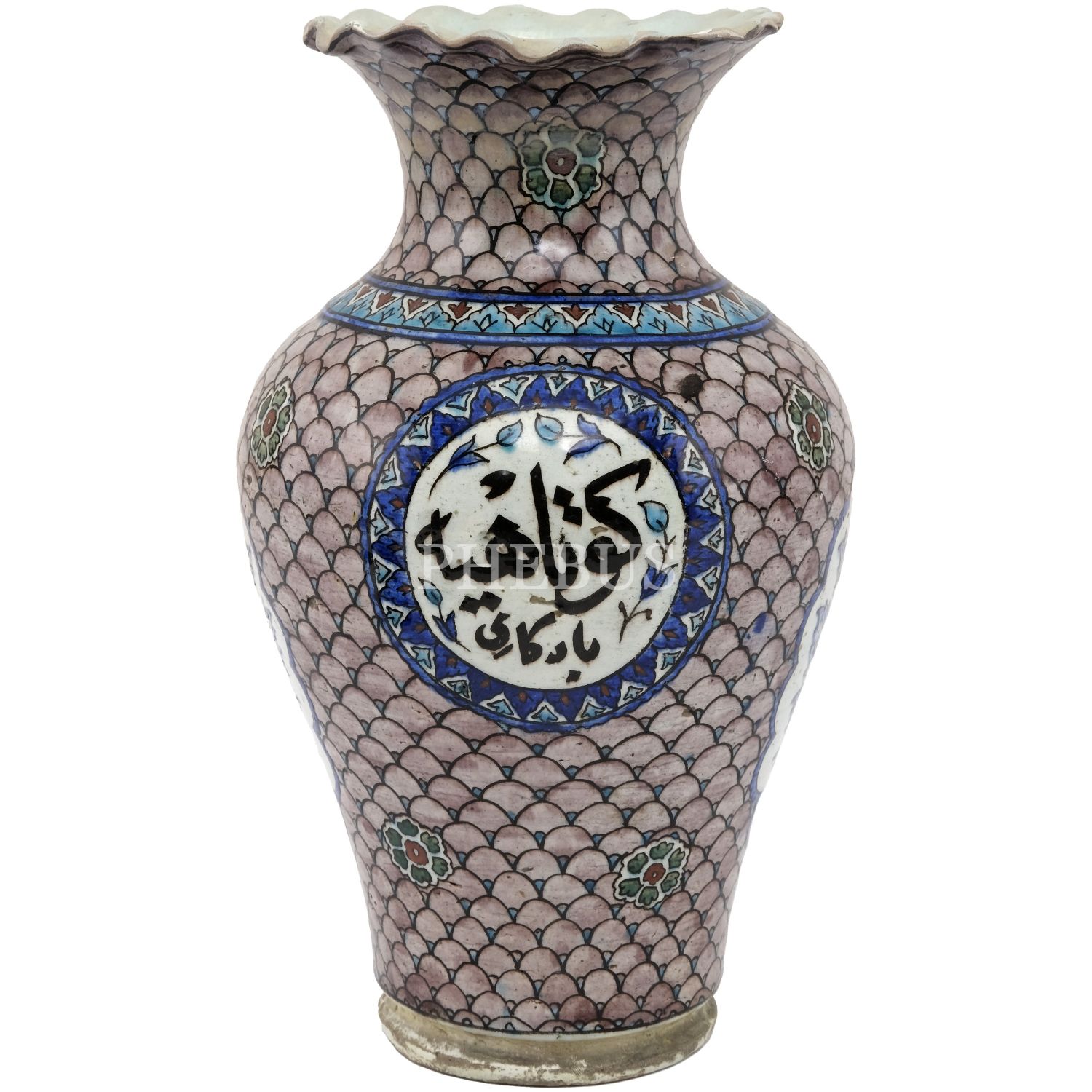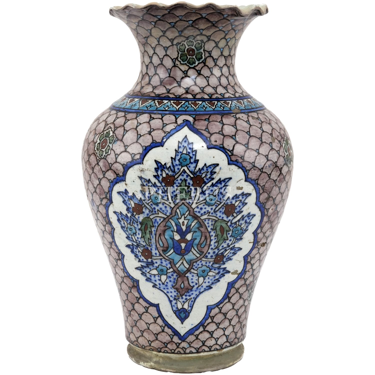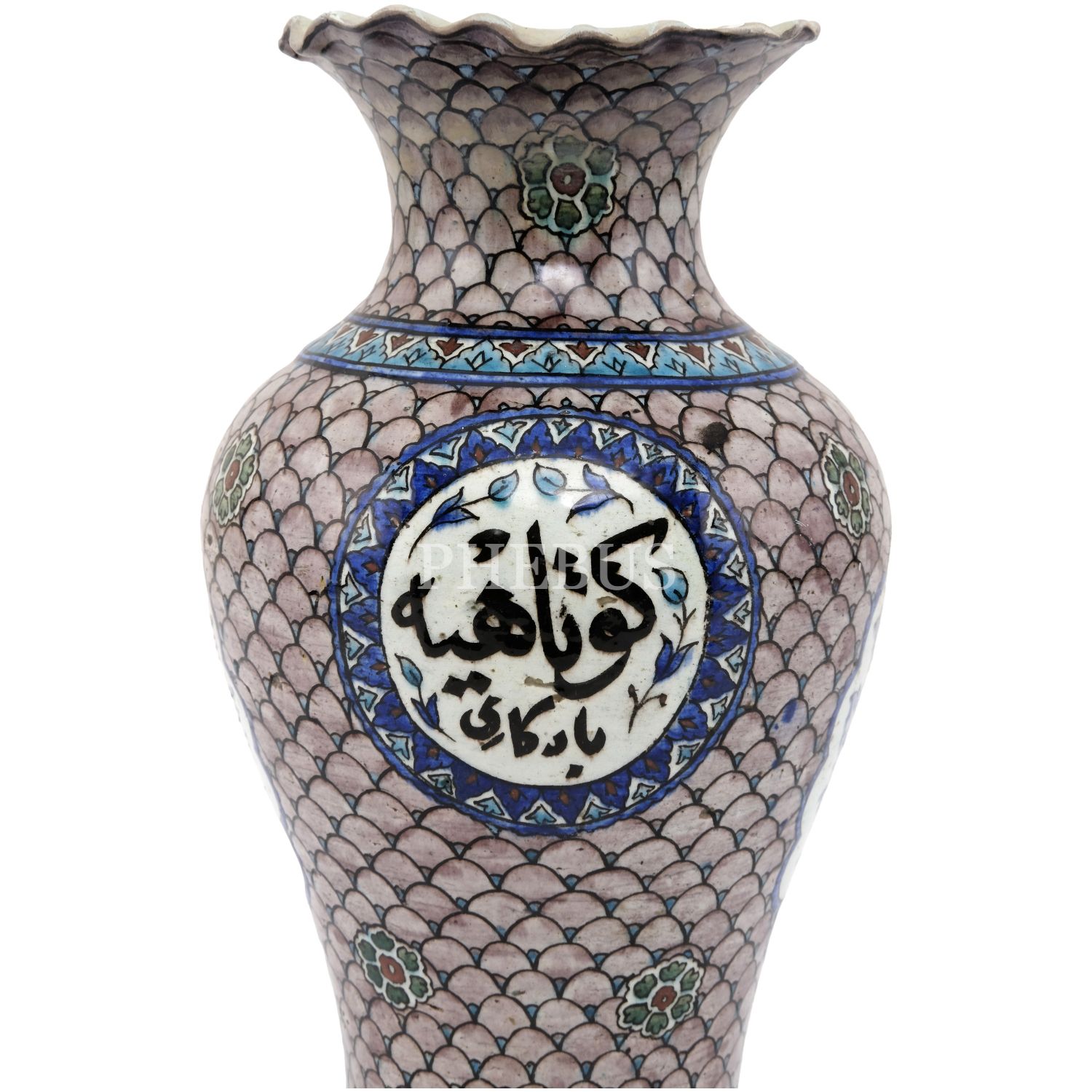 Kütahya işi çini motifleriyle bezeli, merkezi "Kütahya Yadigarı" yazılı el boyama seramik vazo, çap 13 cm, yükseklik 31 cm...