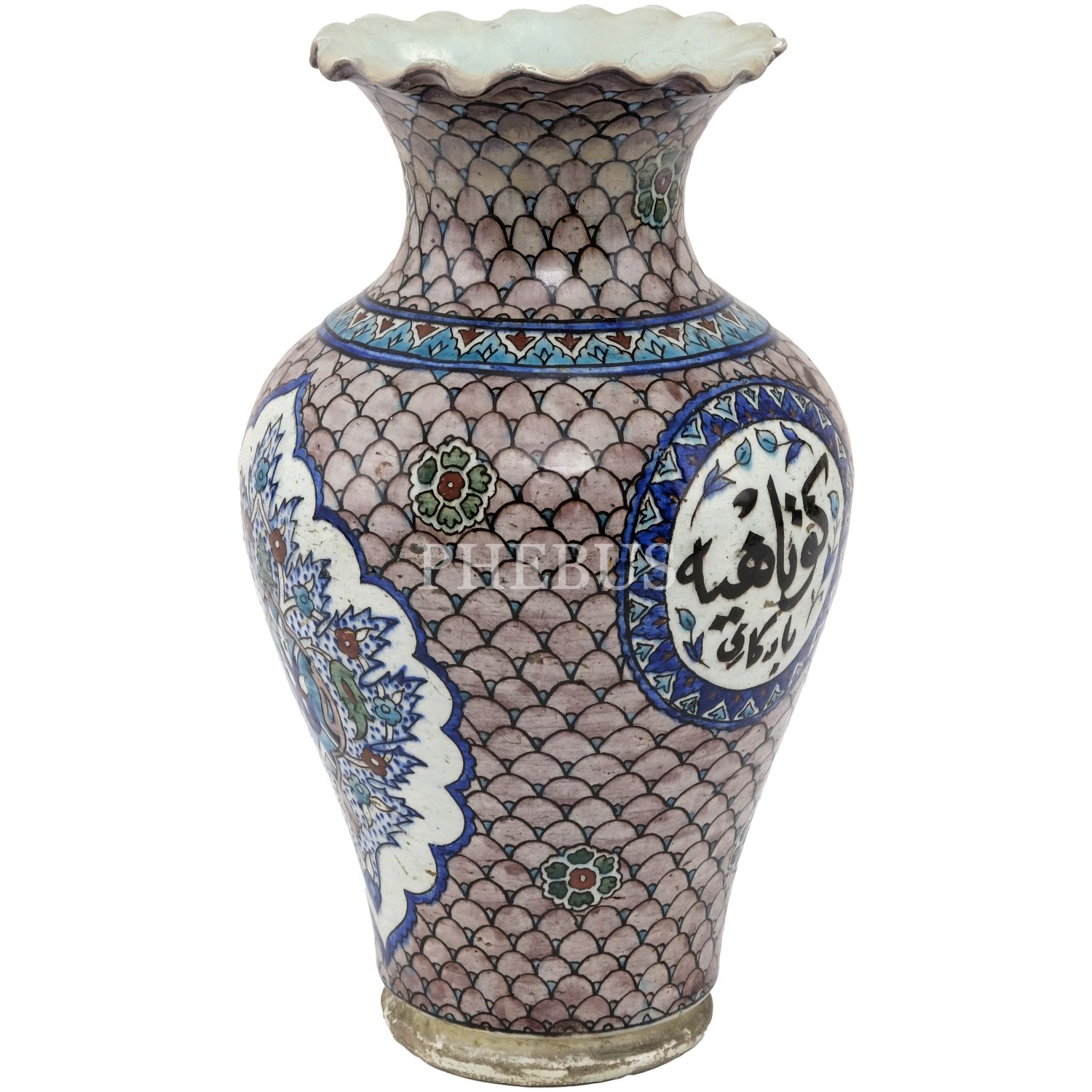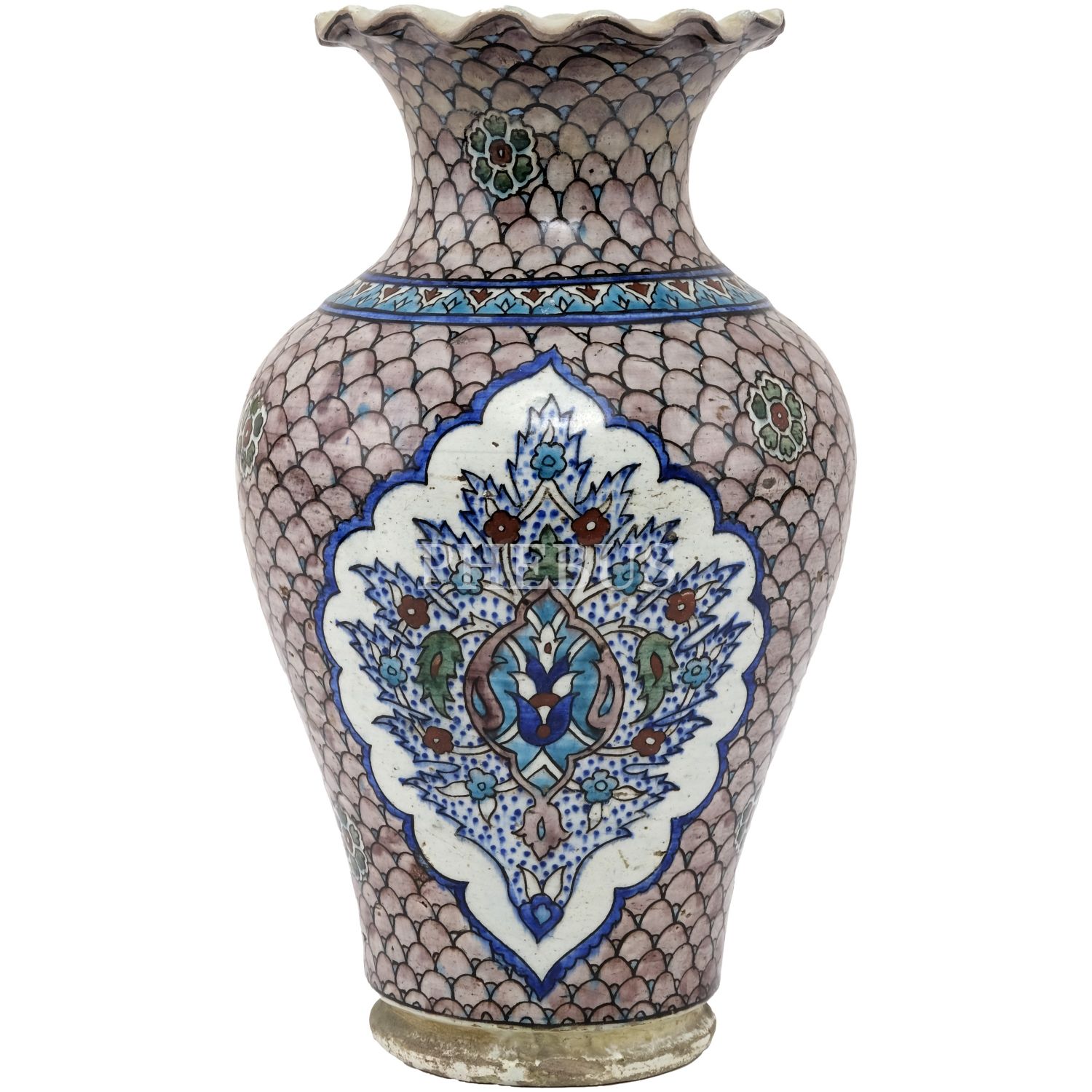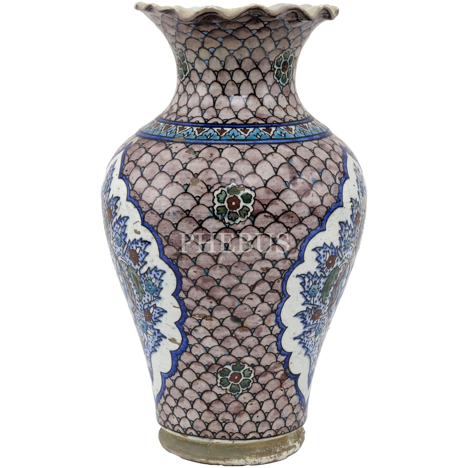Kütahya işi çini motifleriyle bezeli, merkezi "Kütahya Yadigarı" yazılı el boyama seramik vazo, çap 13 cm, yükseklik 31 cm...