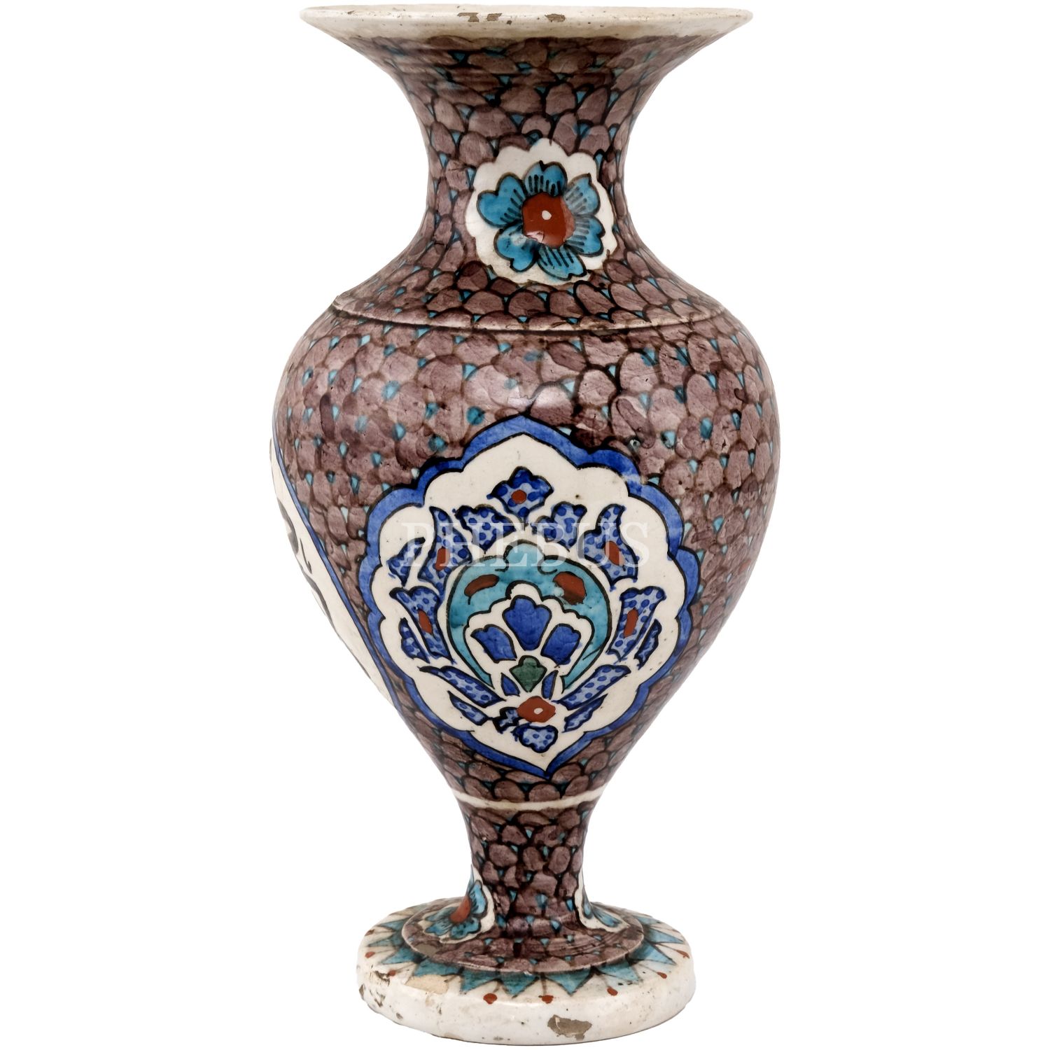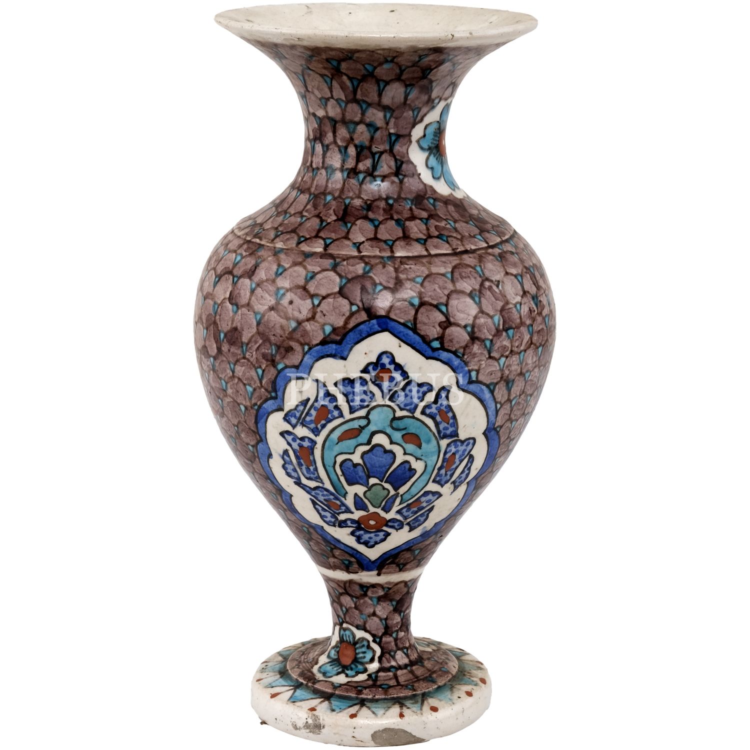 Kütahya işi çini motifleriyle bezeli, merkezi "Kütahya Yadigarı" yazılı el boyama seramik vazo, çap 13 cm, yükseklik 31 cm...