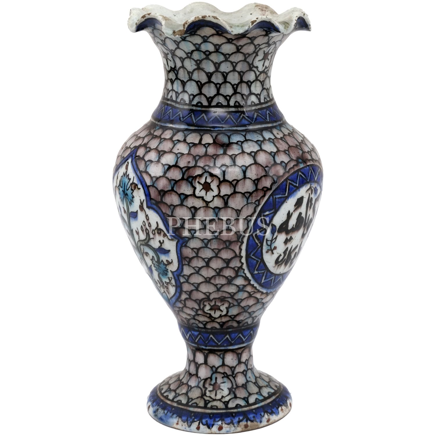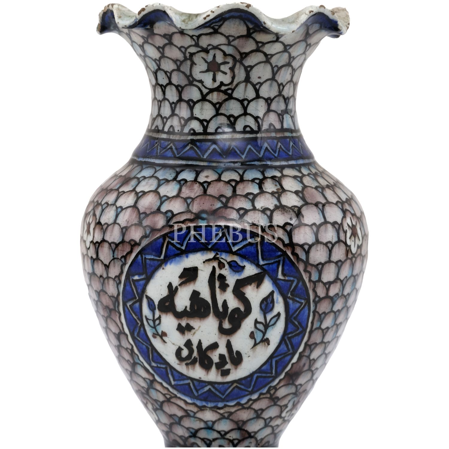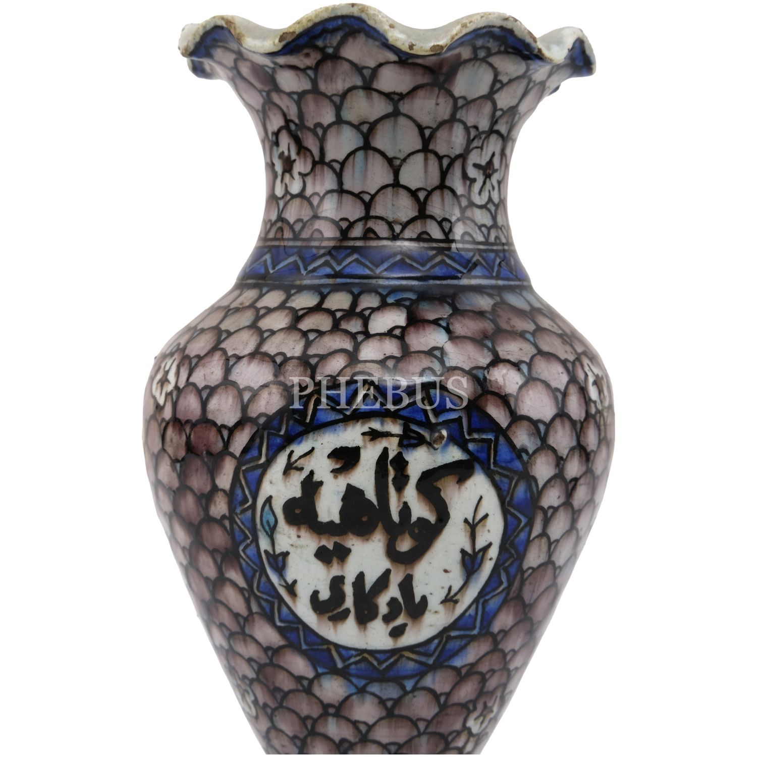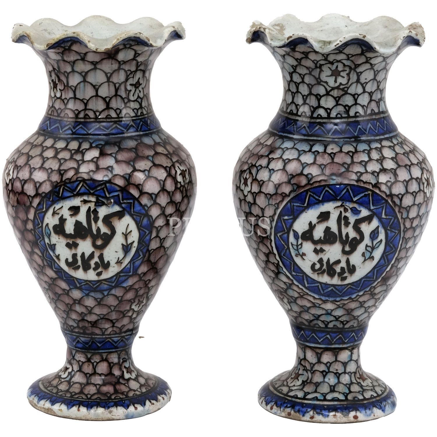 Kütahya işi çini motifleriyle bezeli, merkezi "Kütahya Yadigarı" yazılı el boyama seramik bir çift vazo, çap 8 cm, yükseklik 18 cm...