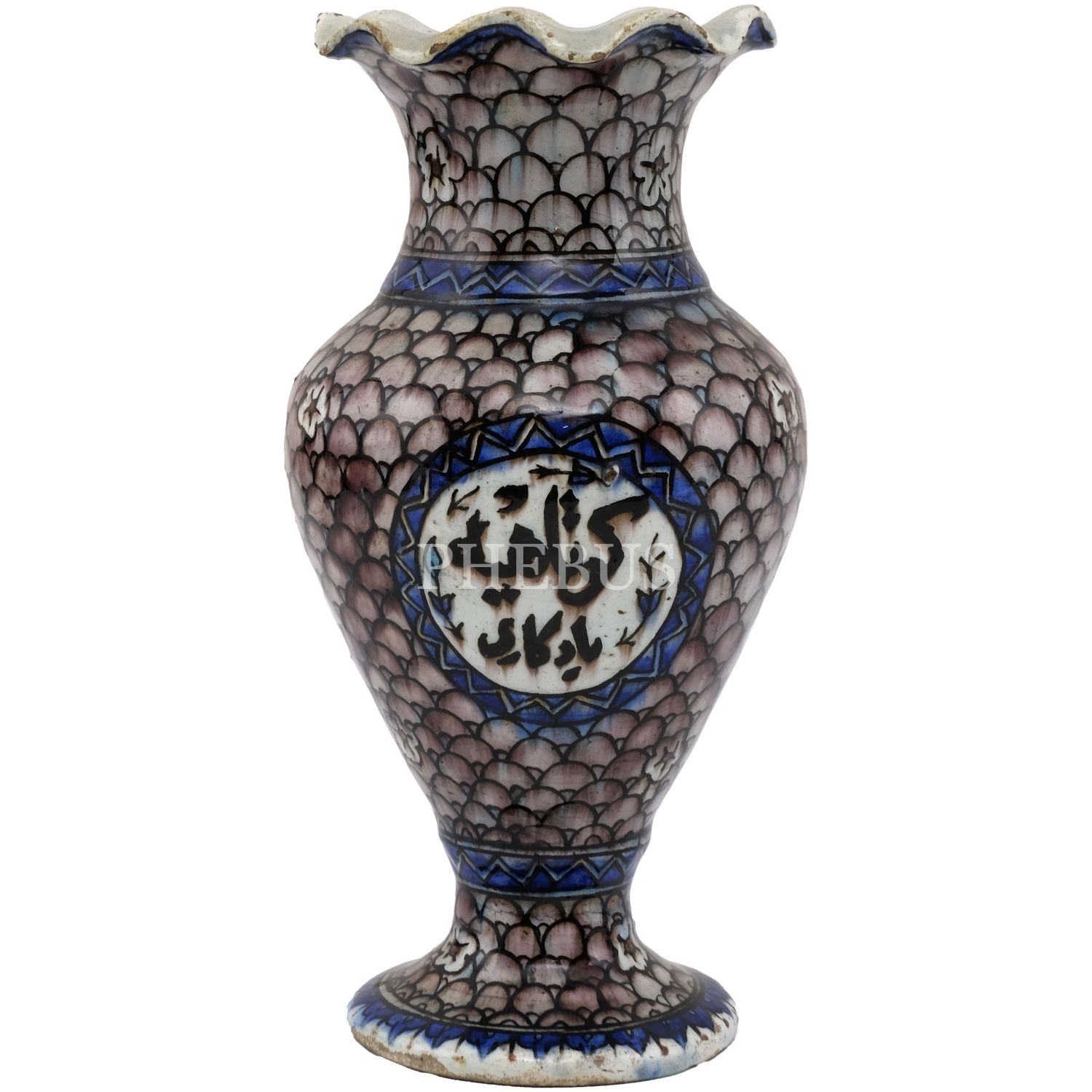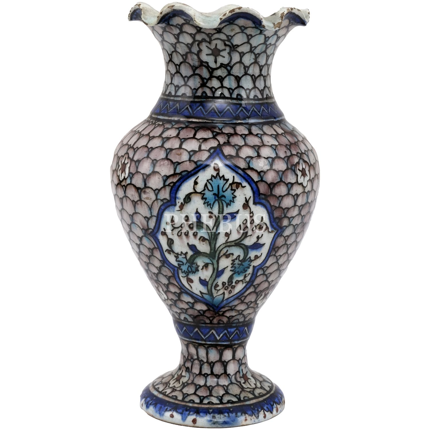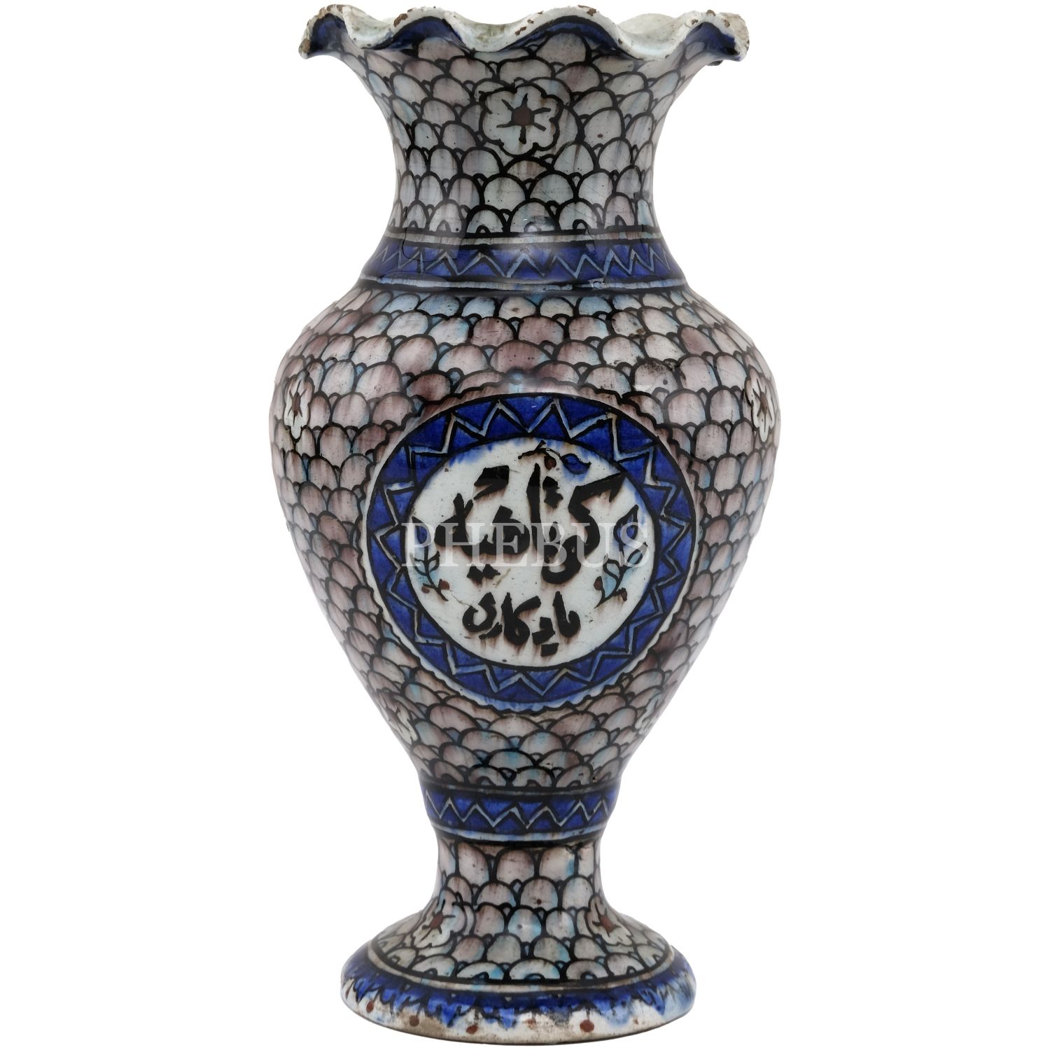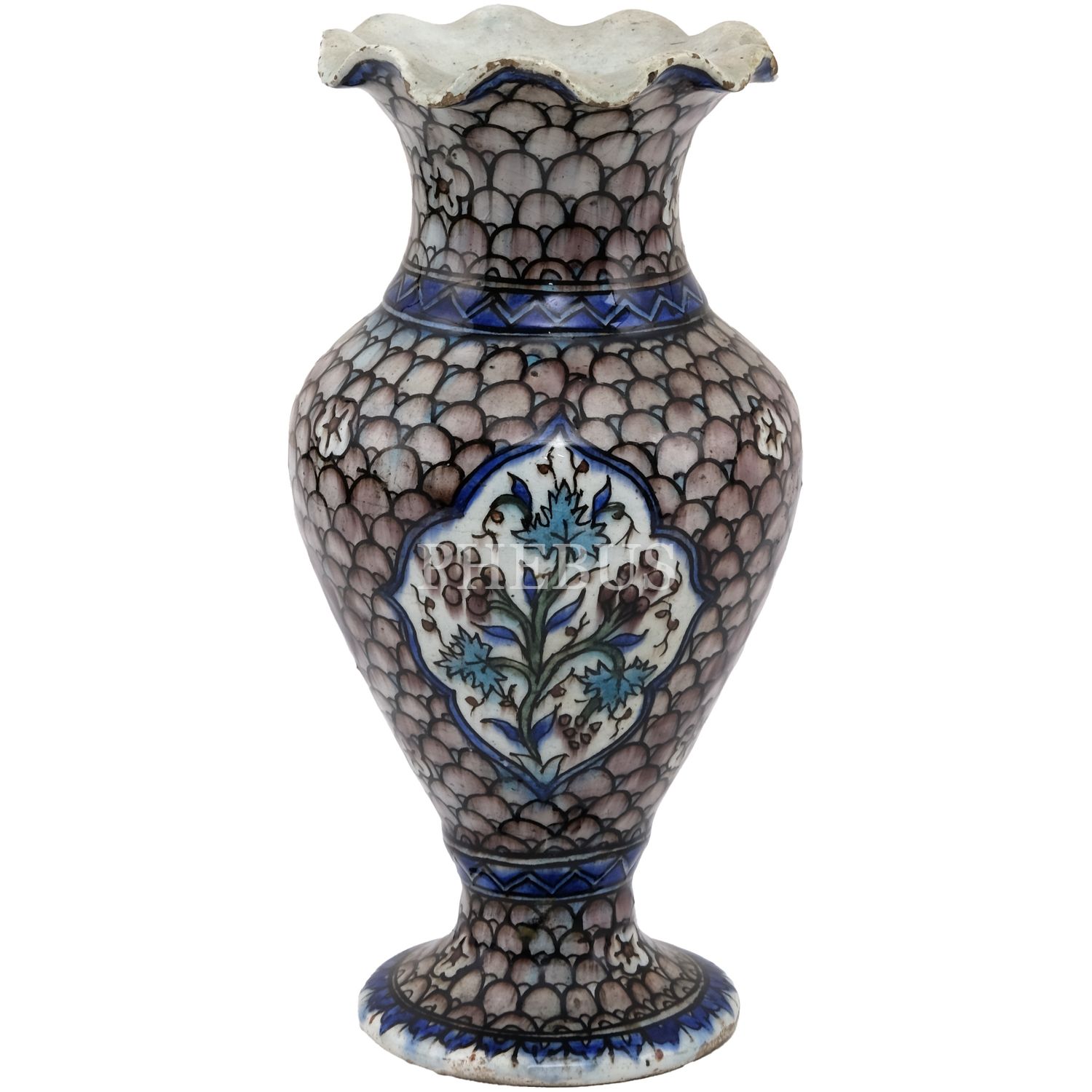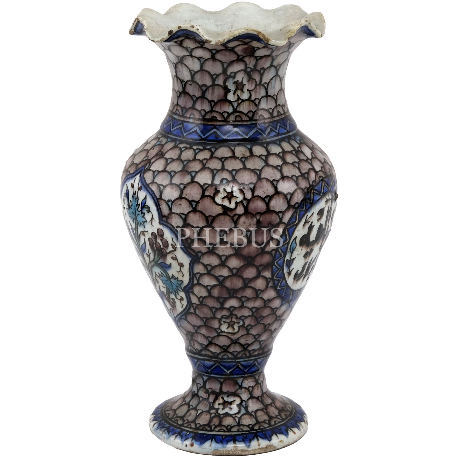 Kütahya işi çini motifleriyle bezeli, merkezi "Kütahya Yadigarı" yazılı el boyama seramik bir çift vazo, çap 8 cm, yükseklik 18 cm...
