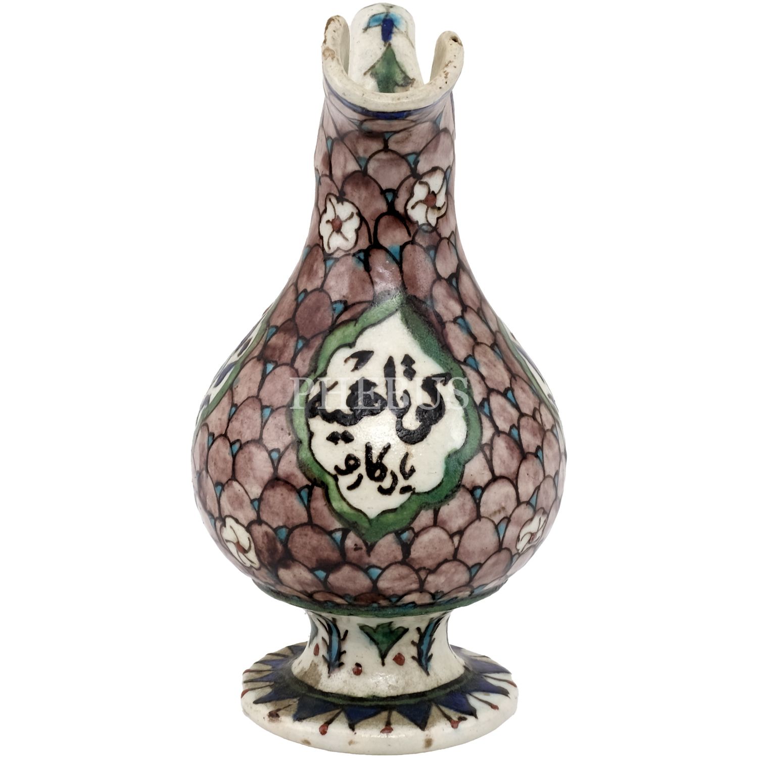 Kütahya işi çini motifleriyle bezeli, merkezi "Kütahya Yadigarı" yazılı el boyama seramik saleplik, yükseklik 17 cm...