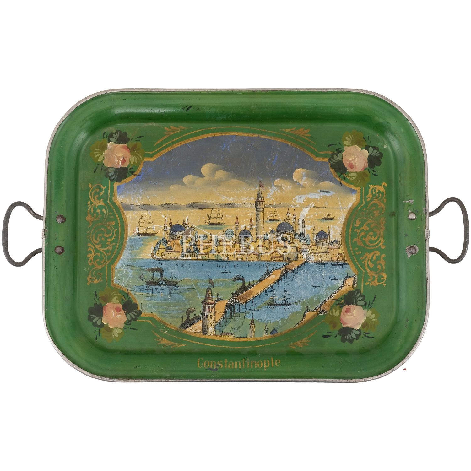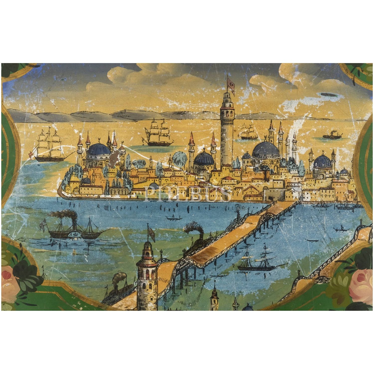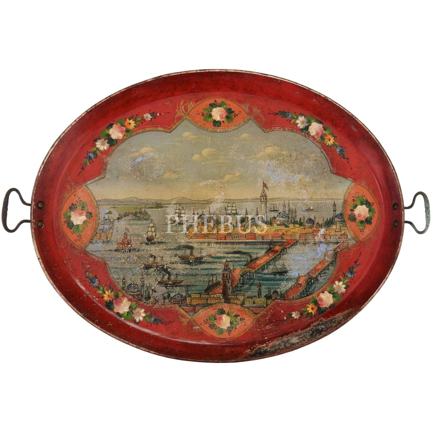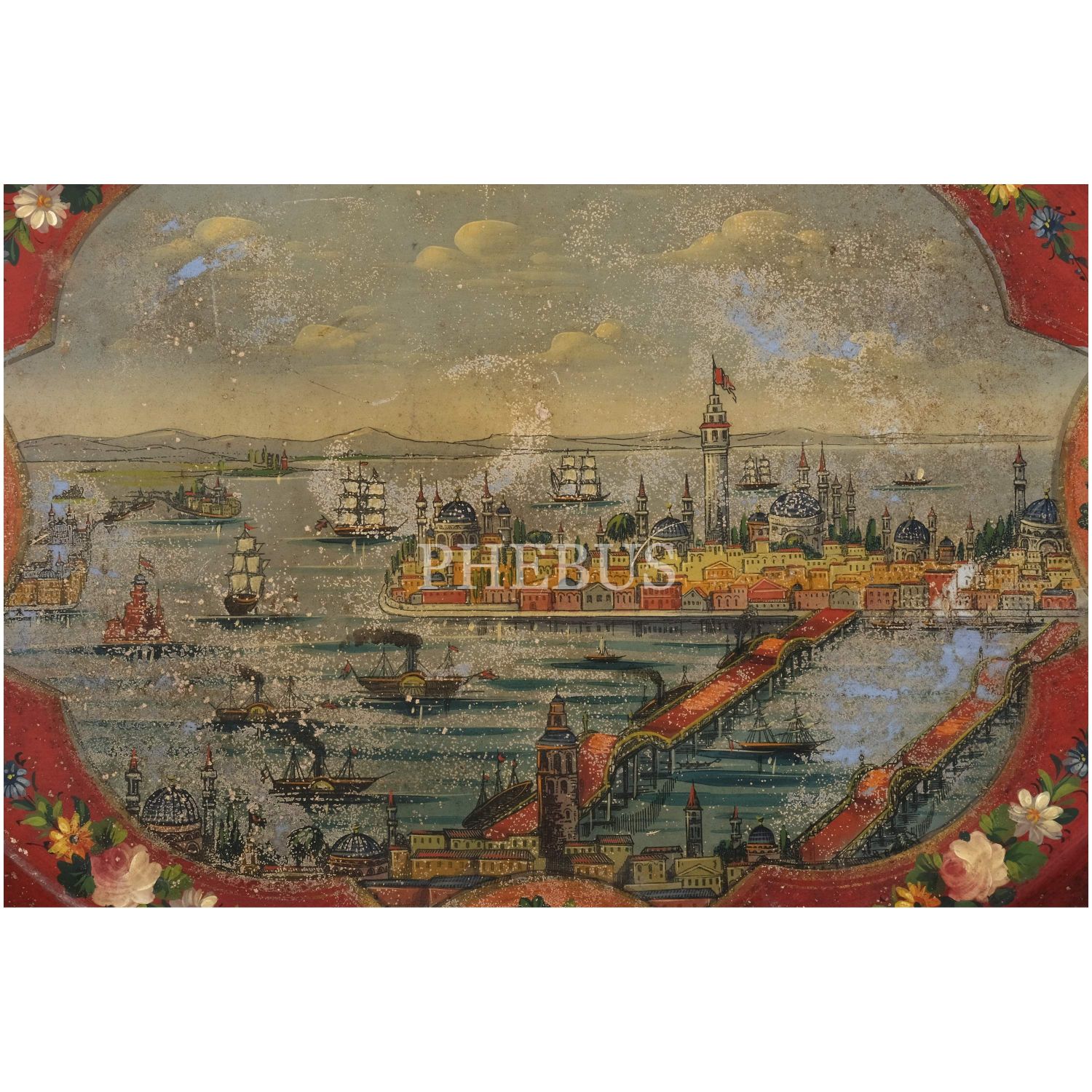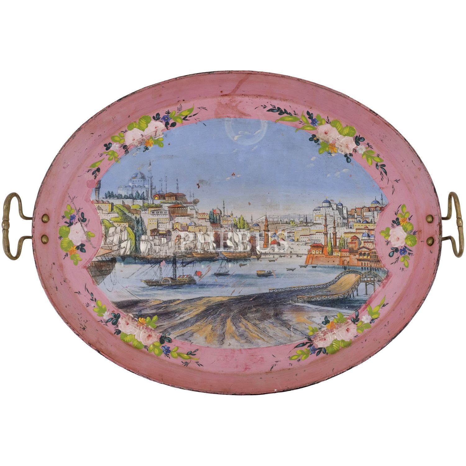 İkisi Dolmabahçe Sarayı, üçü Haliç tasvirli, her biri floral motiflerle dekore edilmiş 5 adet pulat tepsi, büyükten küçüğe 58x47 cm, 58x46 cm, 57x44 cm, 52x42 cm, 45x35 cm...