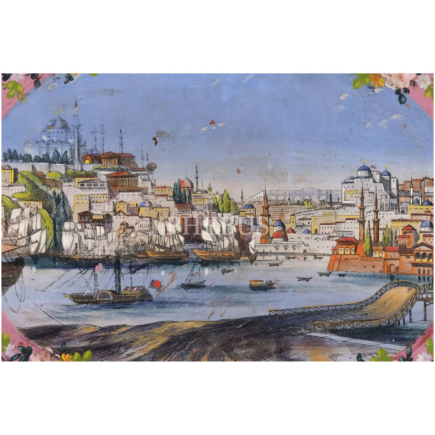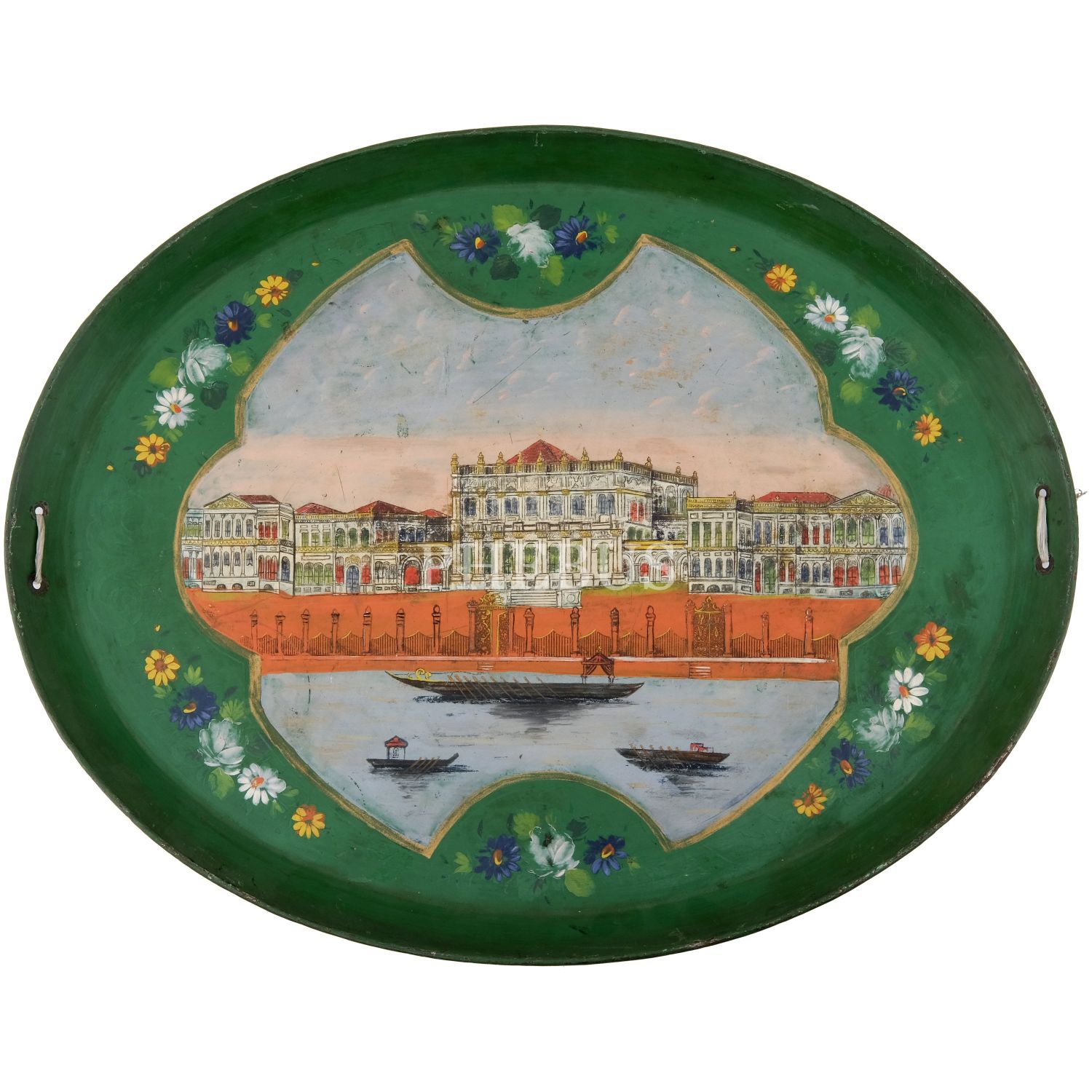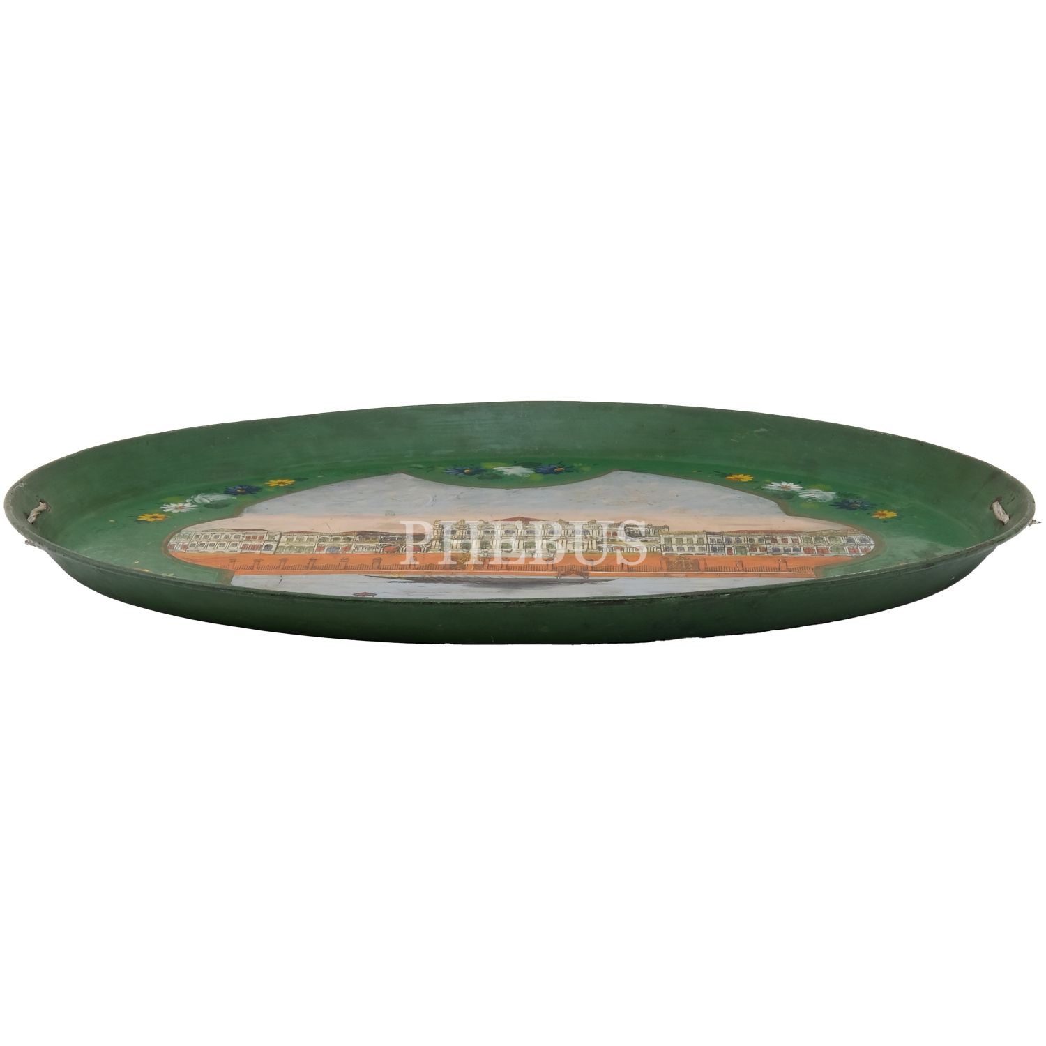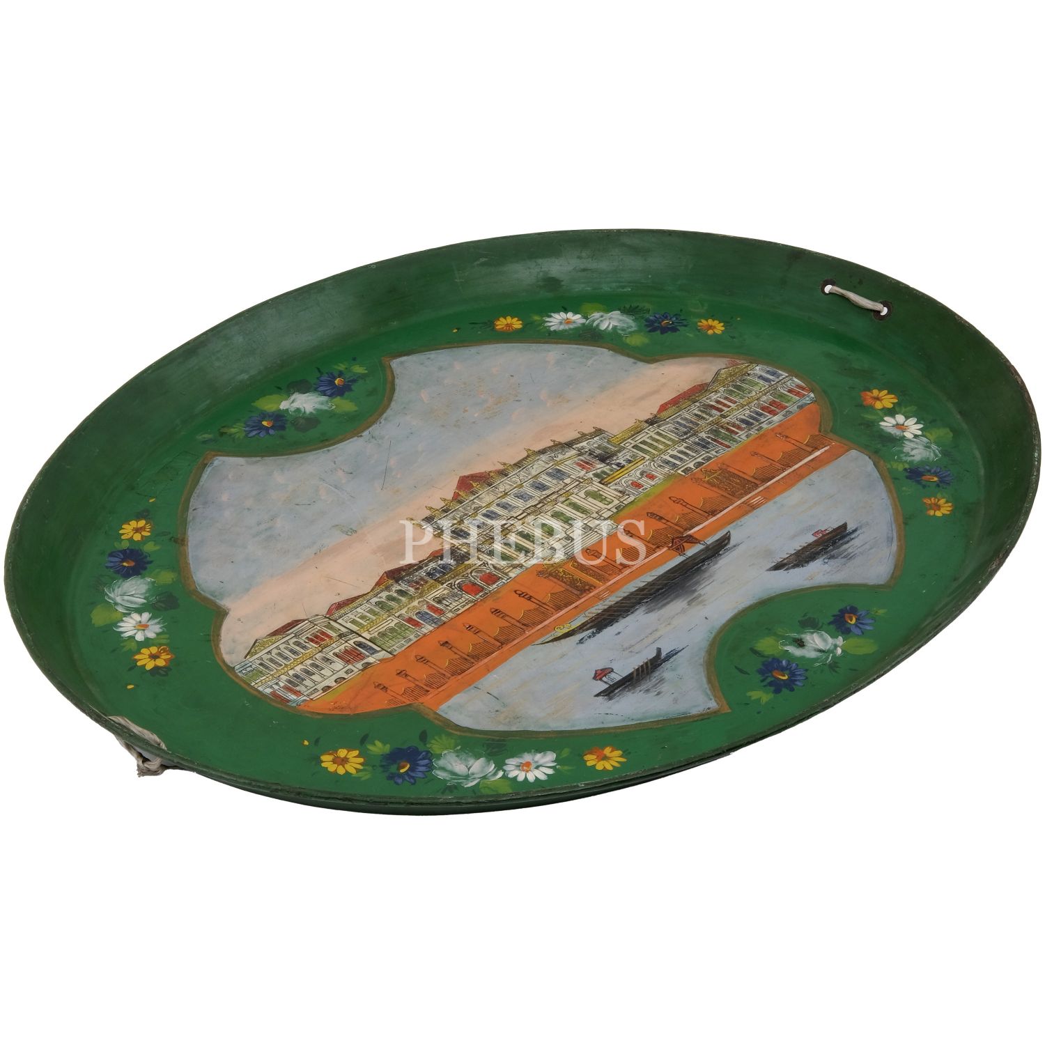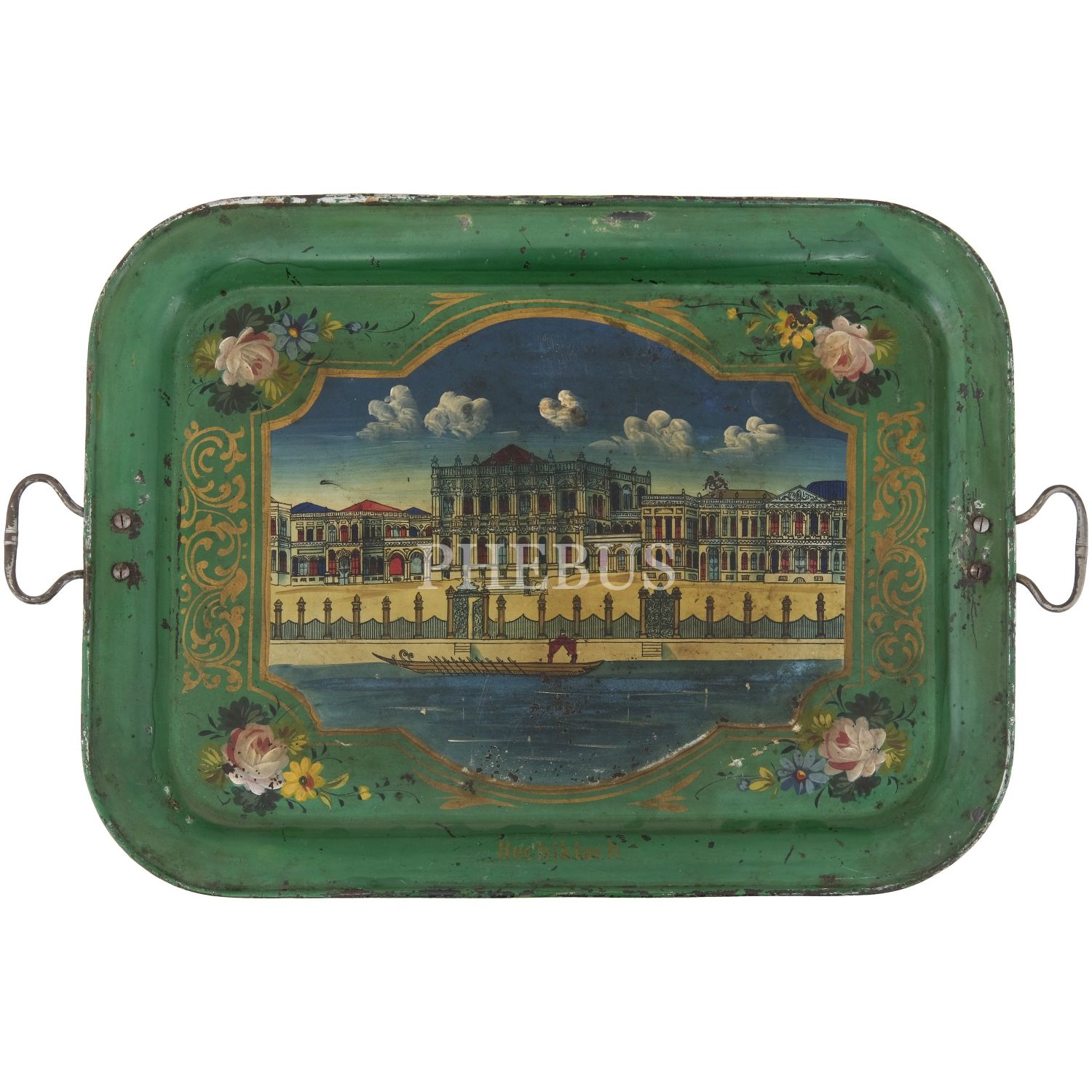 İkisi Dolmabahçe Sarayı, üçü Haliç tasvirli, her biri floral motiflerle dekore edilmiş 5 adet pulat tepsi, büyükten küçüğe 58x47 cm, 58x46 cm, 57x44 cm, 52x42 cm, 45x35 cm...