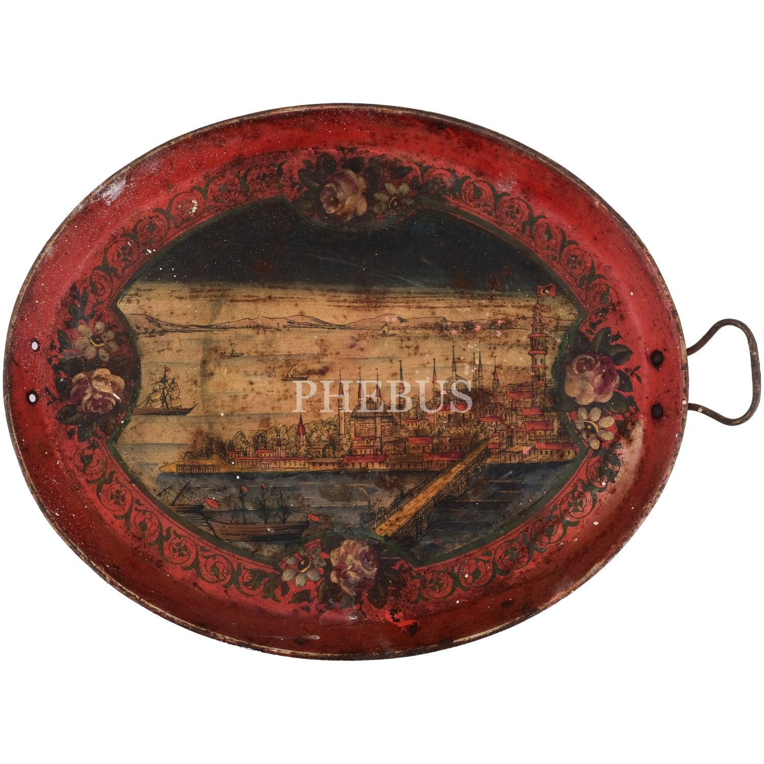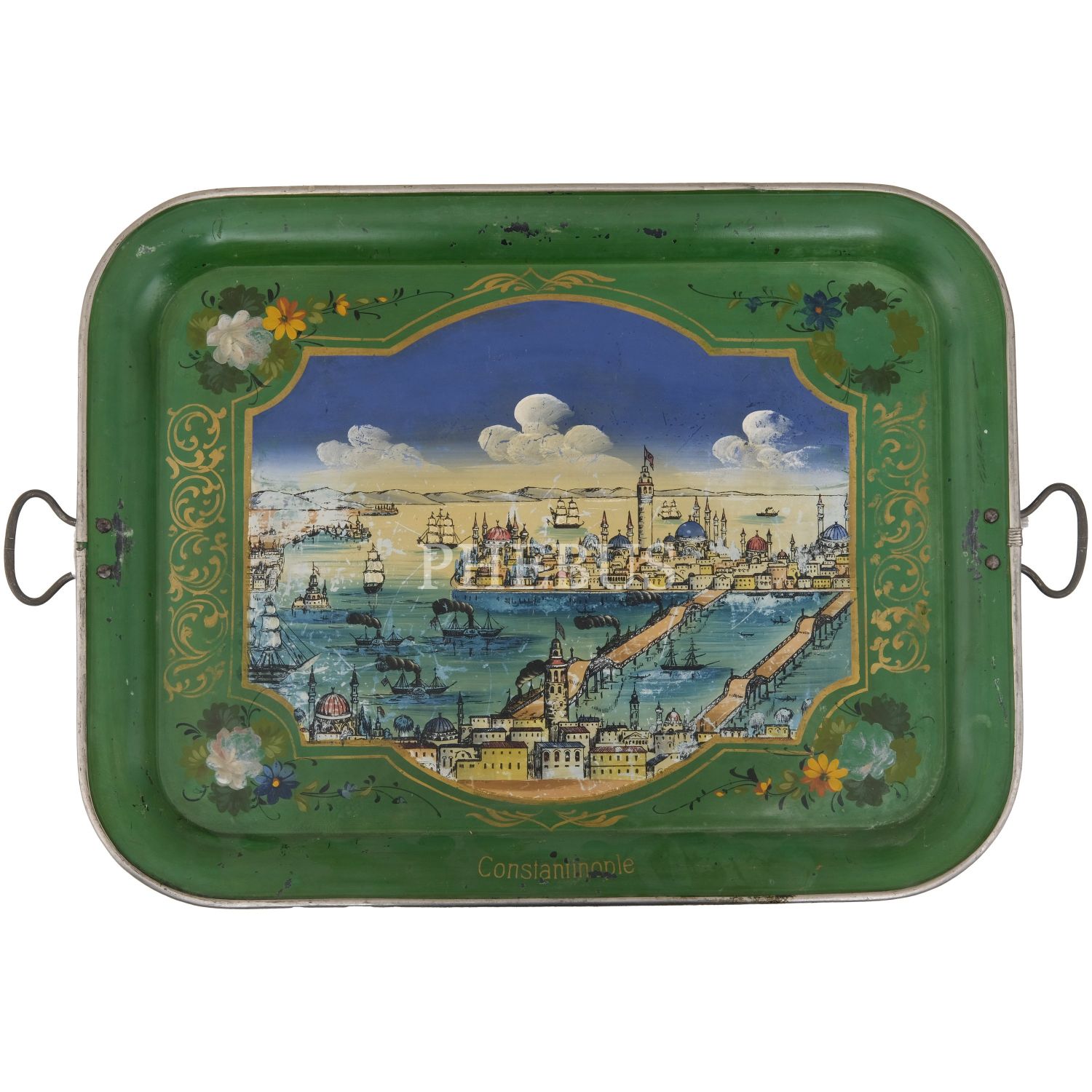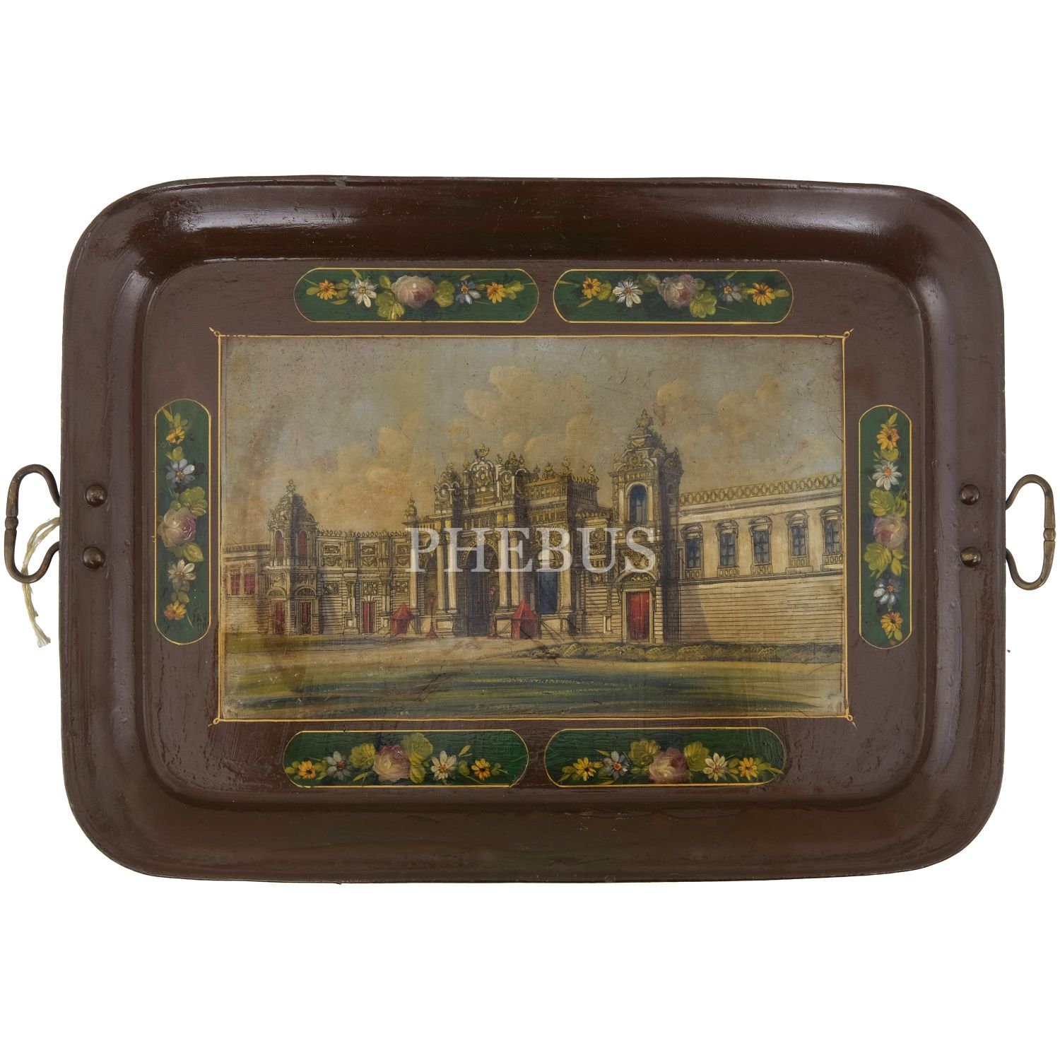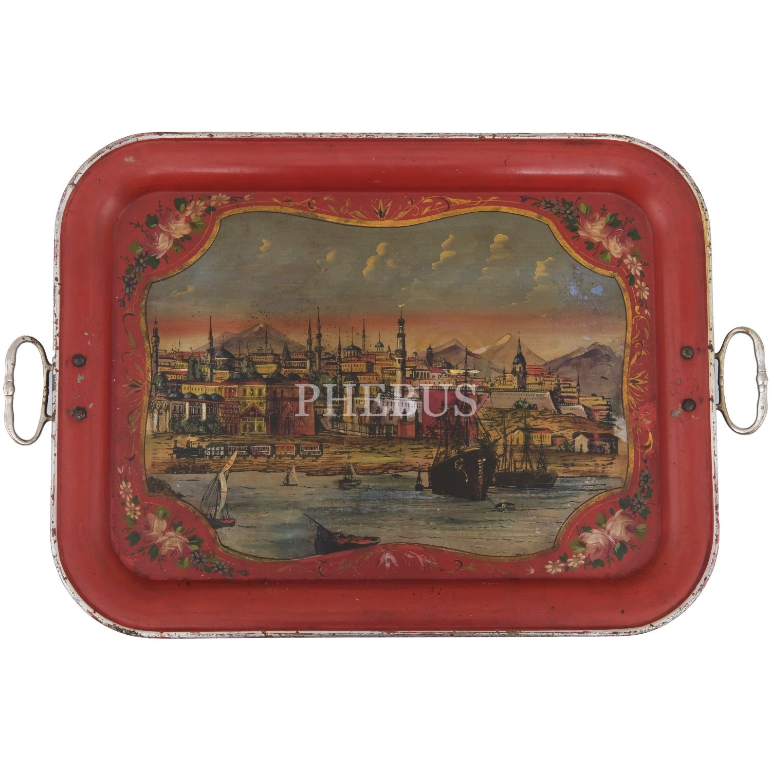 Dördü Haliç, biri Dolmabahçe Sarayı tasvirli, her biri floral motiflerle dekore edilmiş 5 adet pulat tepsi, büyükten küçüğe 62x48 cm, 58x46 cm, 57x43 cm, 50x37 cm, 41x34 cm...