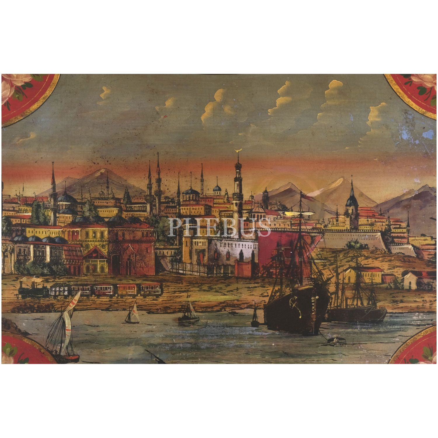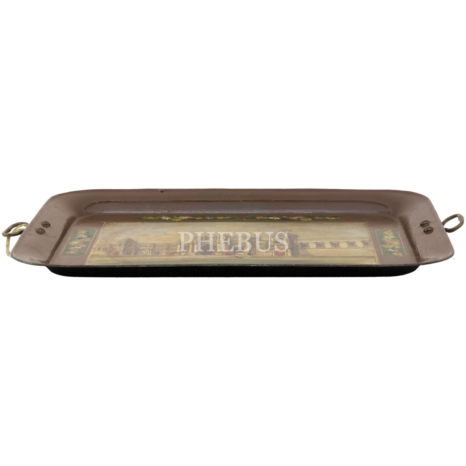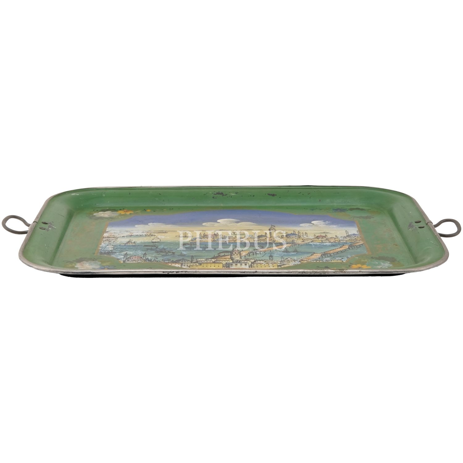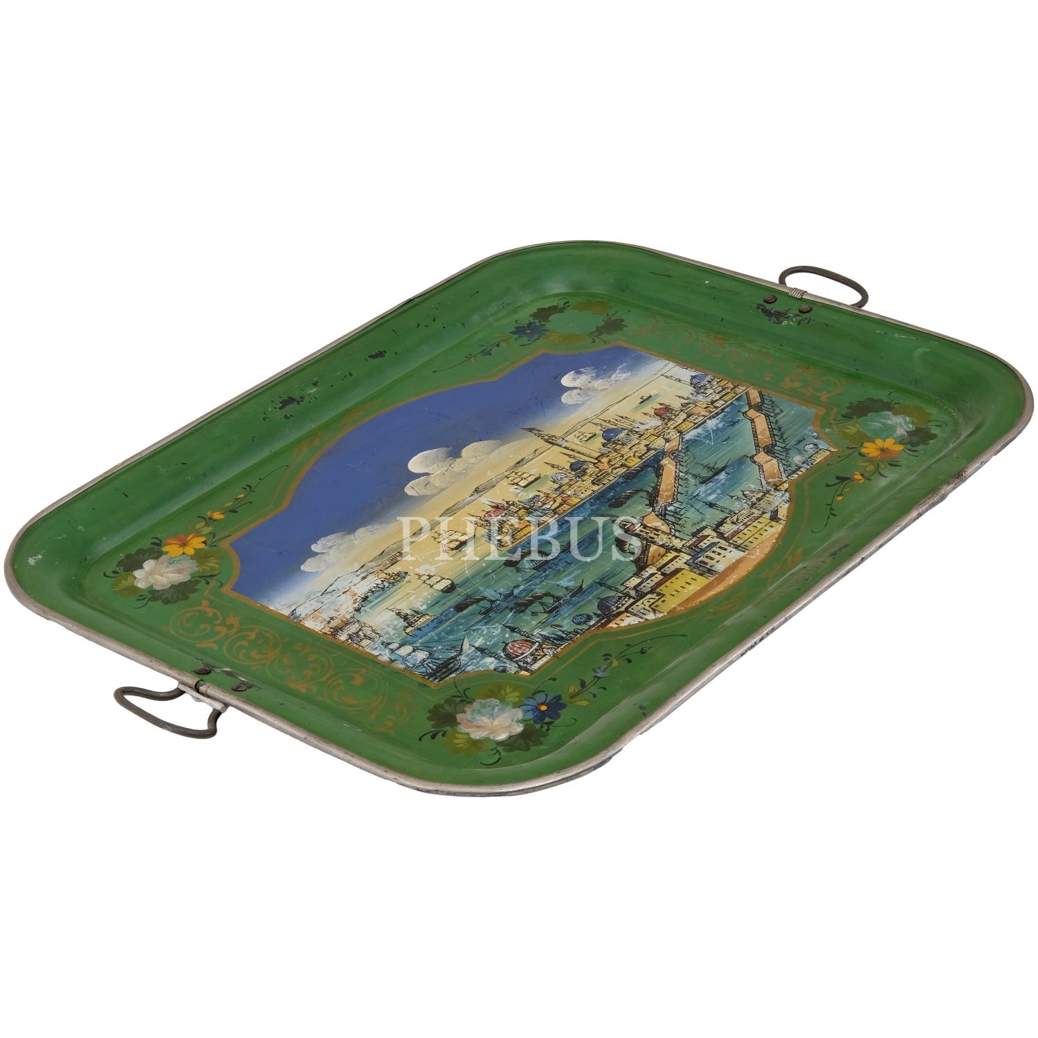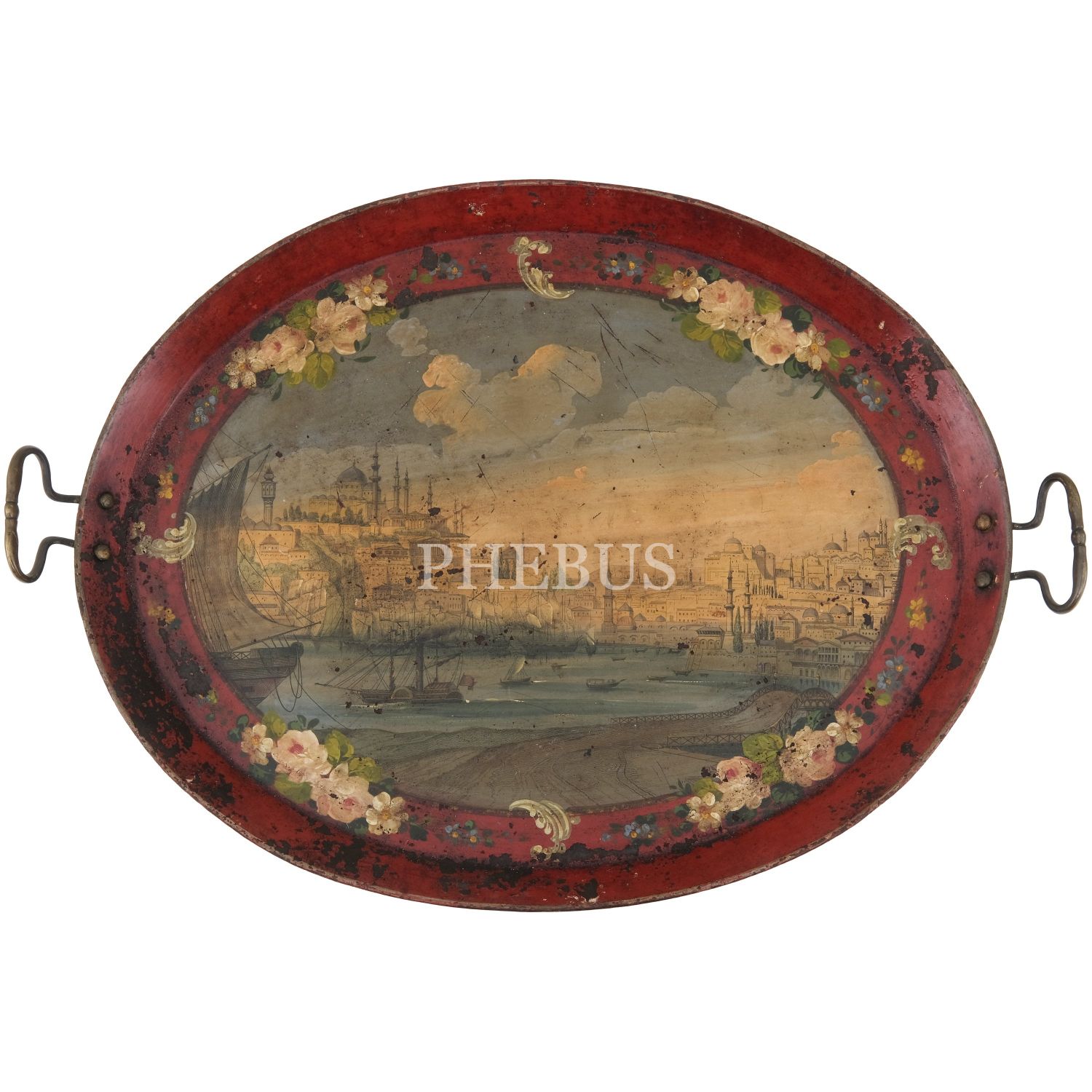 Dördü Haliç, biri Dolmabahçe Sarayı tasvirli, her biri floral motiflerle dekore edilmiş 5 adet pulat tepsi, büyükten küçüğe 62x48 cm, 58x46 cm, 57x43 cm, 50x37 cm, 41x34 cm...