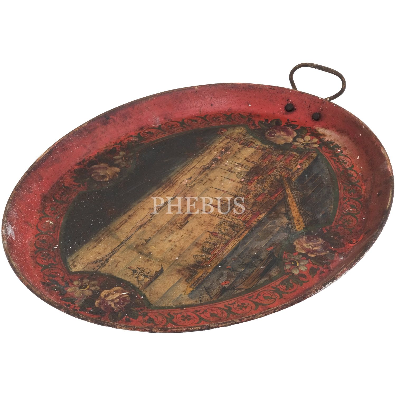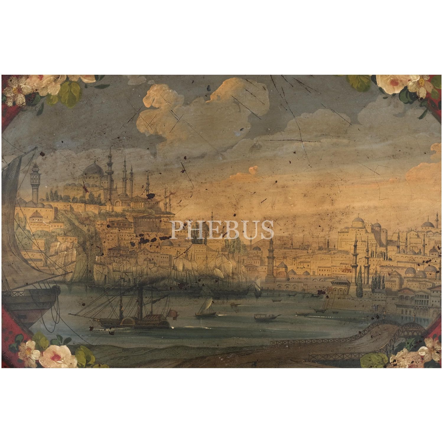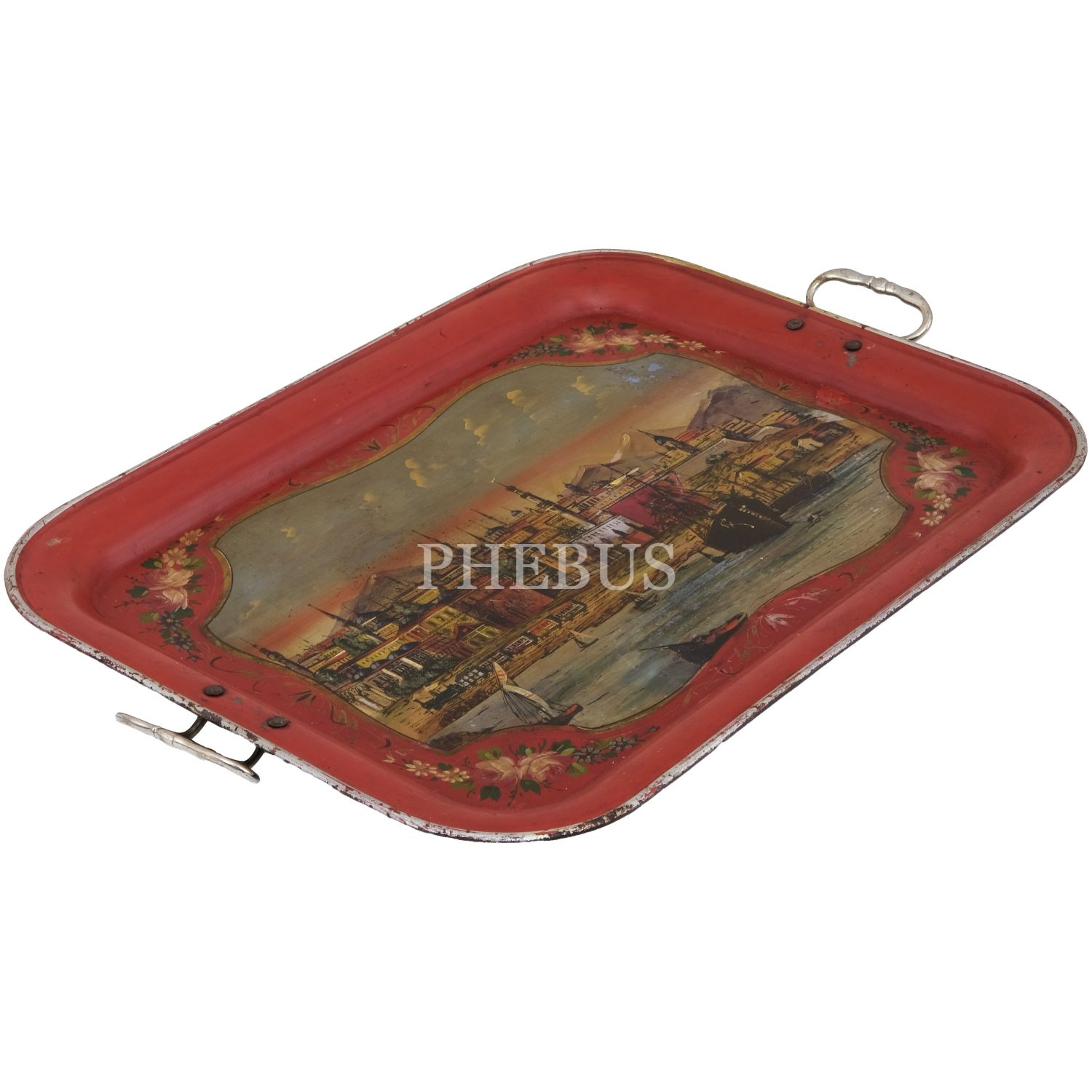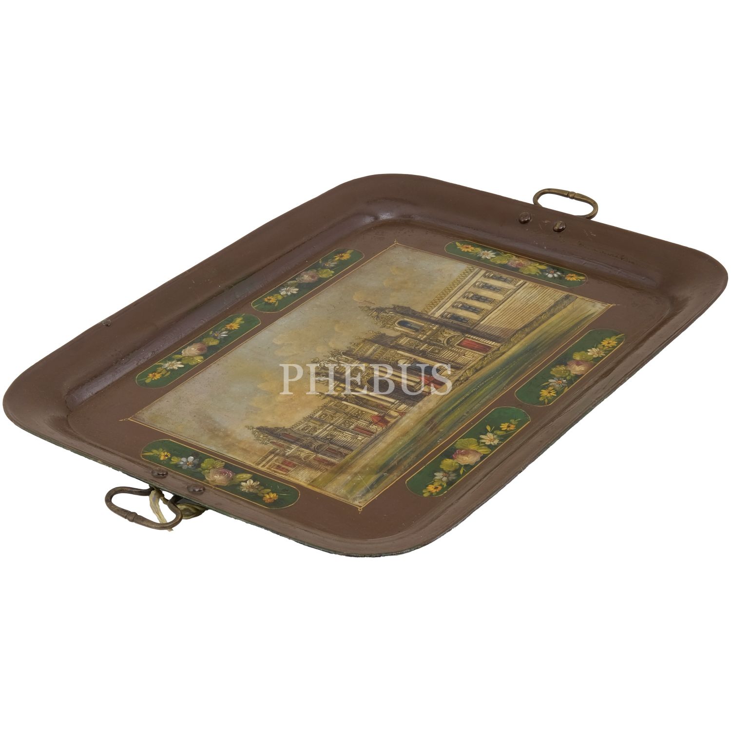 Dördü Haliç, biri Dolmabahçe Sarayı tasvirli, her biri floral motiflerle dekore edilmiş 5 adet pulat tepsi, büyükten küçüğe 62x48 cm, 58x46 cm, 57x43 cm, 50x37 cm, 41x34 cm...