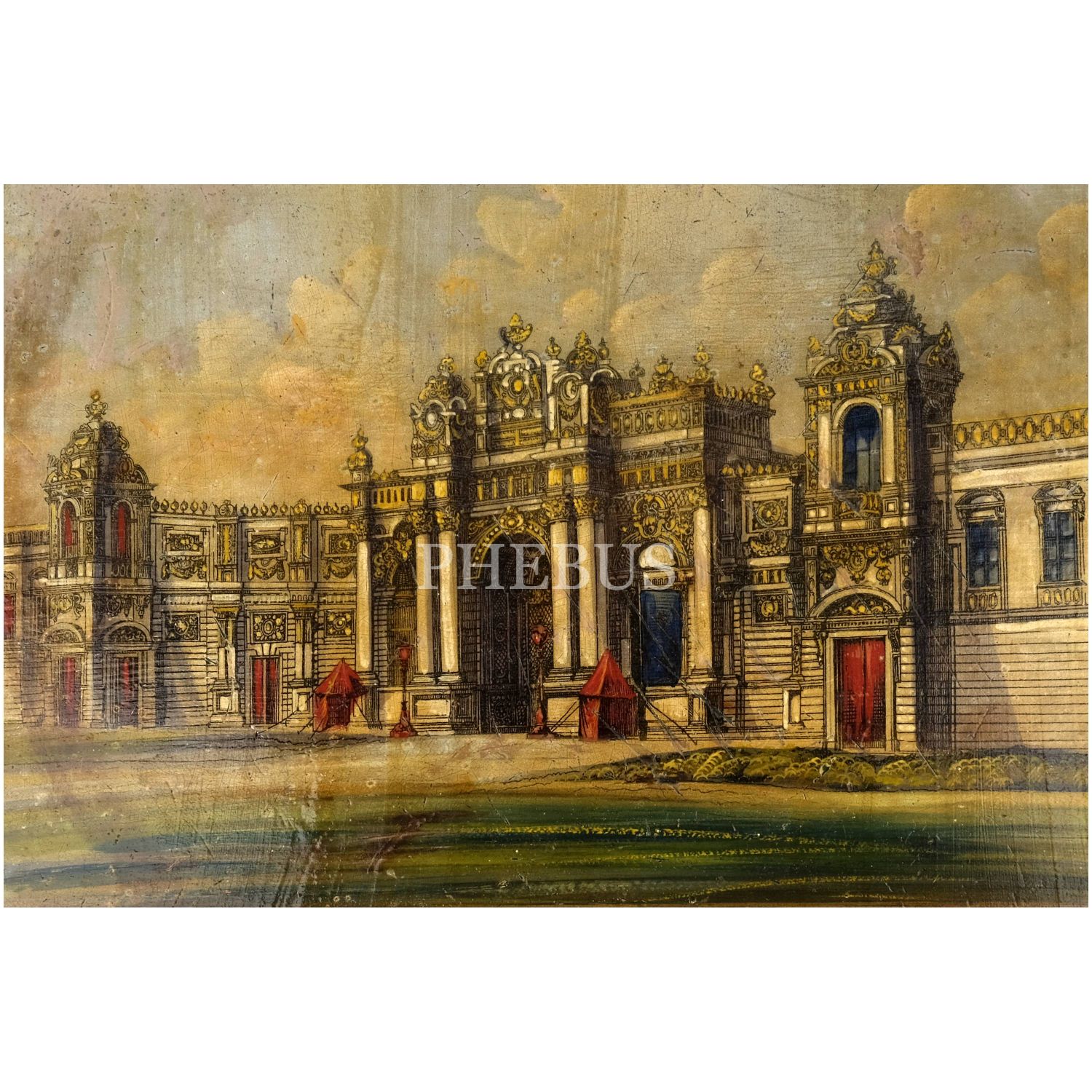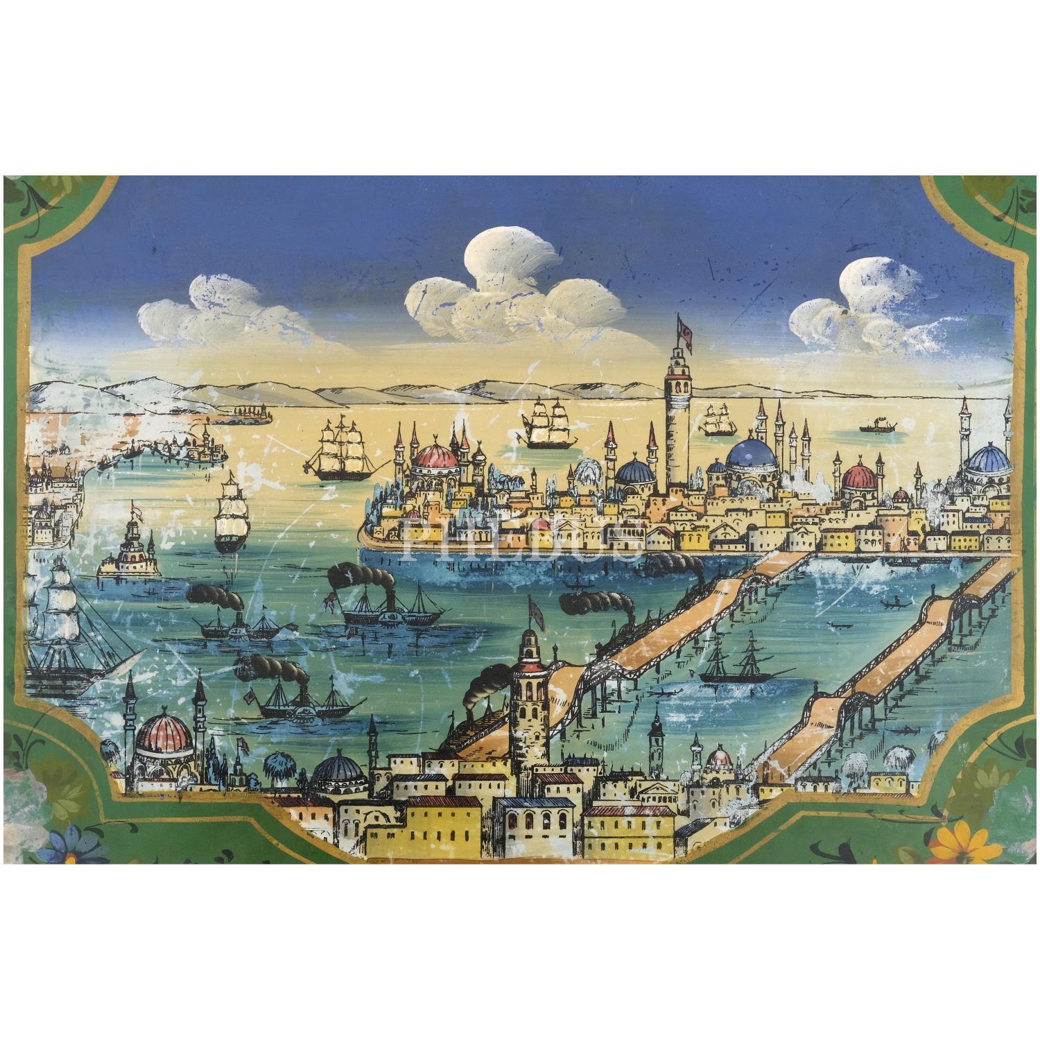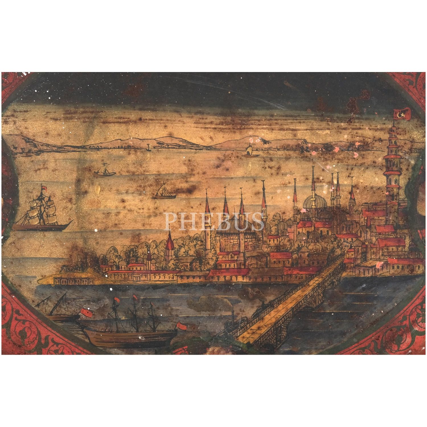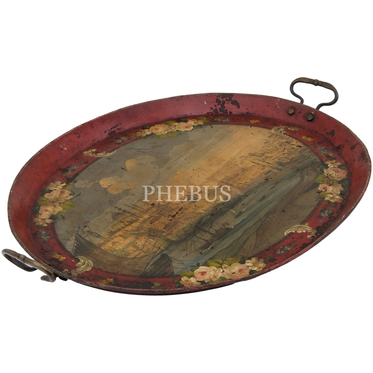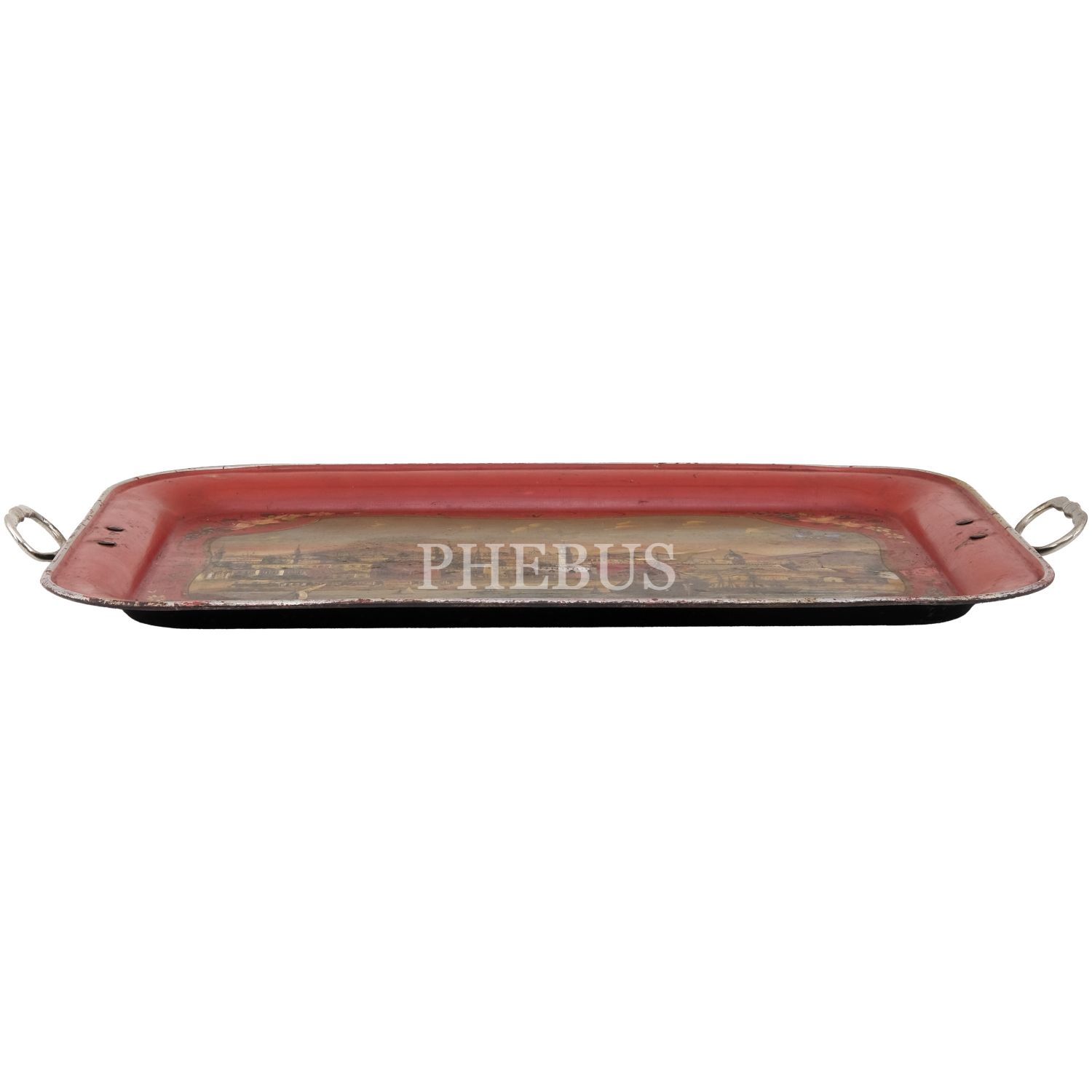 Dördü Haliç, biri Dolmabahçe Sarayı tasvirli, her biri floral motiflerle dekore edilmiş 5 adet pulat tepsi, büyükten küçüğe 62x48 cm, 58x46 cm, 57x43 cm, 50x37 cm, 41x34 cm...