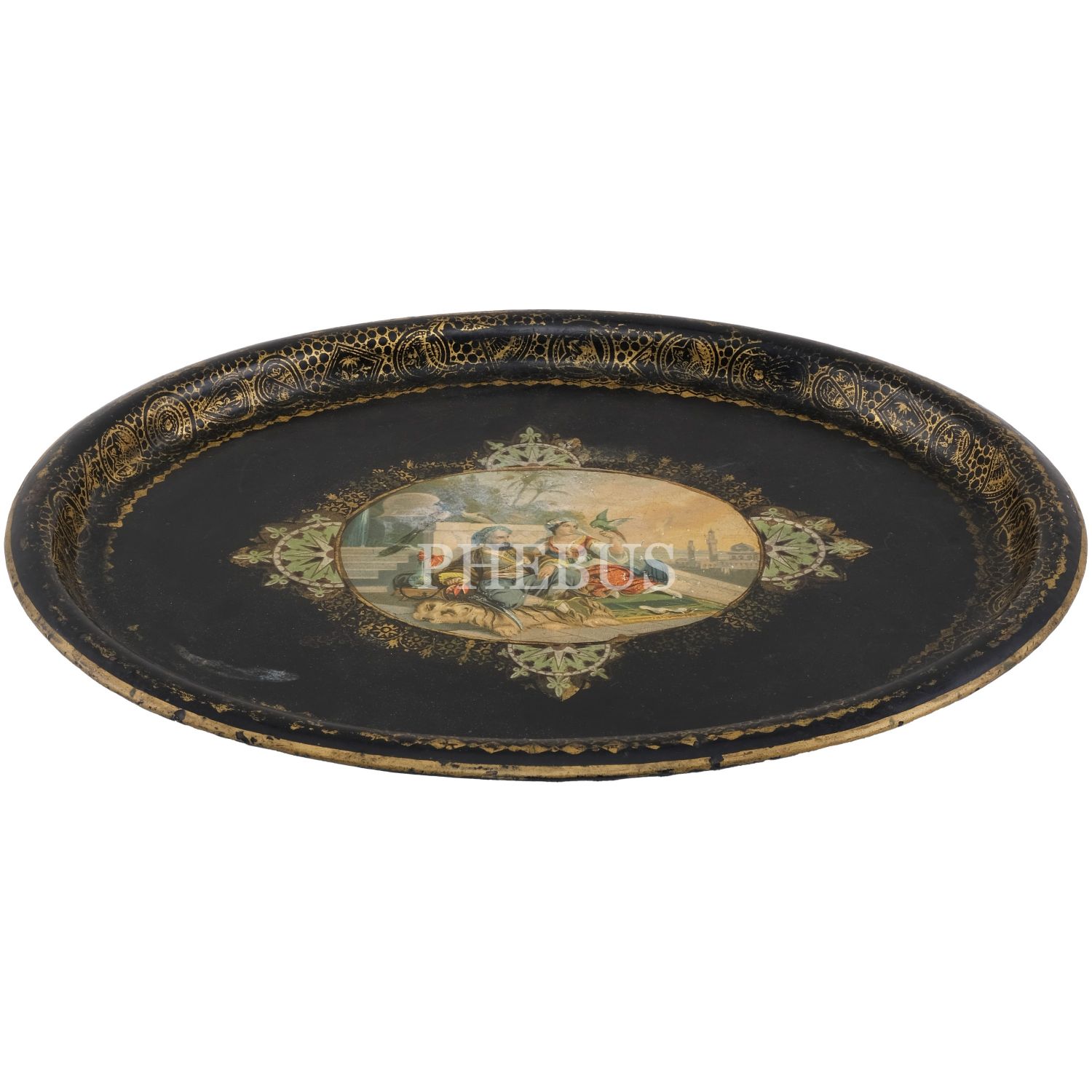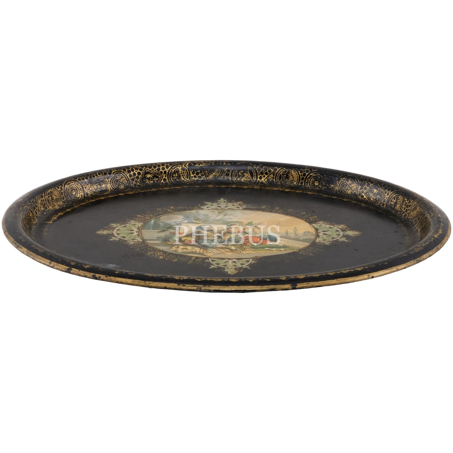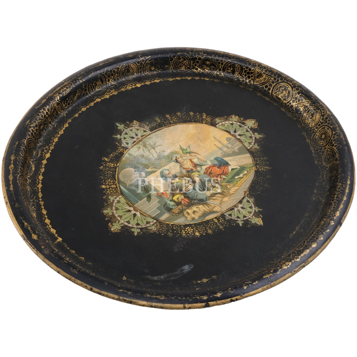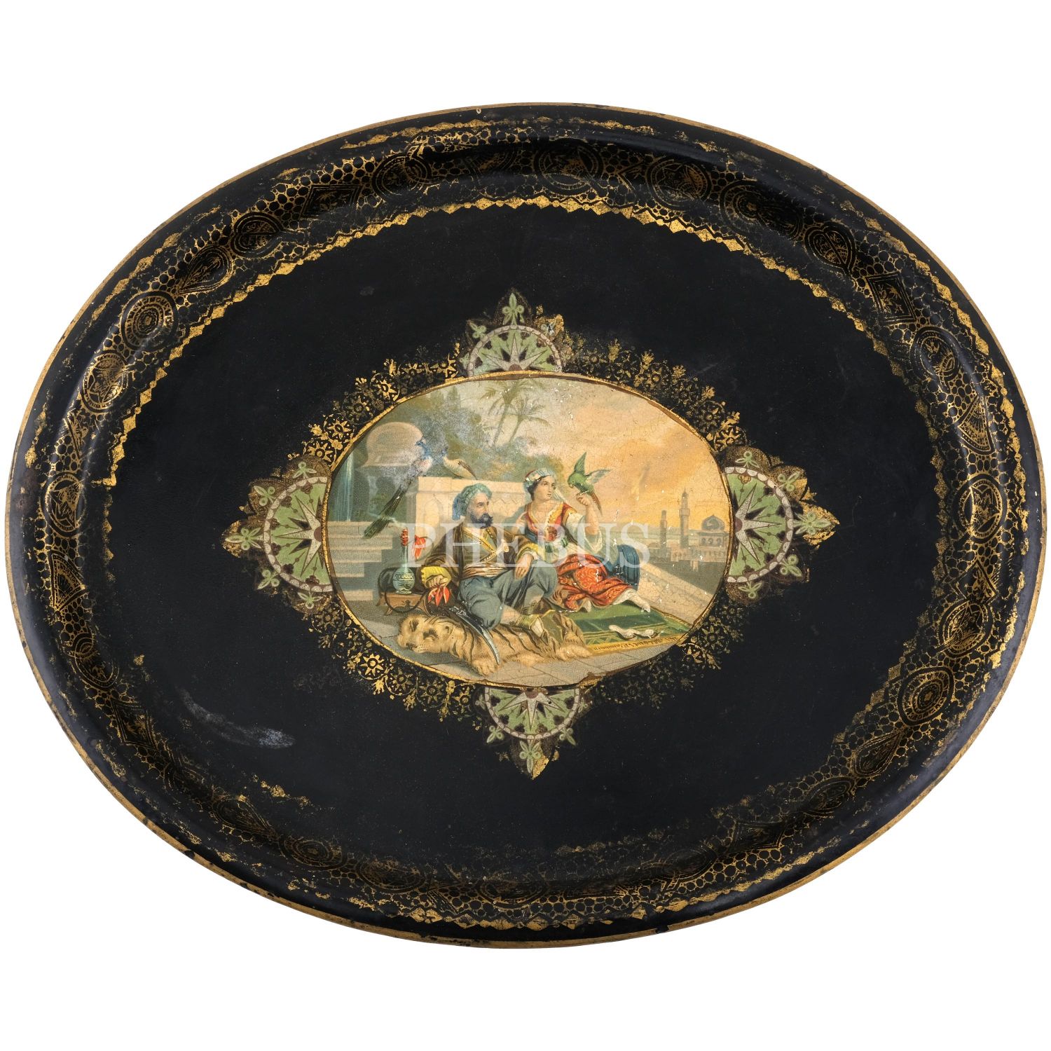 Merkezinde, sedire oturmuş nargileli bir erkek ve elinde papağan tutan kadın görselli oryantal bir resim yer alan, kenarları geometrik desenlerle dekore edilmiş, küçük boy bir pulat tepsi, 41,5x34,5 cm...