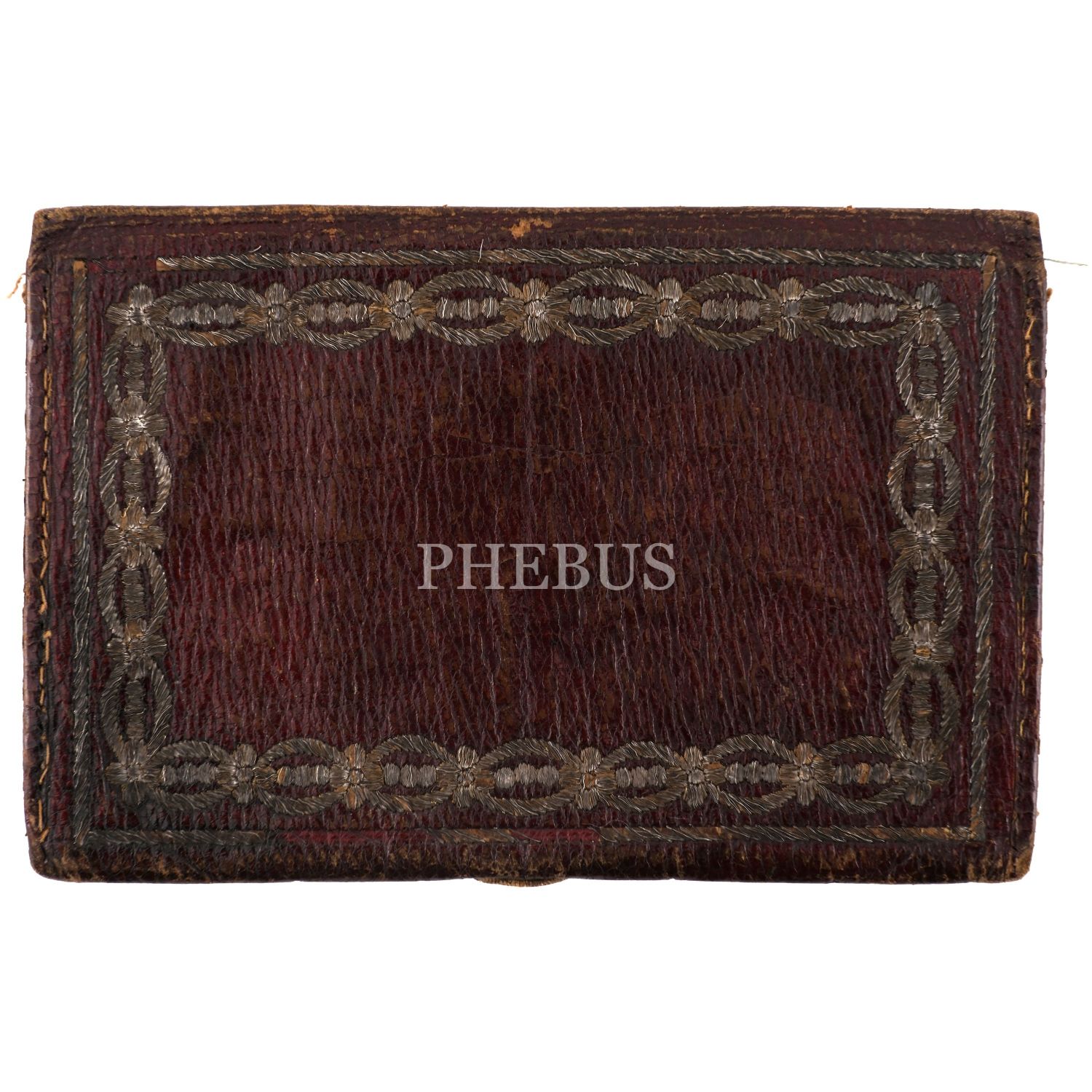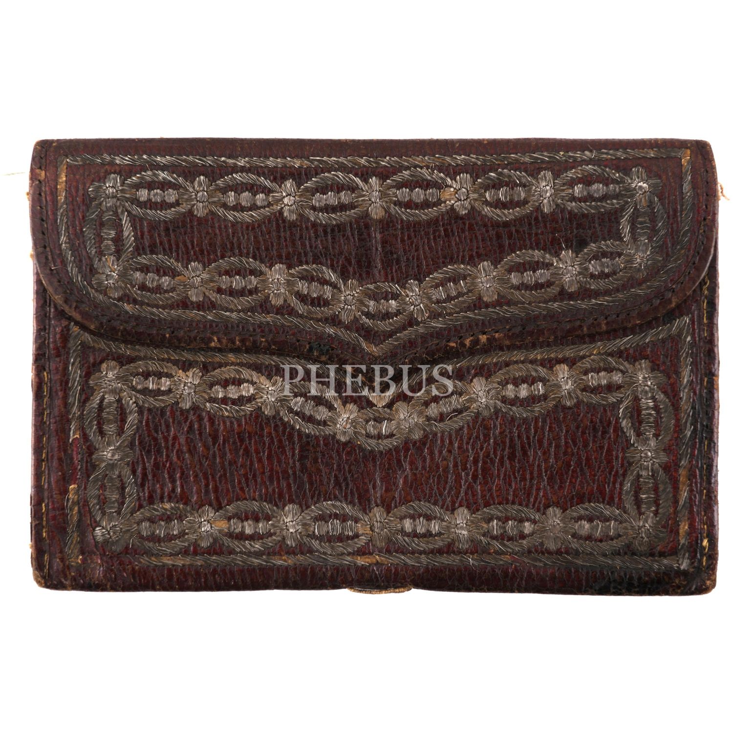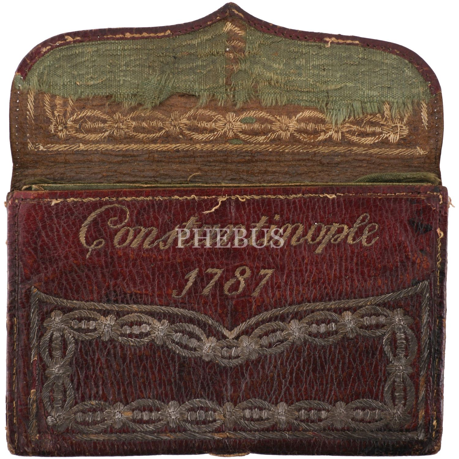 "Constantinople 1787" yazılı, iki yüzeyi sırma işlemeli kırmızı deriden mini cüzdan, 14x9 cm...