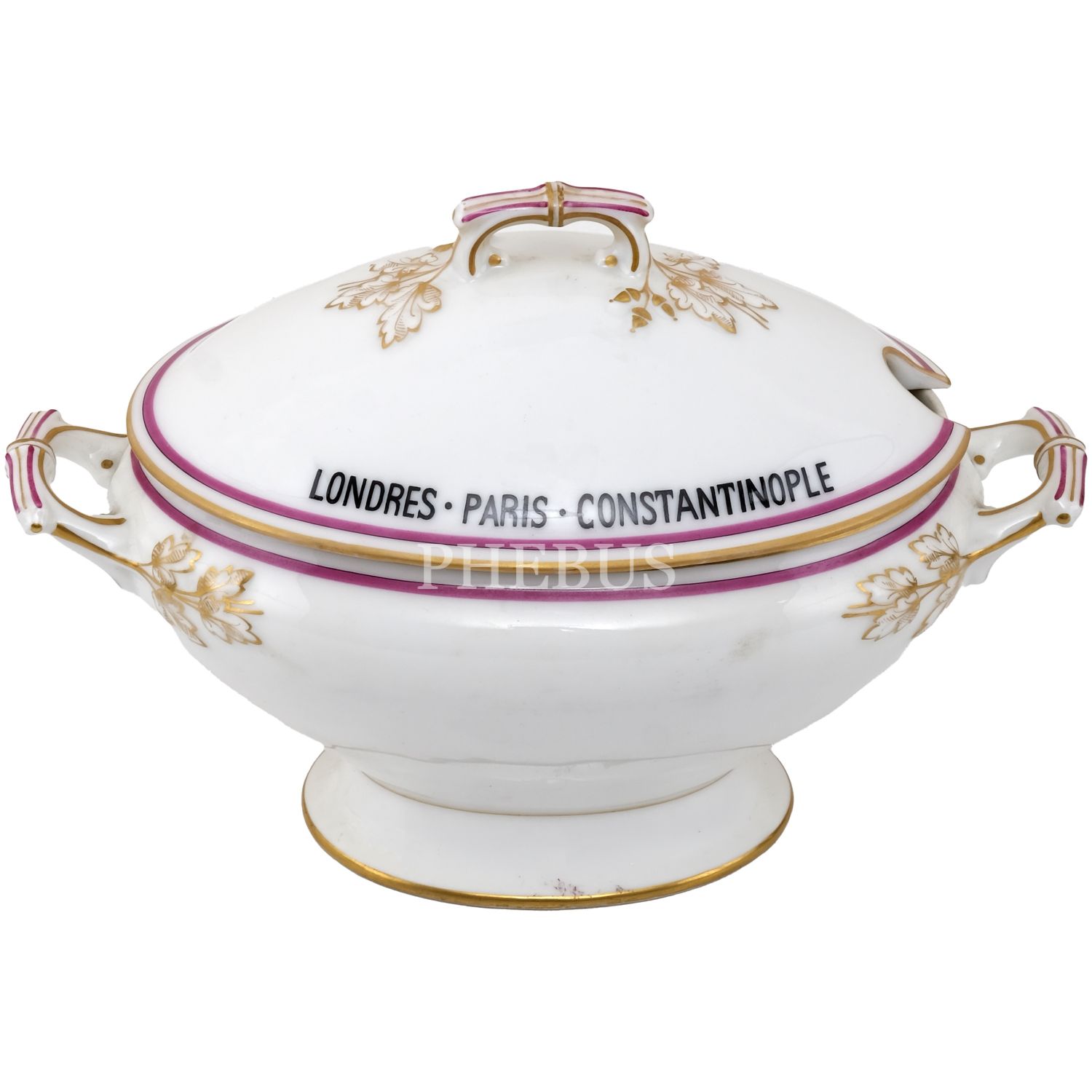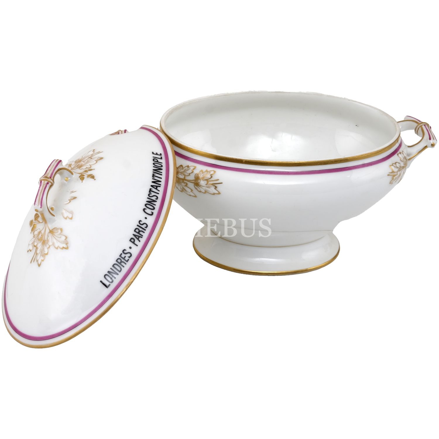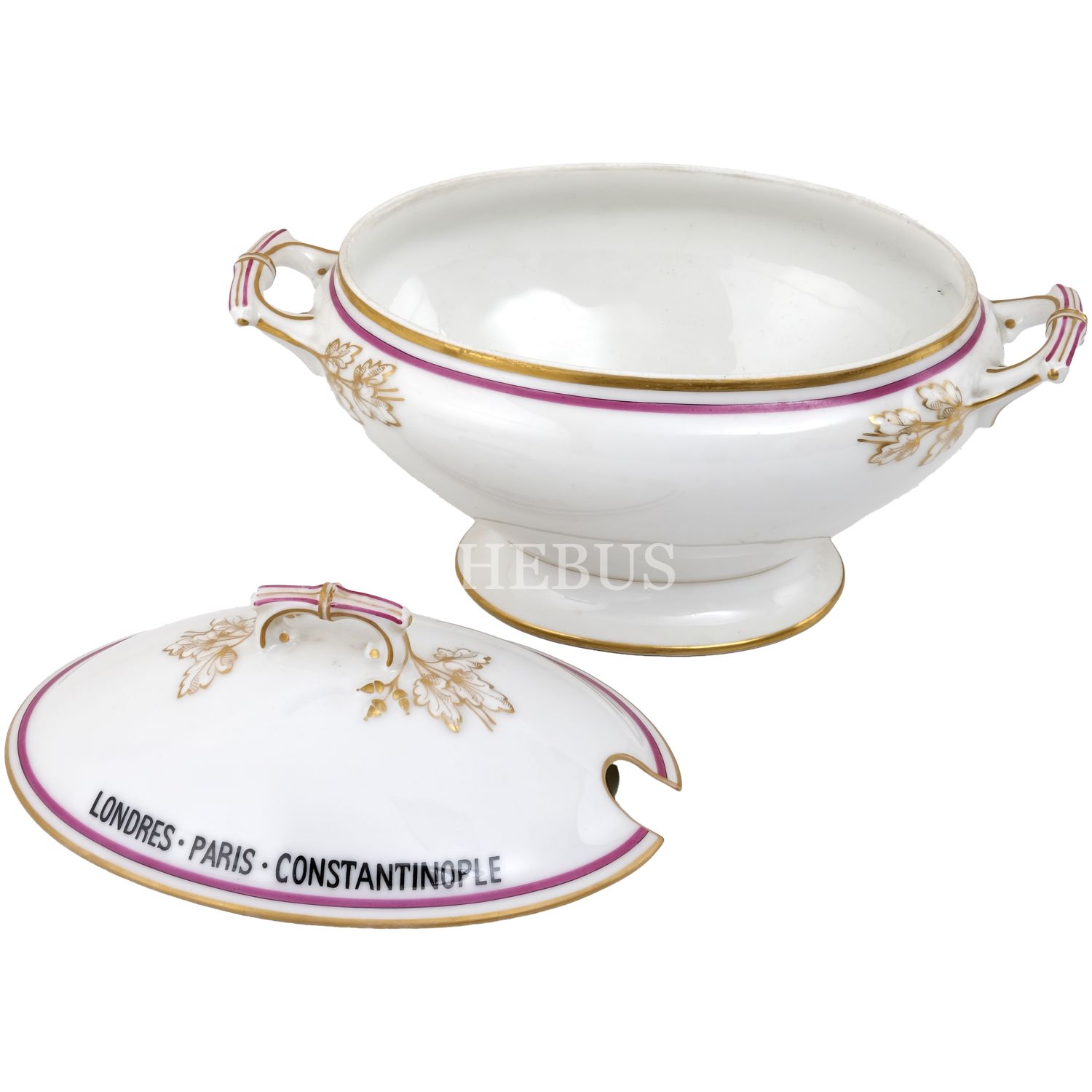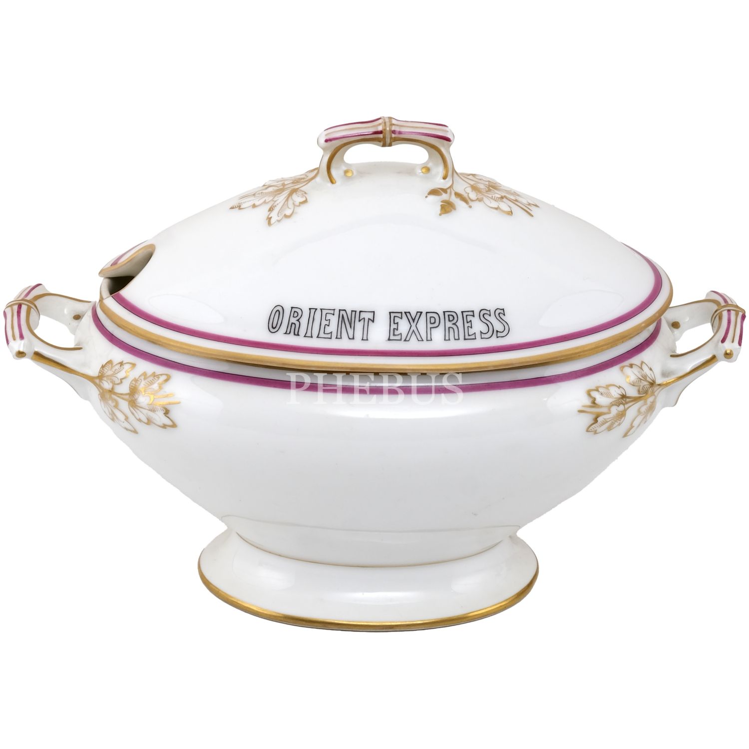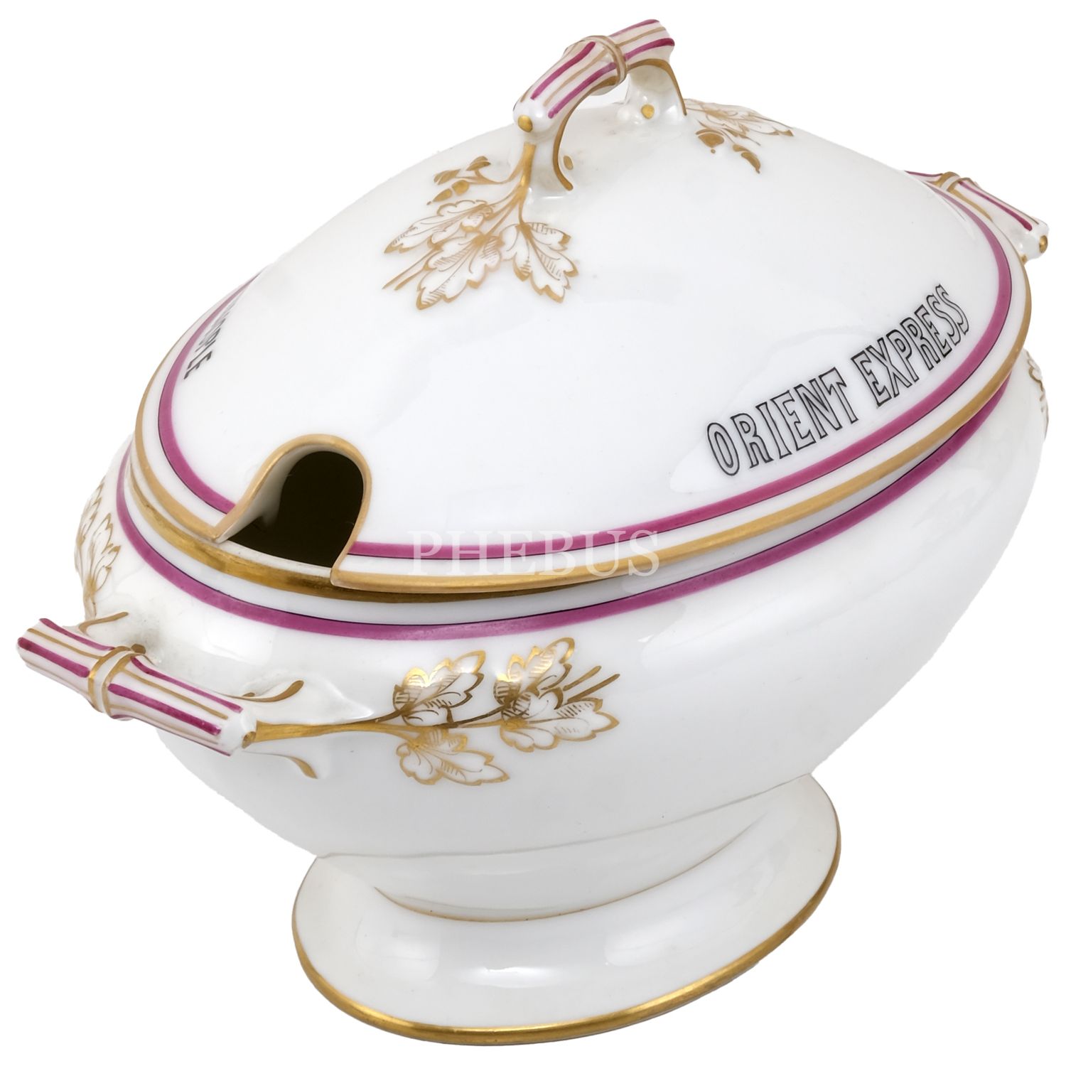 Orient Express´te kullanılmış, çift kulplu, altın yaldız dekorlu porselen şekerlik, kapağının bir yüzü "Orient Express"; bir yüzü "Londres - Paris - Constantinople" yazılı, 22x12,5x15 cm...