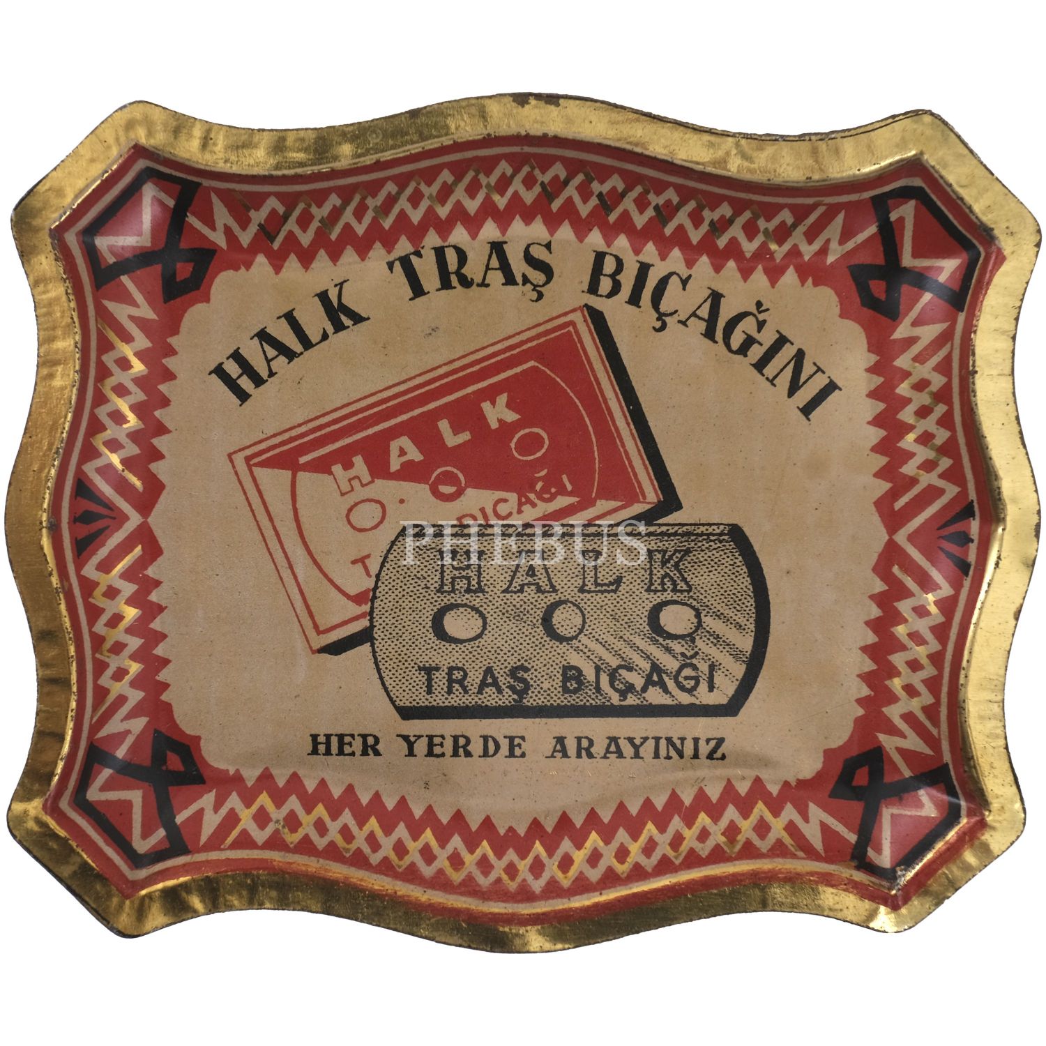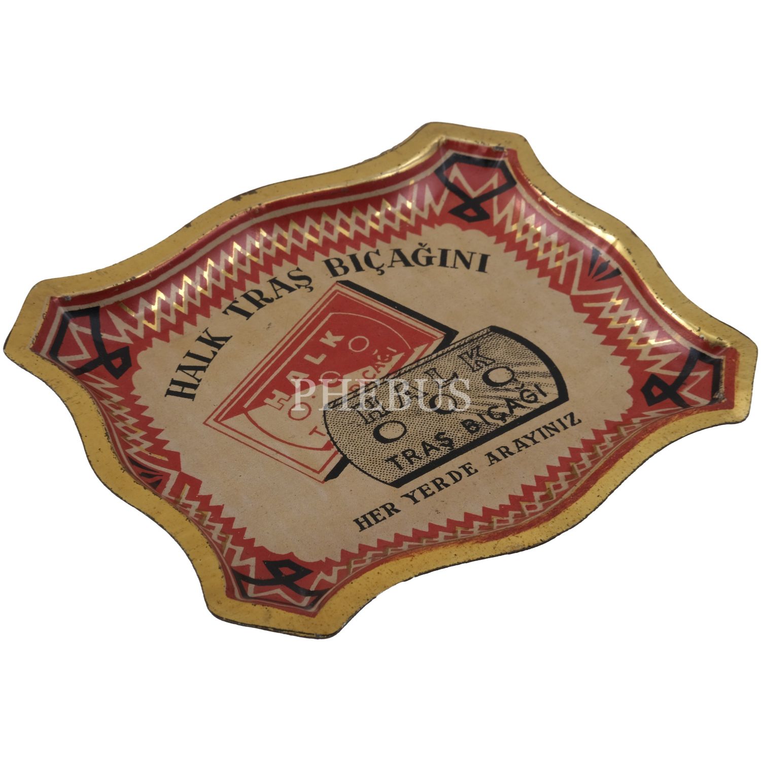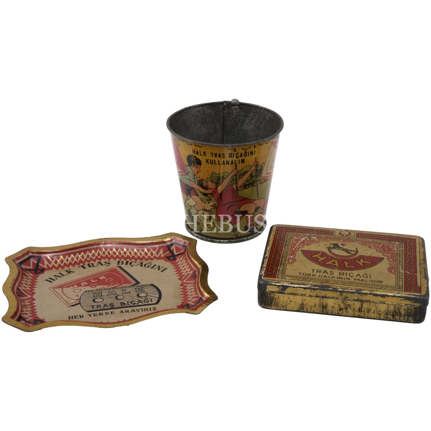 "Halk Traş Bıçağı" kutusu ile reklamlı küllük ve bardak eşantiyonu, "Halk Traş Bıçağı Türk Halkının Malıdır" yazılı kutu 9,5x7x2 cm, "Halk Traş Bıçağını Her Yerde Arayınız" yazılı küllük 12x10 cm, "Halk Traş Bıçağını Kullanalım" yazılı bardak 7,5x7,5 cm...