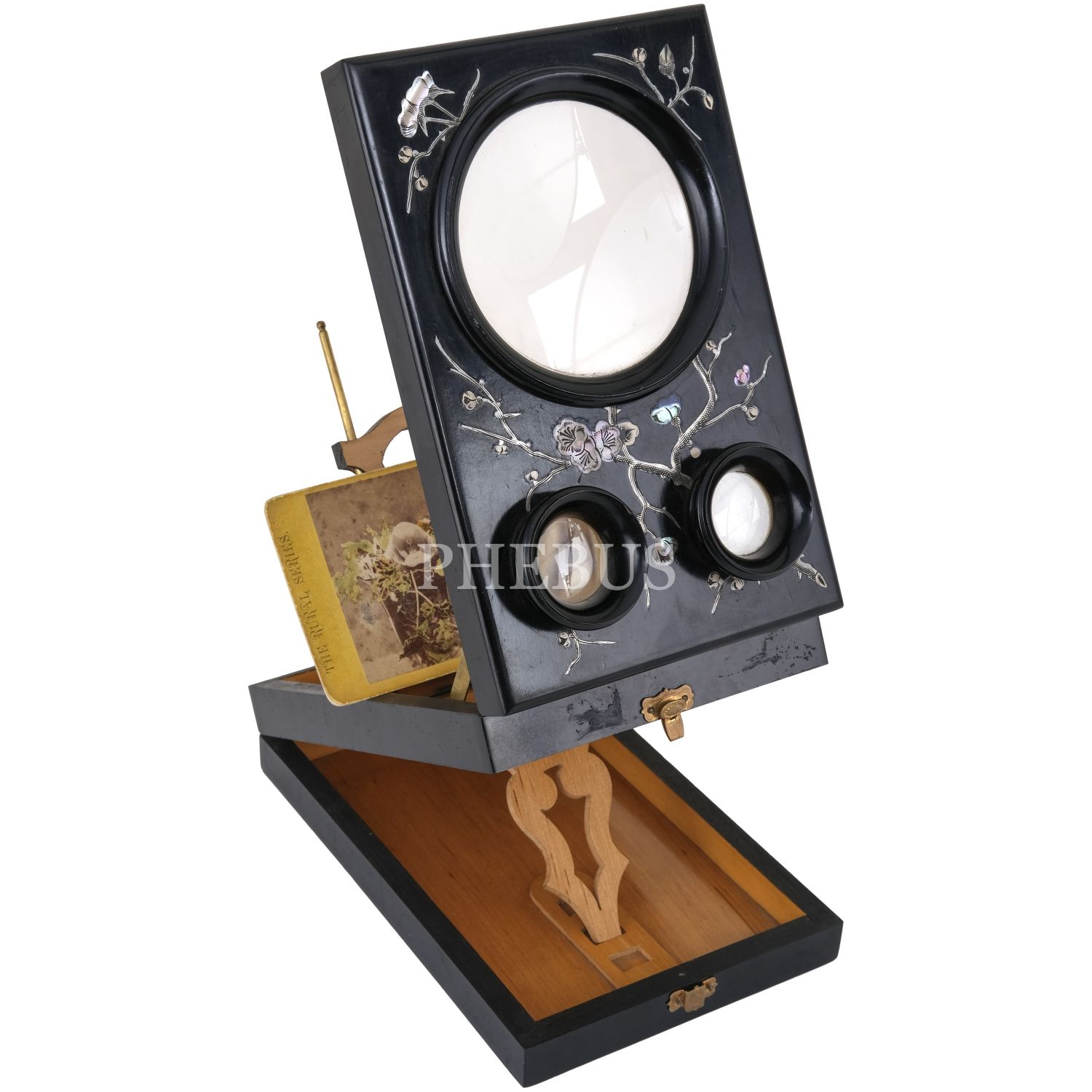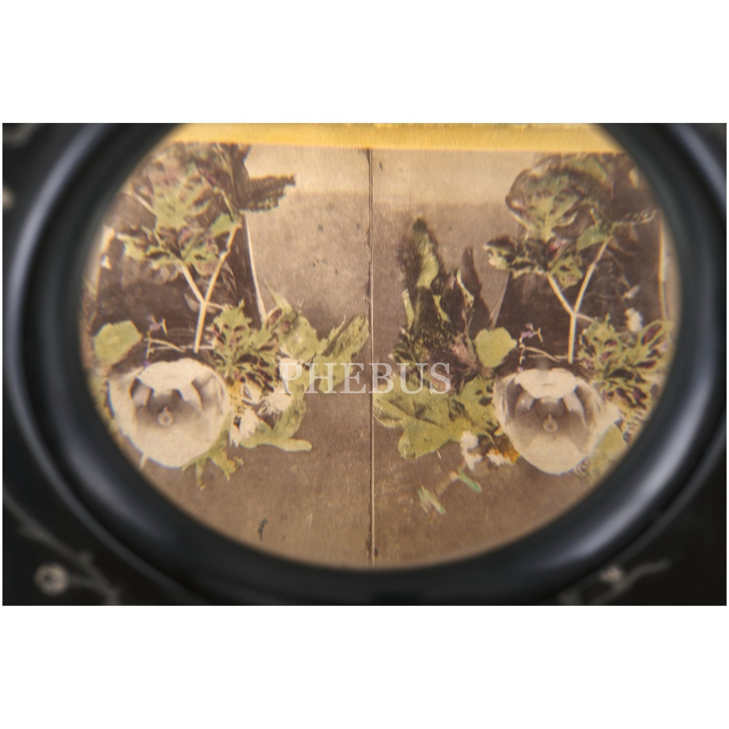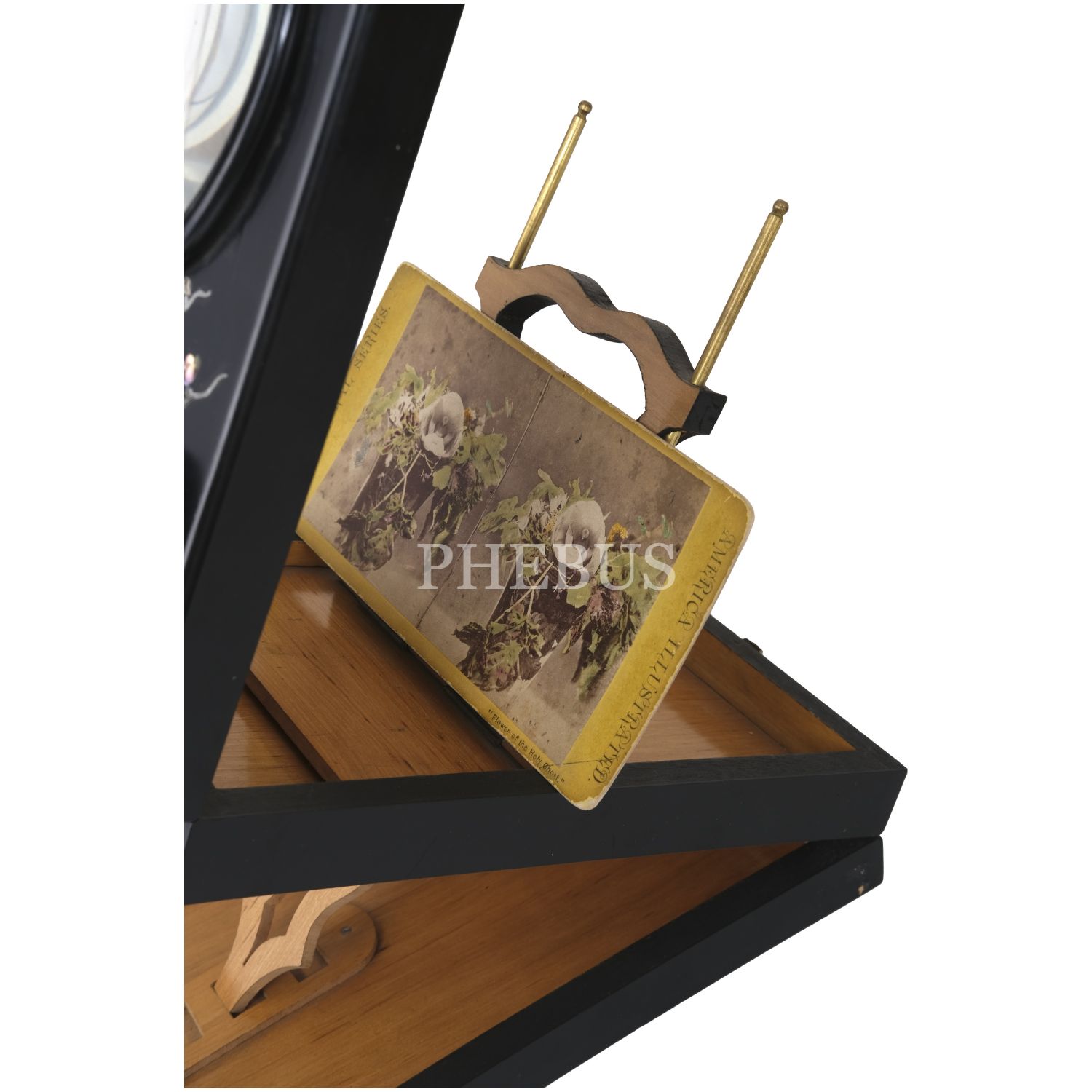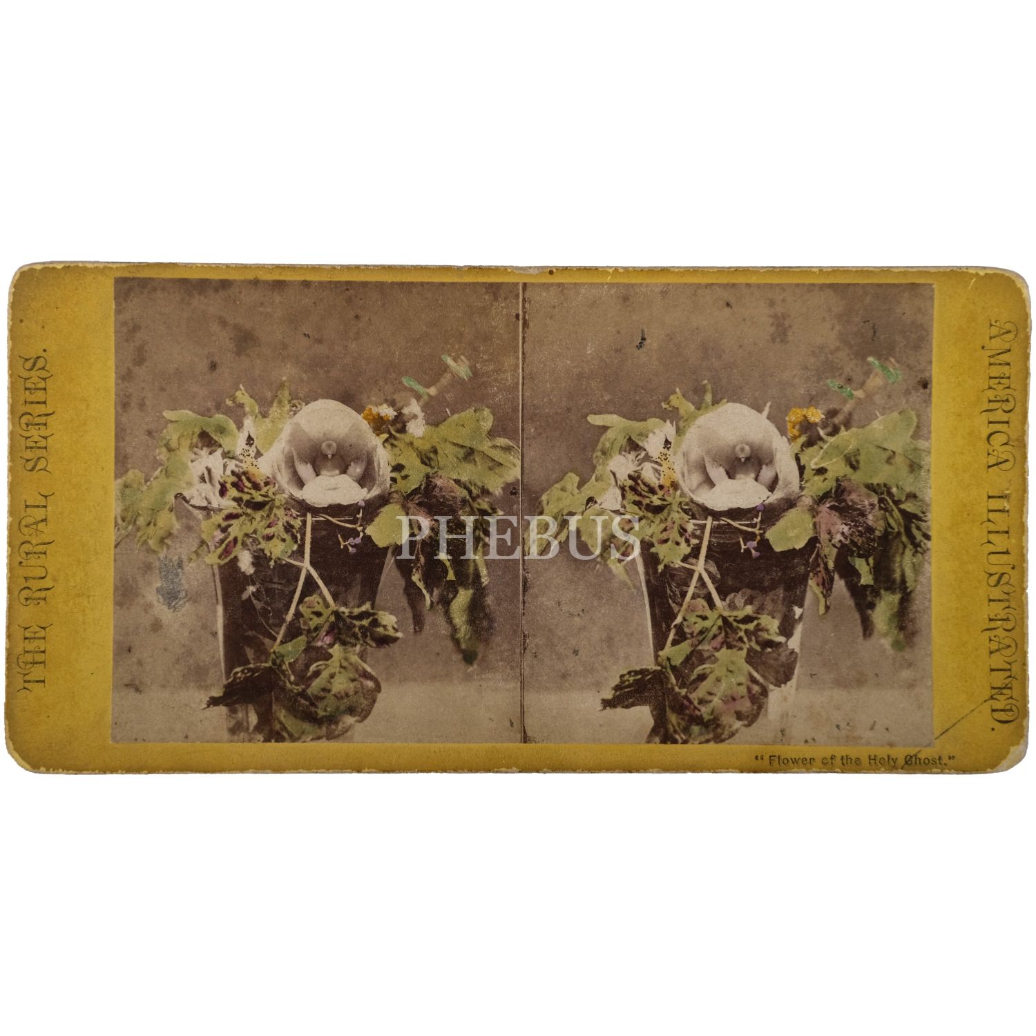 Stereoskopun içinde, "Flower of the Holy Ghost" (Güvercin Orkidesi) isimli çiçeğin stereoview kartı mevcuttur.