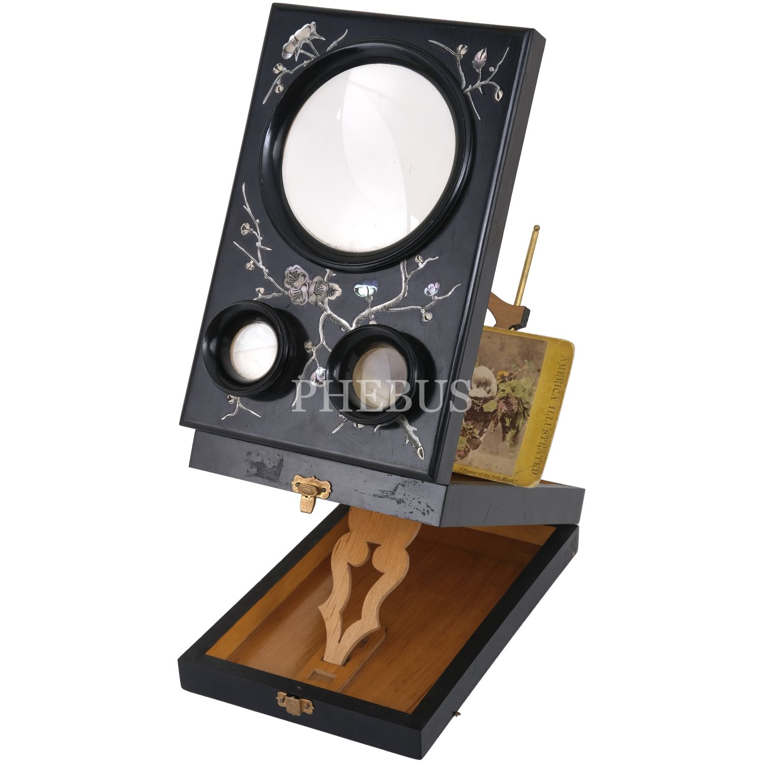 Stereoview (3 boyutlu) ve standart format fotoğrafları incelemeye yarayan, Fransız yapımı, sedef kakma işçilikli, ahşap stereoskop, 15x23x7 cm...