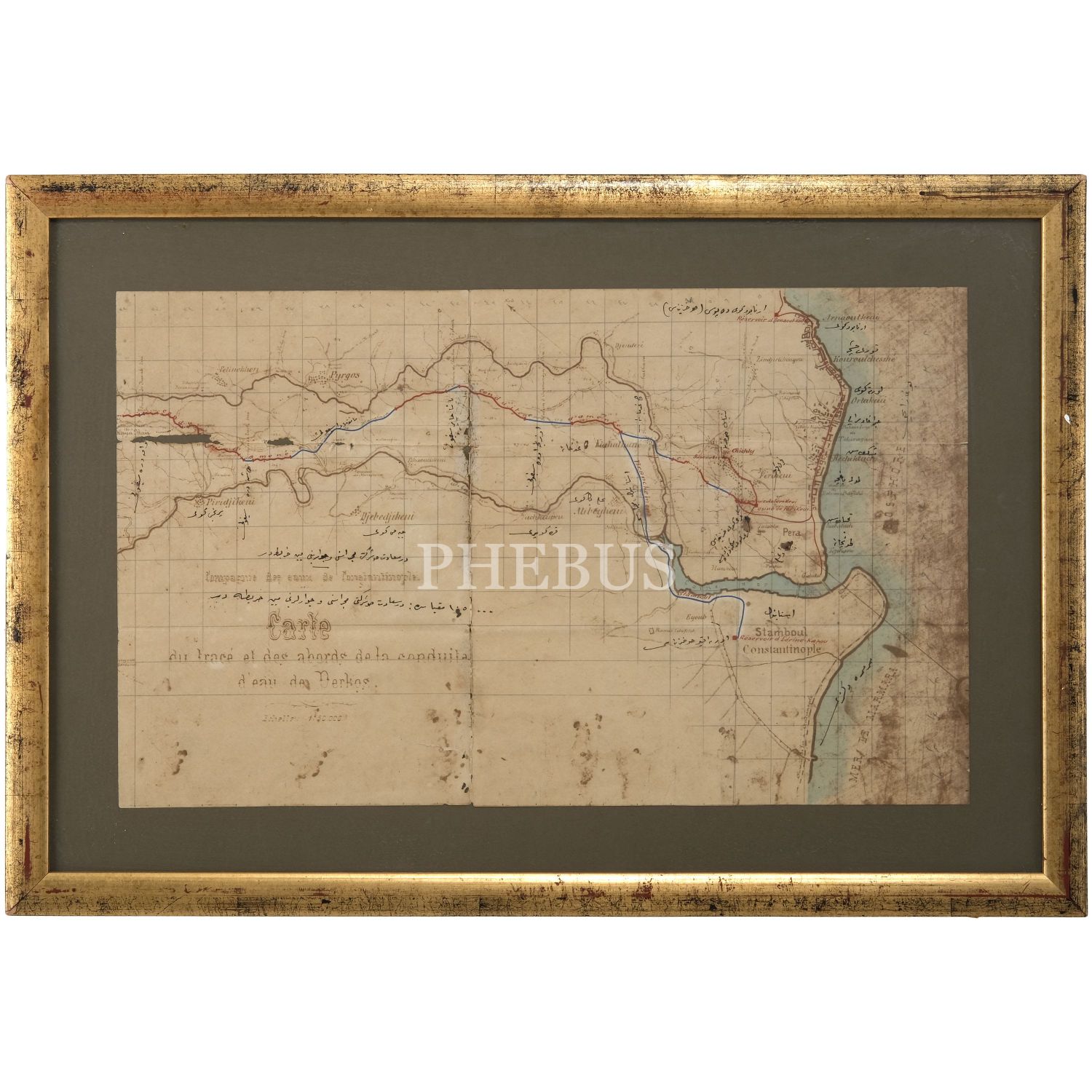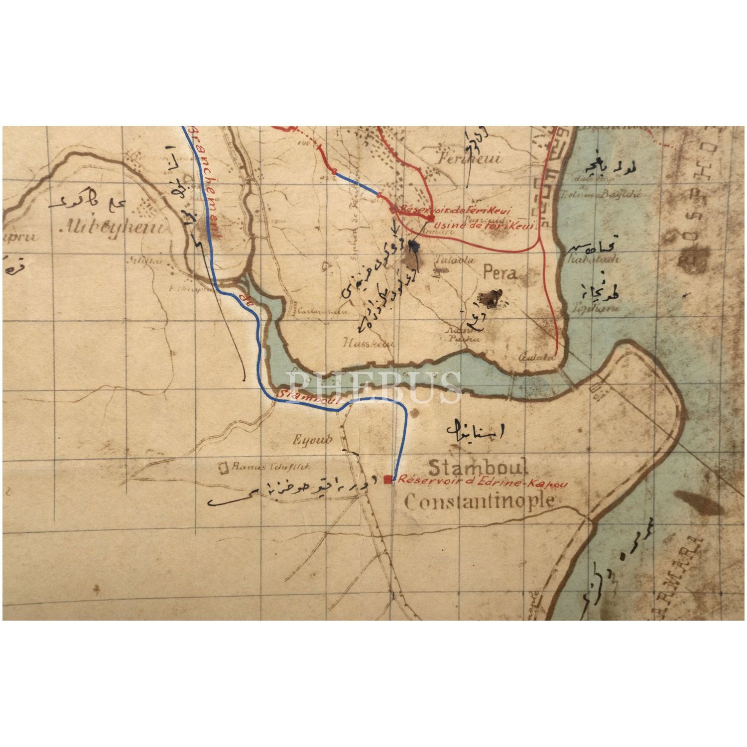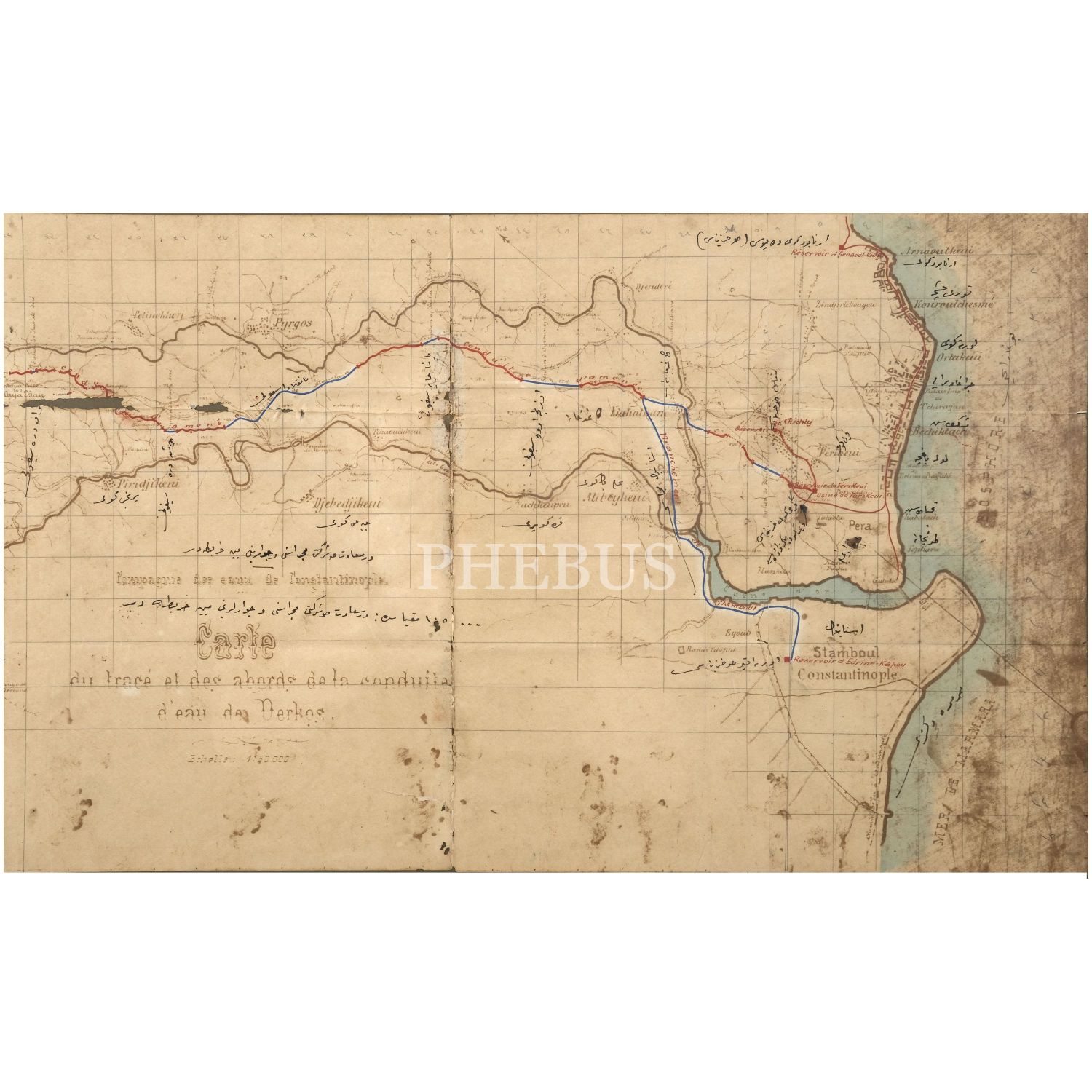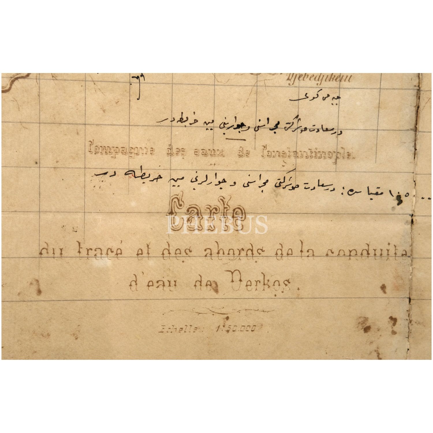 İstanbul Su Şirketi tarafından hazırlanan, Terkos su hattının güzergâhı ve çevresinin "Carte du tracé et des abords de la conduite d’eau de Derkos" başlıklı Fransızca ve Osmanlıca haritası 50x31 cm...,