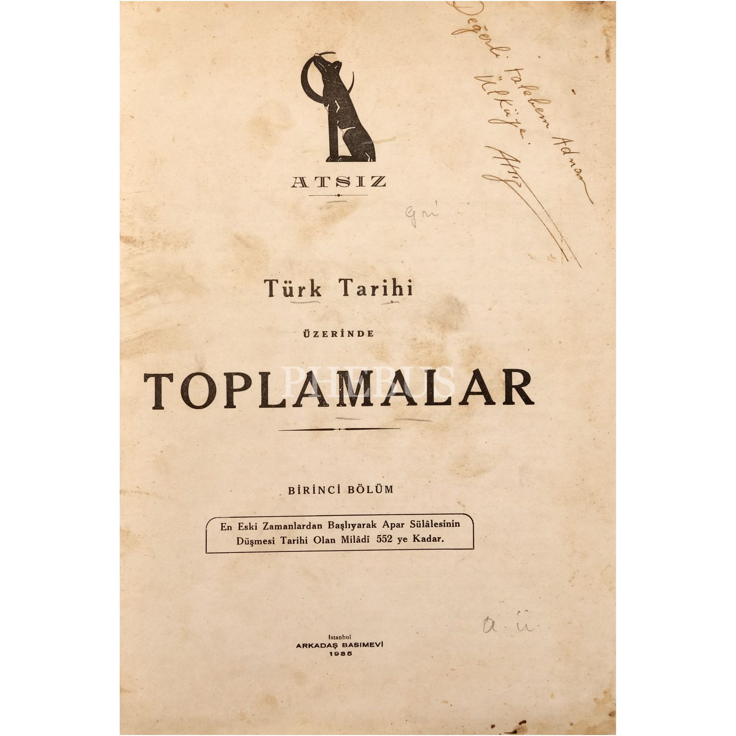 TÜRK TARİHİ ÜZERİNE TOPLAMALAR (Birinci Bölüm: En Eski Zamanlardan Başlıyarak Apar Sülâlesinin Düşmesi Tarihi Olan Milâdî 552 ye Kadar.), Atsız, 1935, Arkadaş Basımevi, 138 sayfa,