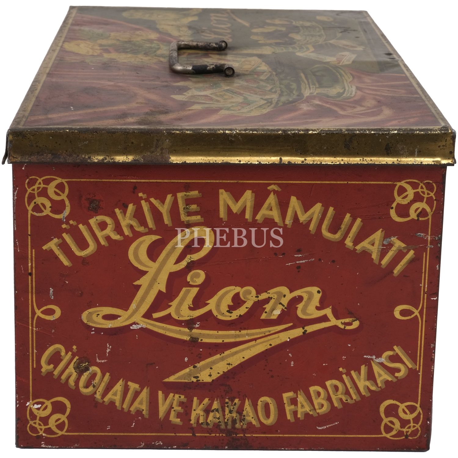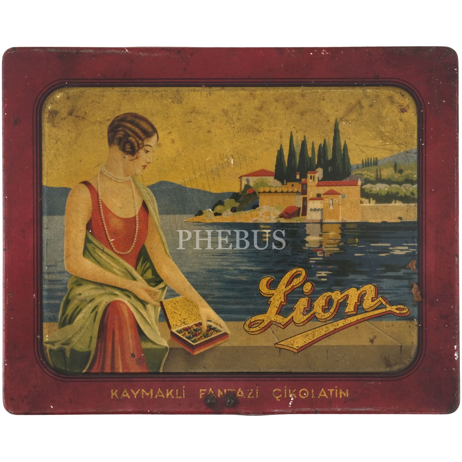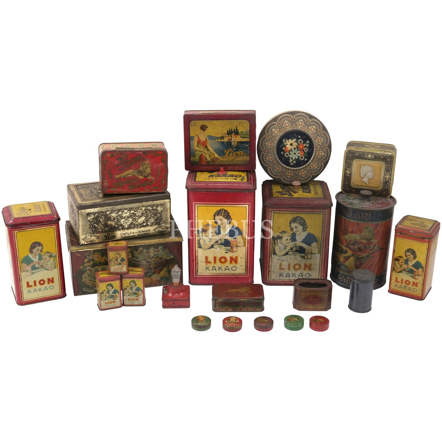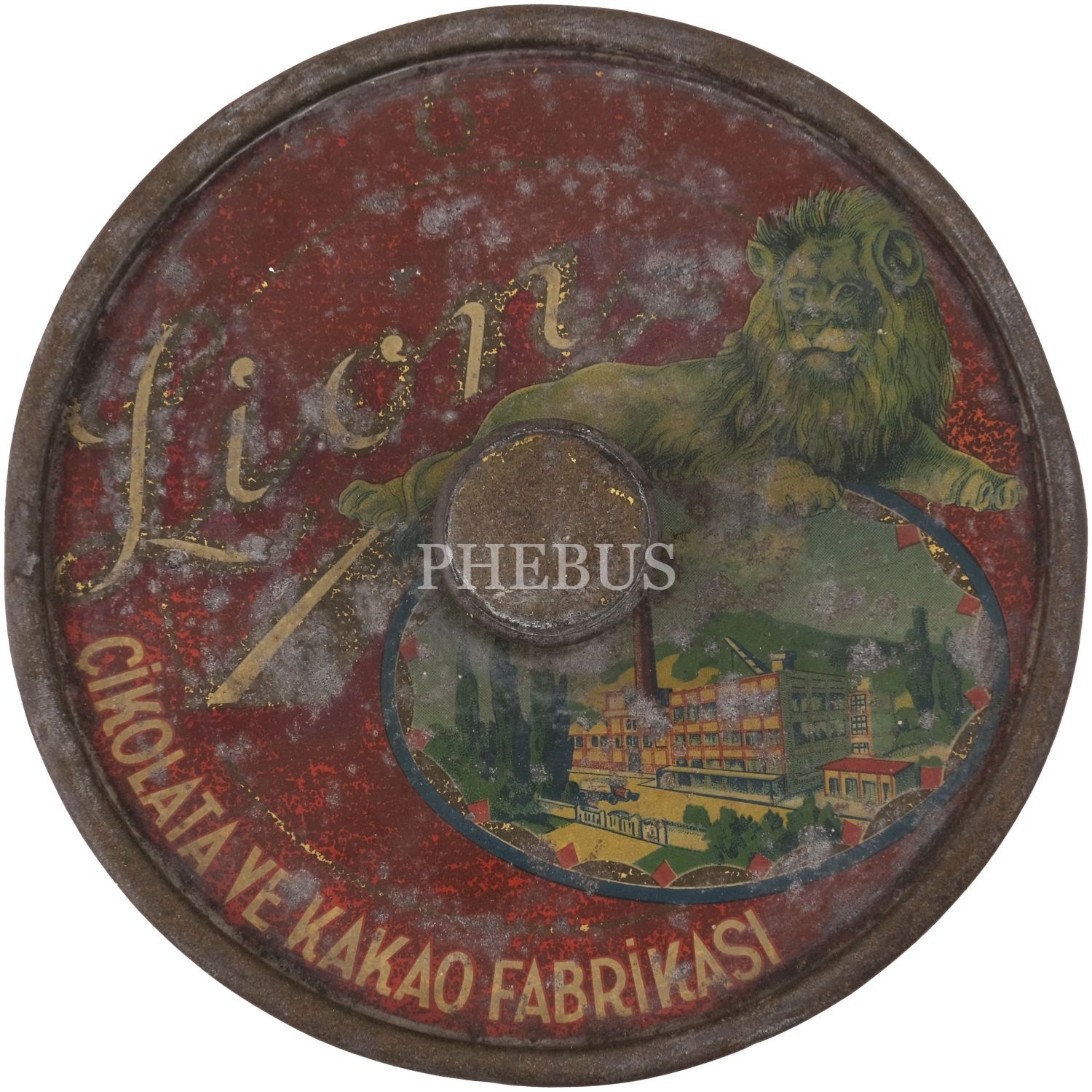 Lion Çikolata ve Bonbon Fabrikası tarafından üretilmiş; çikolata, bonbon, kakao tozu, pastil komprime gibi çeşitli ürün gruplarının büyük, orta ve küçük boy teneke kutuları ile "Lion Çikolata ve Bonbon Fabrikası" yazılı, son derece nadir bir mini masa lambası...