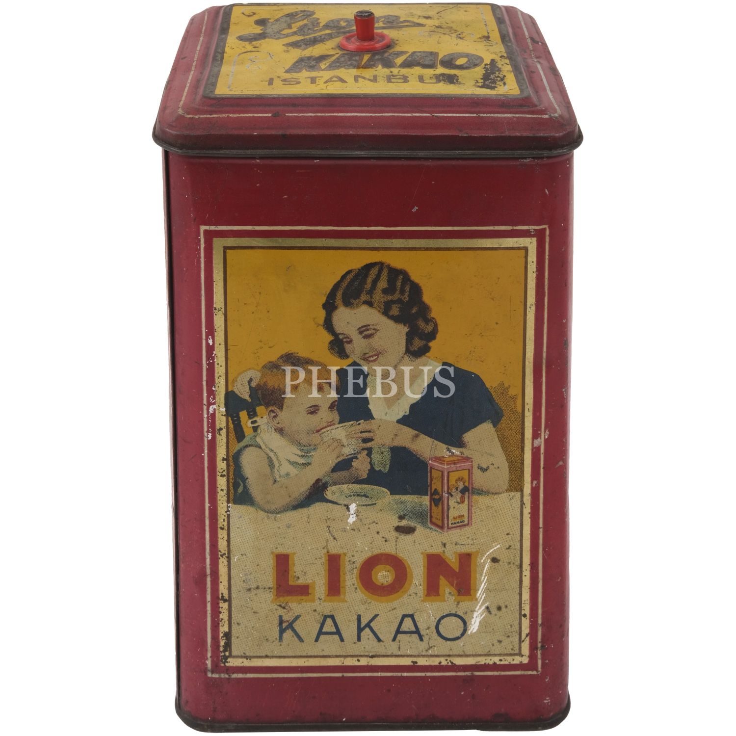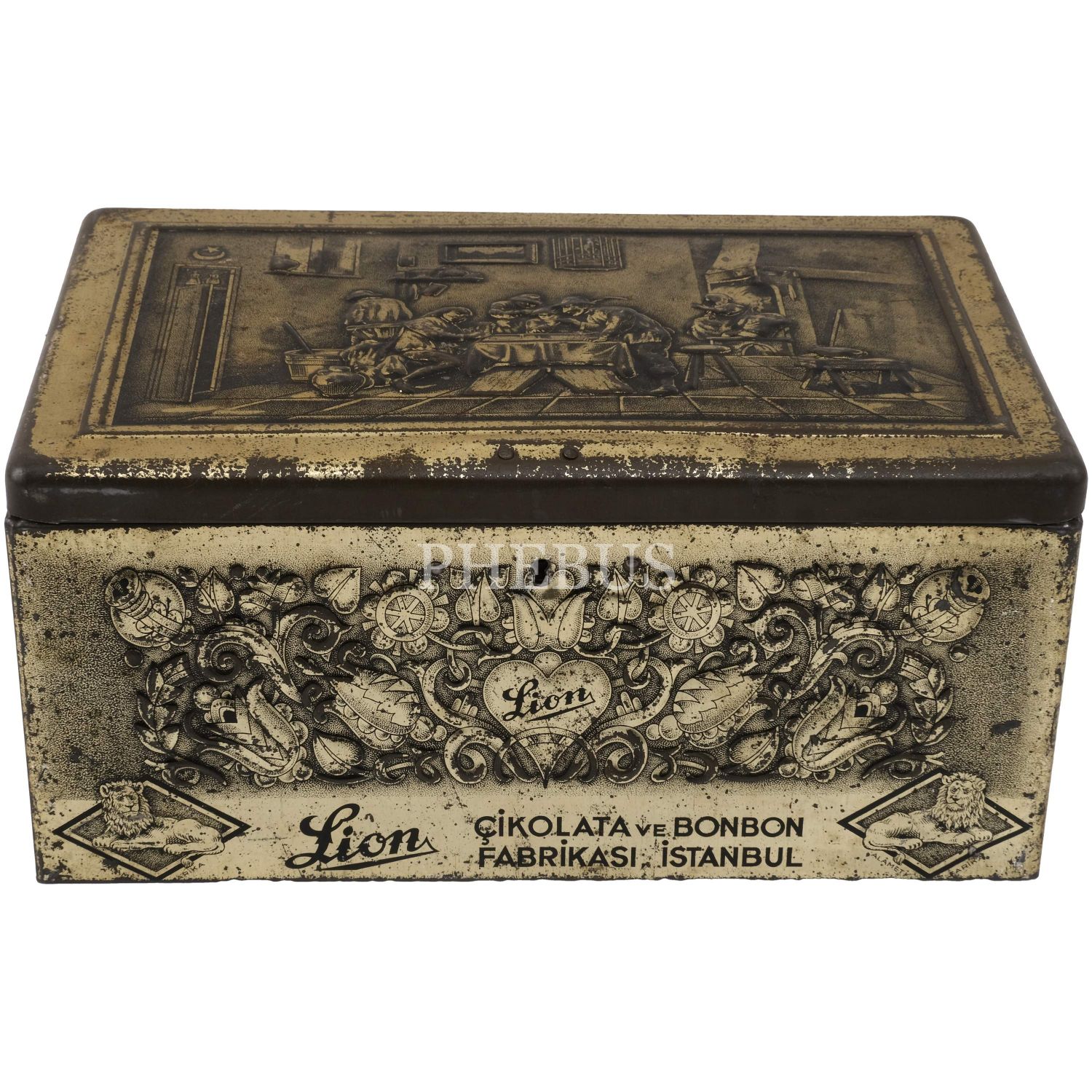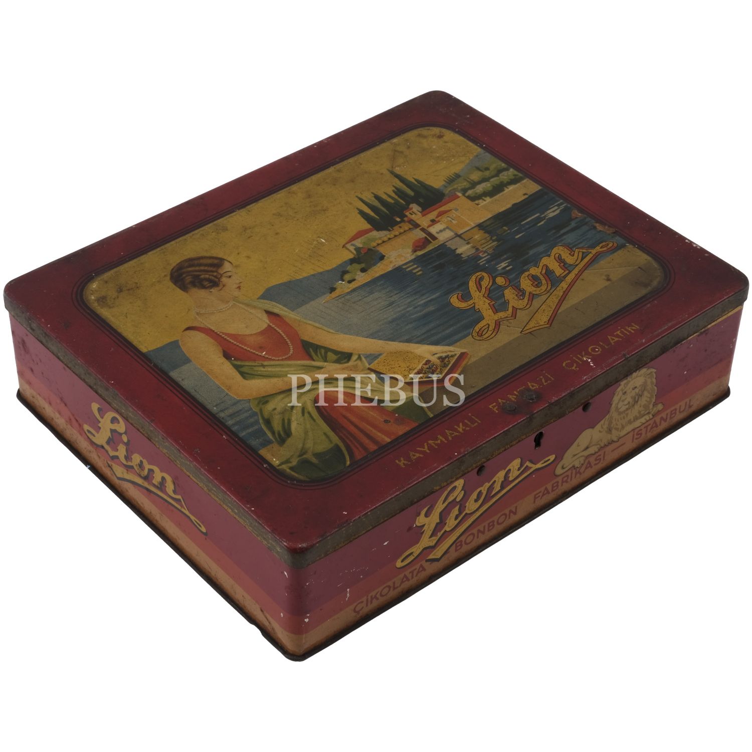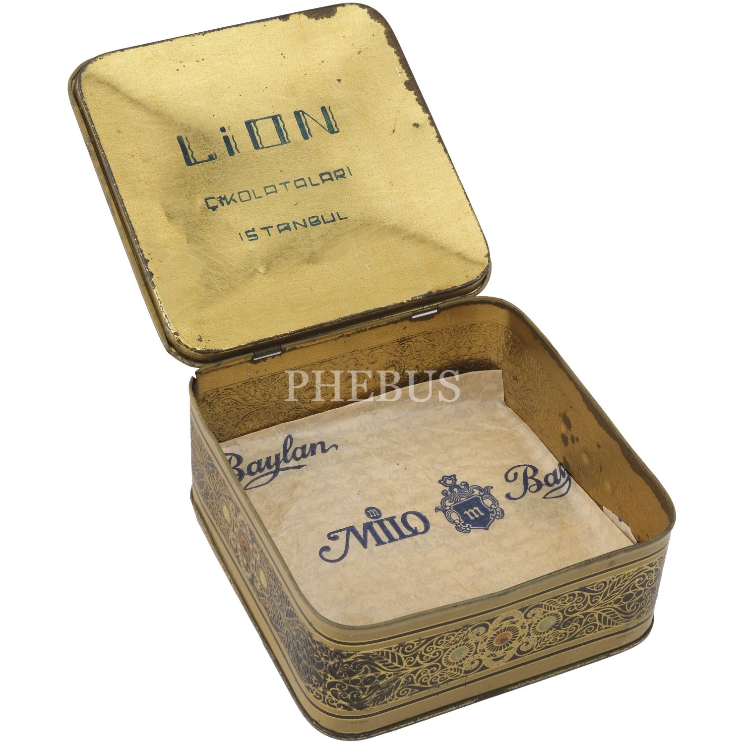 Lion Çikolata ve Bonbon Fabrikası tarafından üretilmiş; çikolata, bonbon, kakao tozu, pastil komprime gibi çeşitli ürün gruplarının büyük, orta ve küçük boy teneke kutuları ile "Lion Çikolata ve Bonbon Fabrikası" yazılı, son derece nadir bir mini masa lambası...