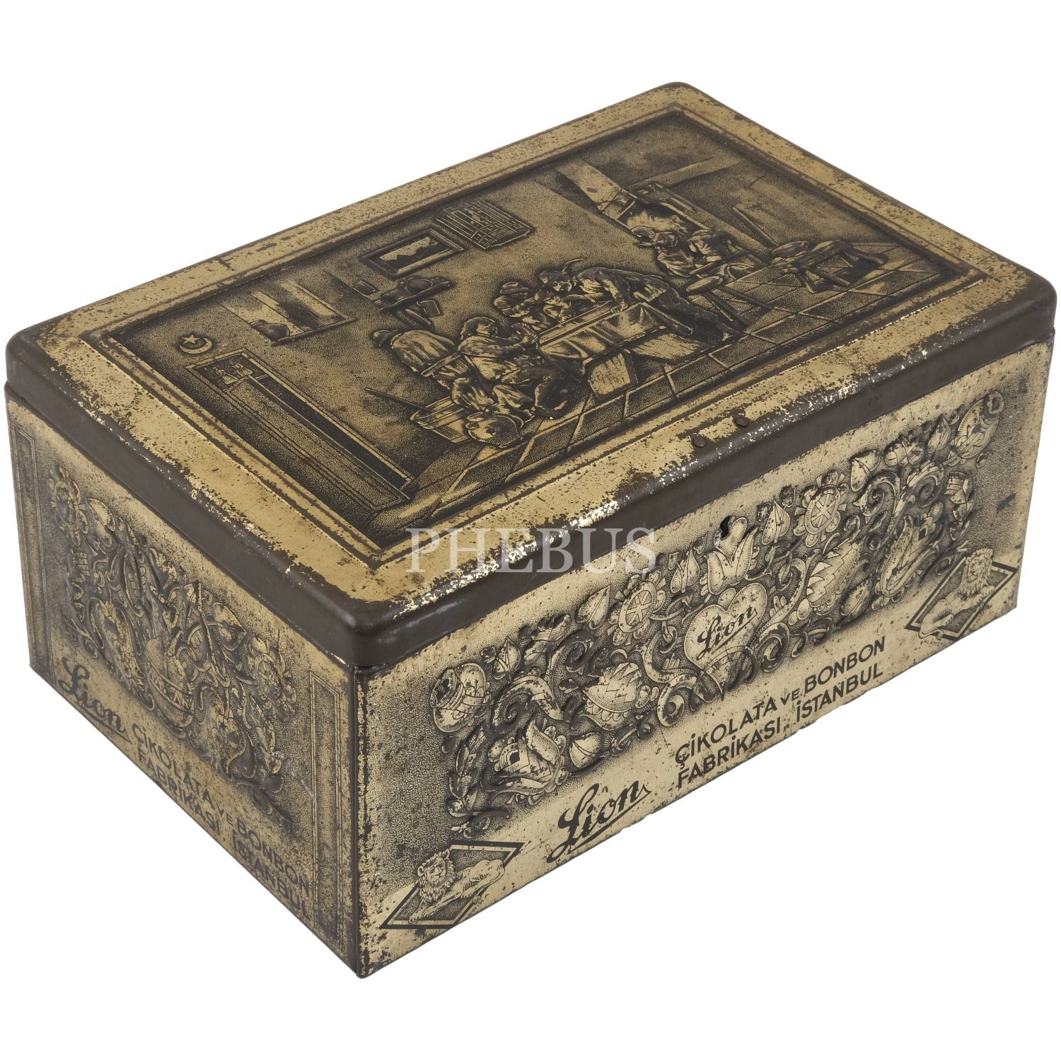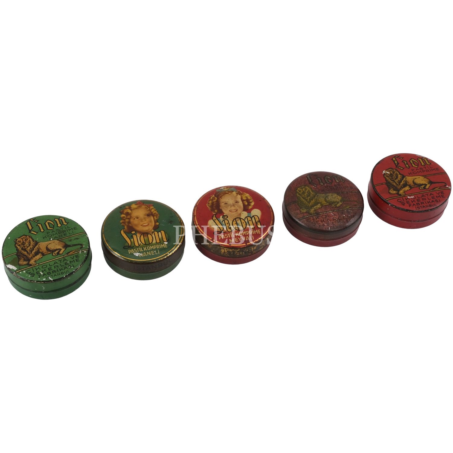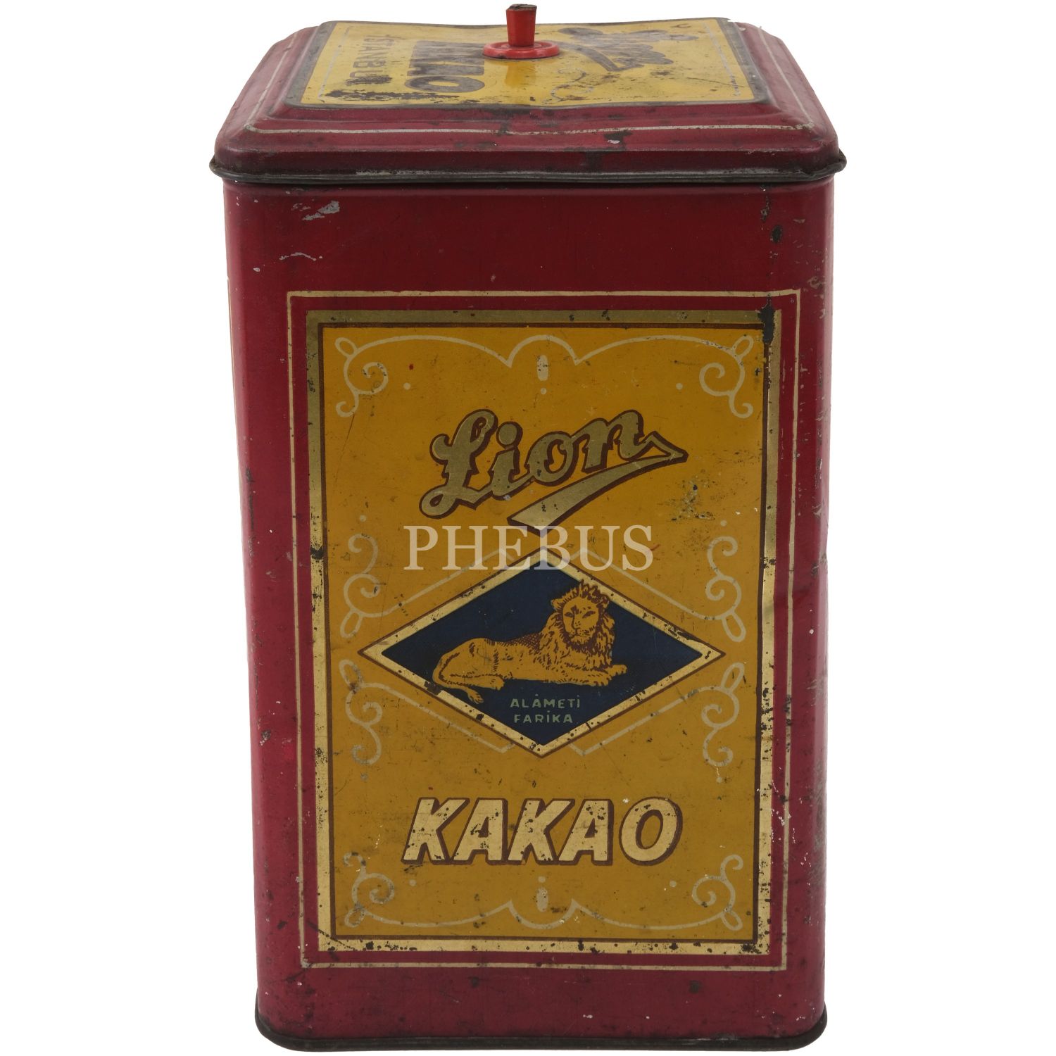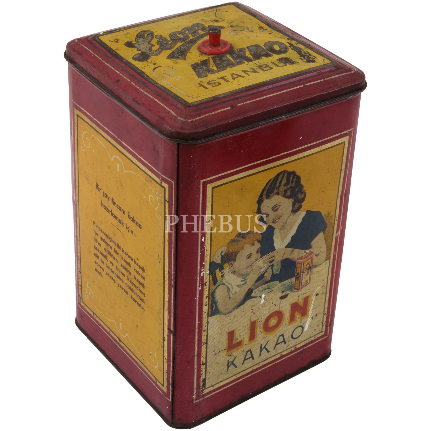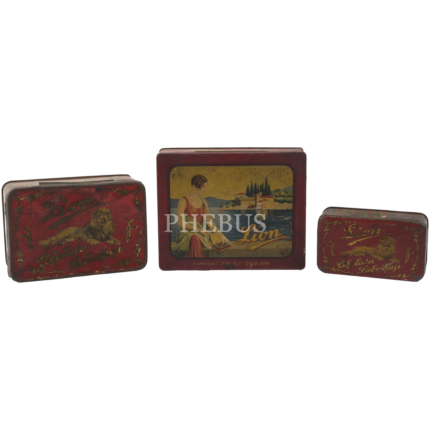 Lion Çikolata ve Bonbon Fabrikası tarafından üretilmiş; çikolata, bonbon, kakao tozu, pastil komprime gibi çeşitli ürün gruplarının büyük, orta ve küçük boy teneke kutuları ile "Lion Çikolata ve Bonbon Fabrikası" yazılı, son derece nadir bir mini masa lambası...