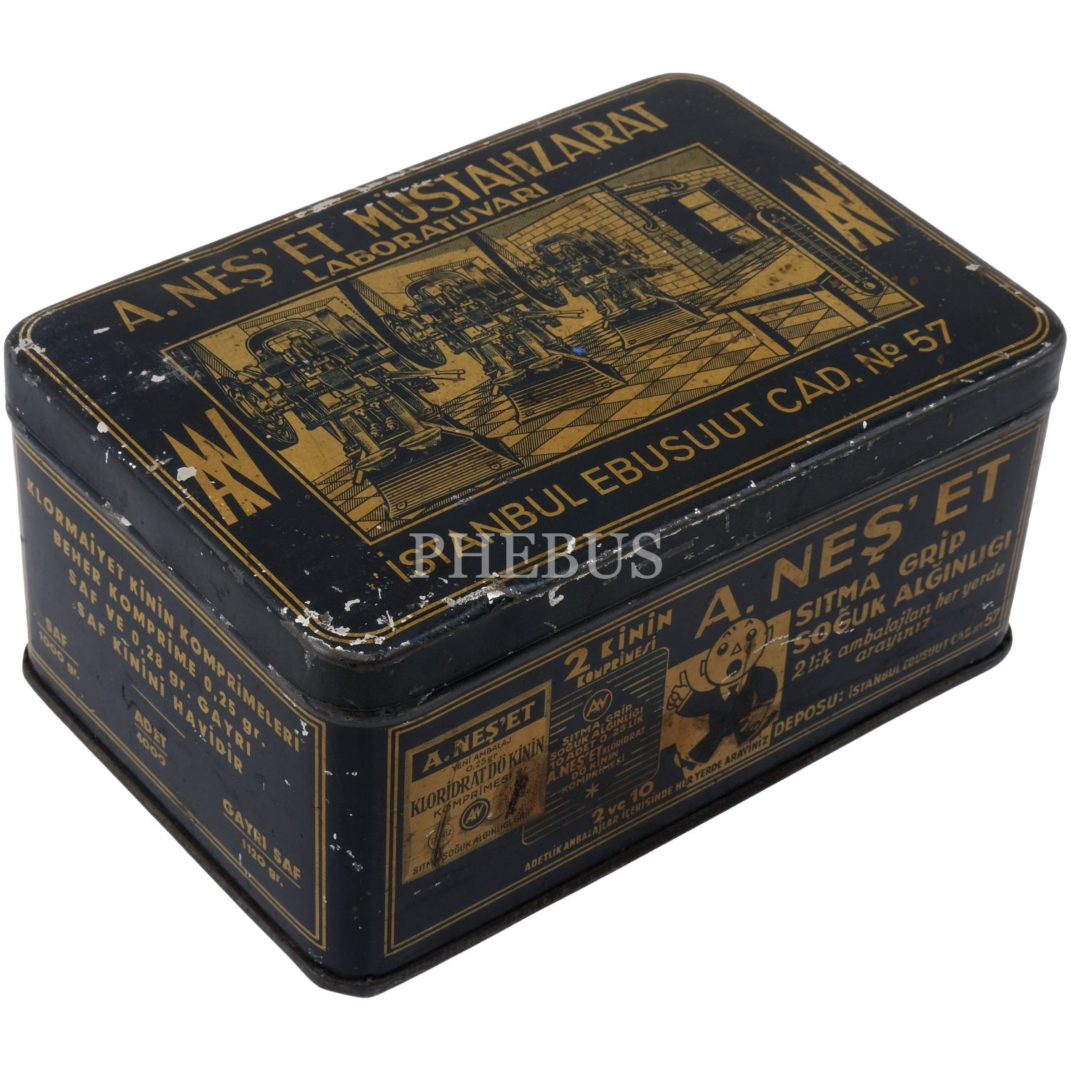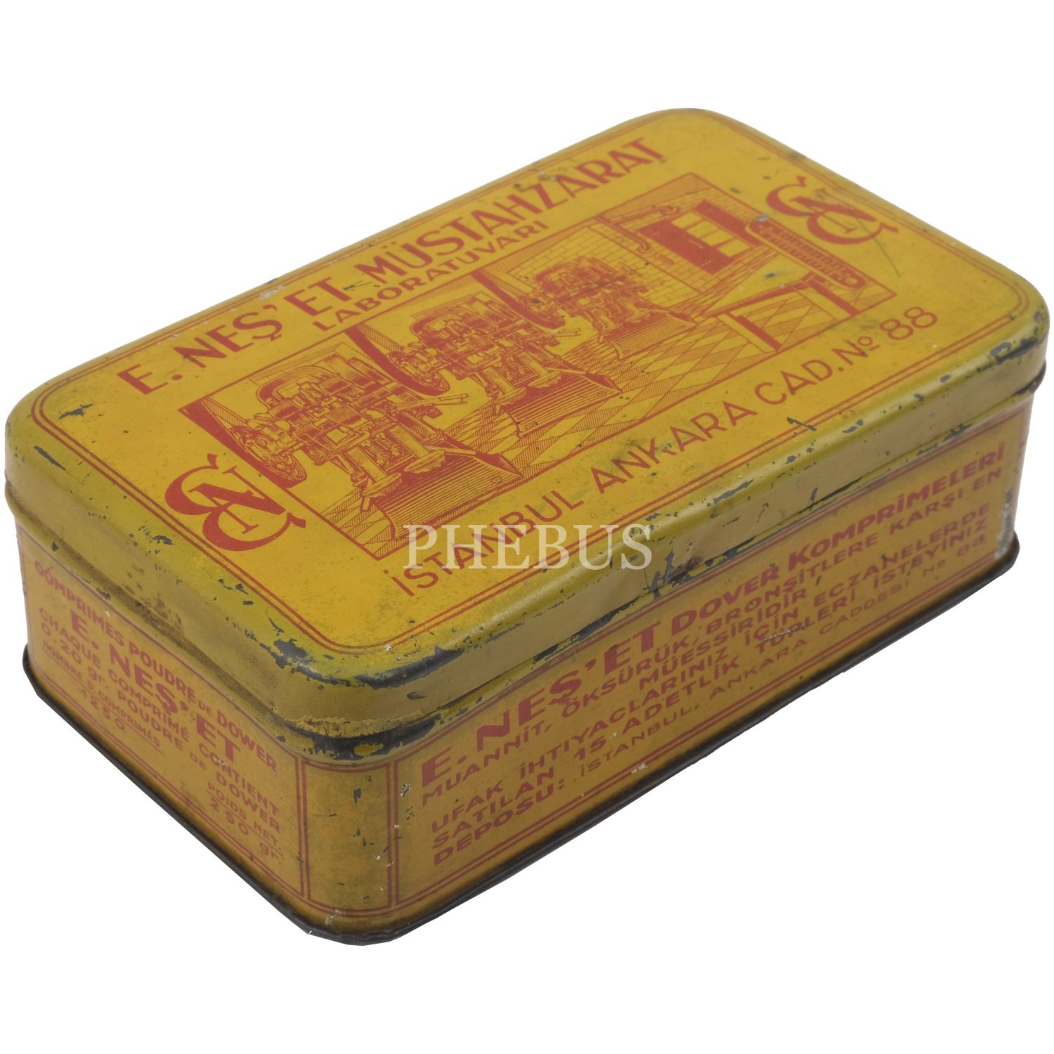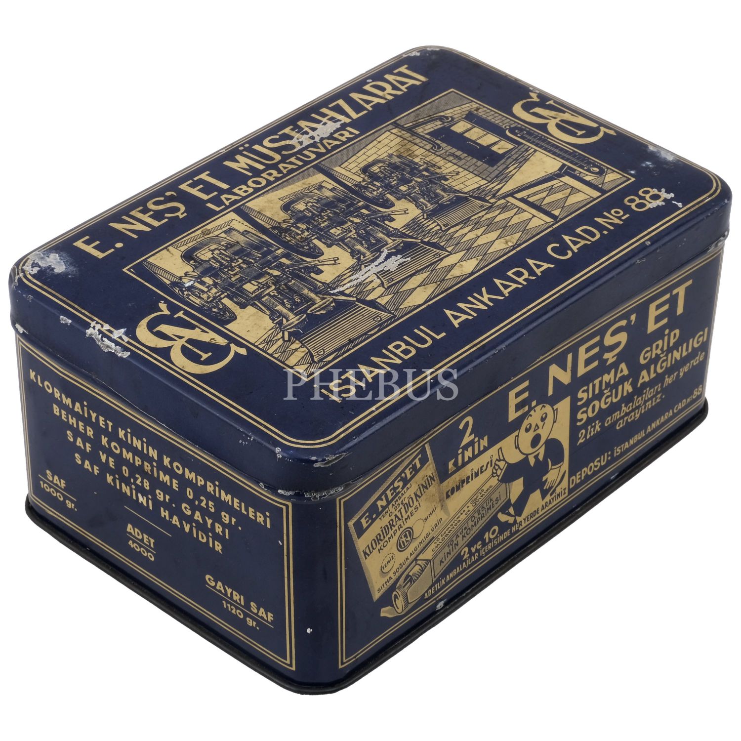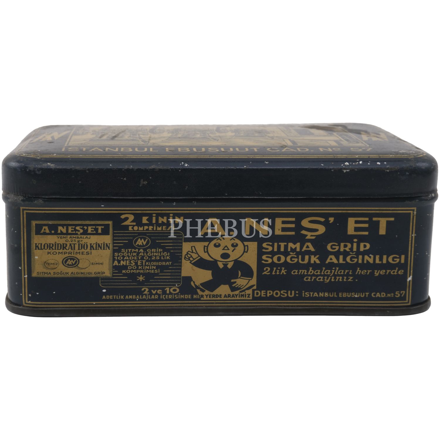 "E. Neş´et Kinin Komprimeleri: Asrımızın bütün fenni vesaitini haiz ve en son sistem makinalarımızla imâl edilen komprimelerimiz Avrupa mâmulatı fevkindedir. Bilhassa midede çabuk erimek hassası ve mıktarı tamam ve saf olması dolayısile şayanı tercihtir." Kutulardan üçü, "İstanbul Ankara Cad. No 88"; ikisi "İstanbul Ebusuut Cad. No 57" adreslidir. En büyük kutu 17,5x12x8,5 cm, en küçük kutu ise 9x5x3 cm boyutundadır.
